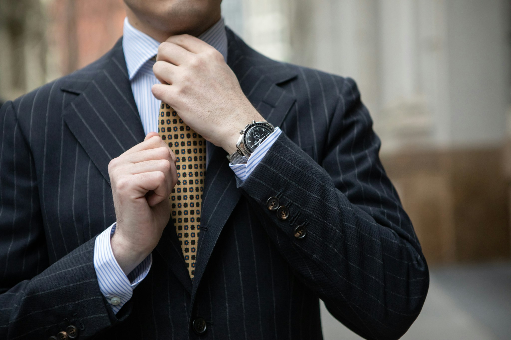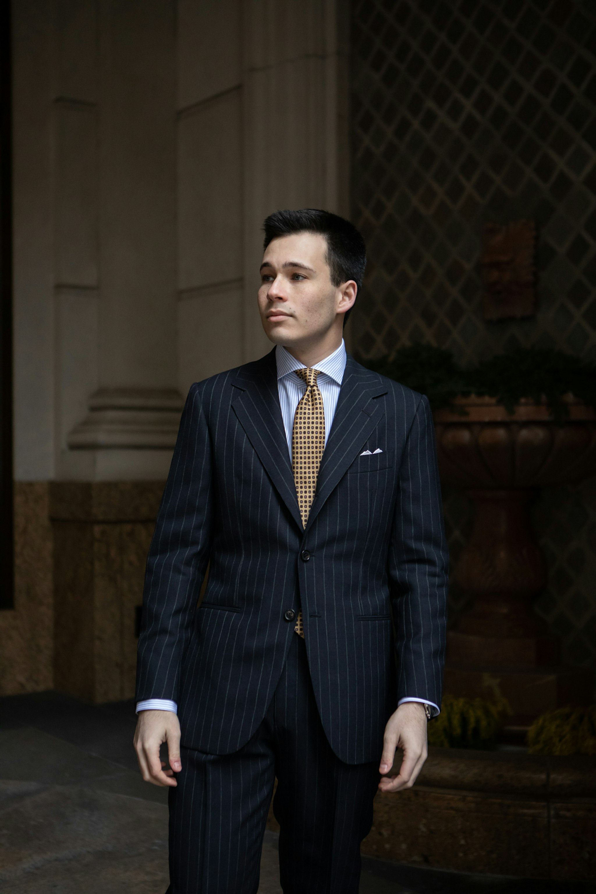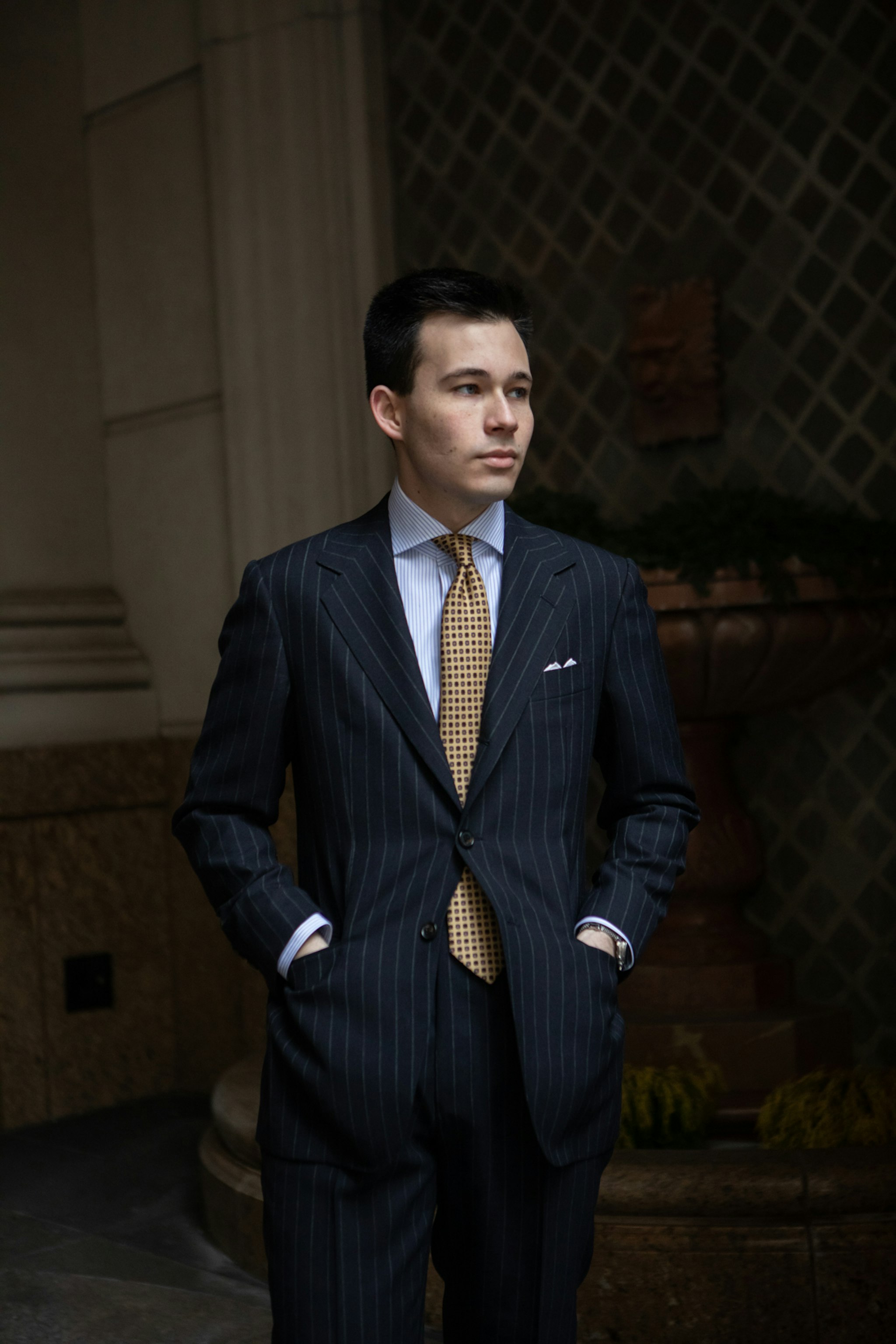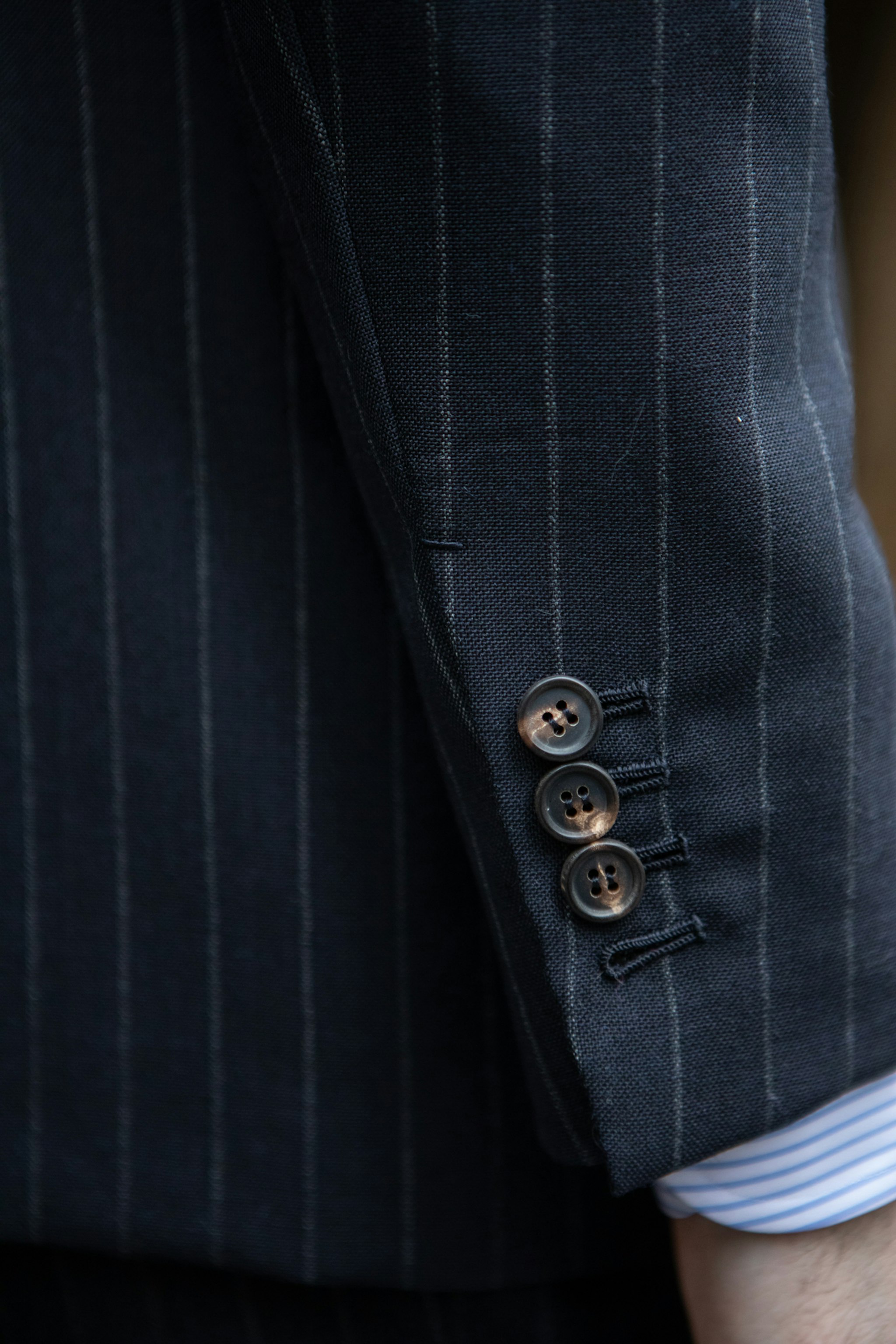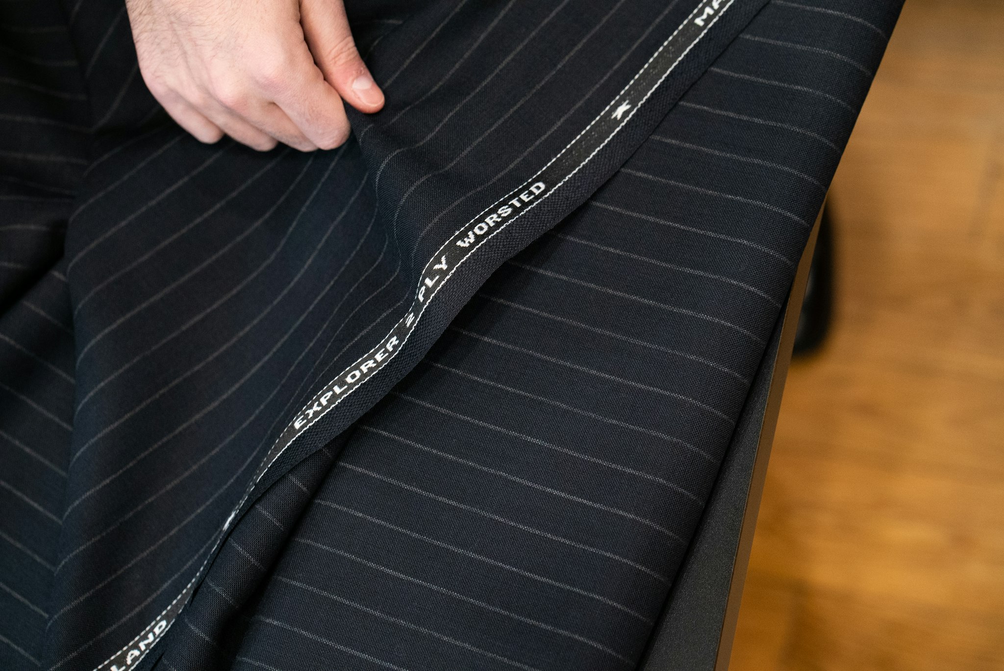 "For the past few years, I've had my eye on this bolt from our fabric archive. It's a high-twist from William Halstead, an old British mill known for their crisp, dry cloths. The base is dark navy with an almost cream chalk stripe, which is hard to come by. The result is a suit that will wear well through the warmer months. I adapted the pattern a bit to include an even higher waisted trouser paired with a strong extended shoulder."