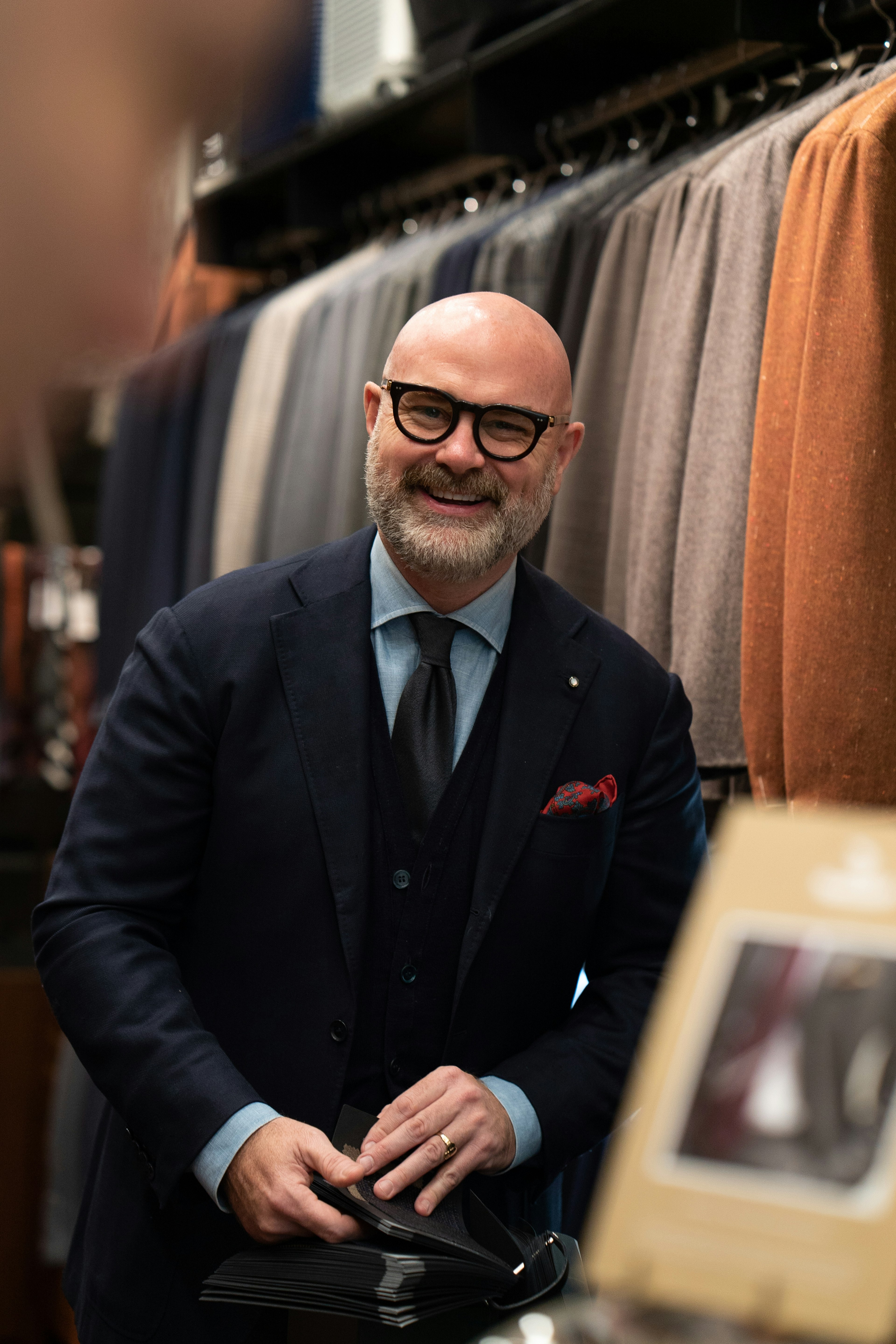 "Looking through my wardrobe, I discovered that I somehow didn't own a navy blue suit! The launch of the new Model 101 was the opportunity to remedy that. A midweight navy worsted flannel in a twill, slightly lustrous and durable, is my ideal cloth. I opted for flap pockets but like to keep them tucked in. It makes me feel like Marcello Mastroianni!"