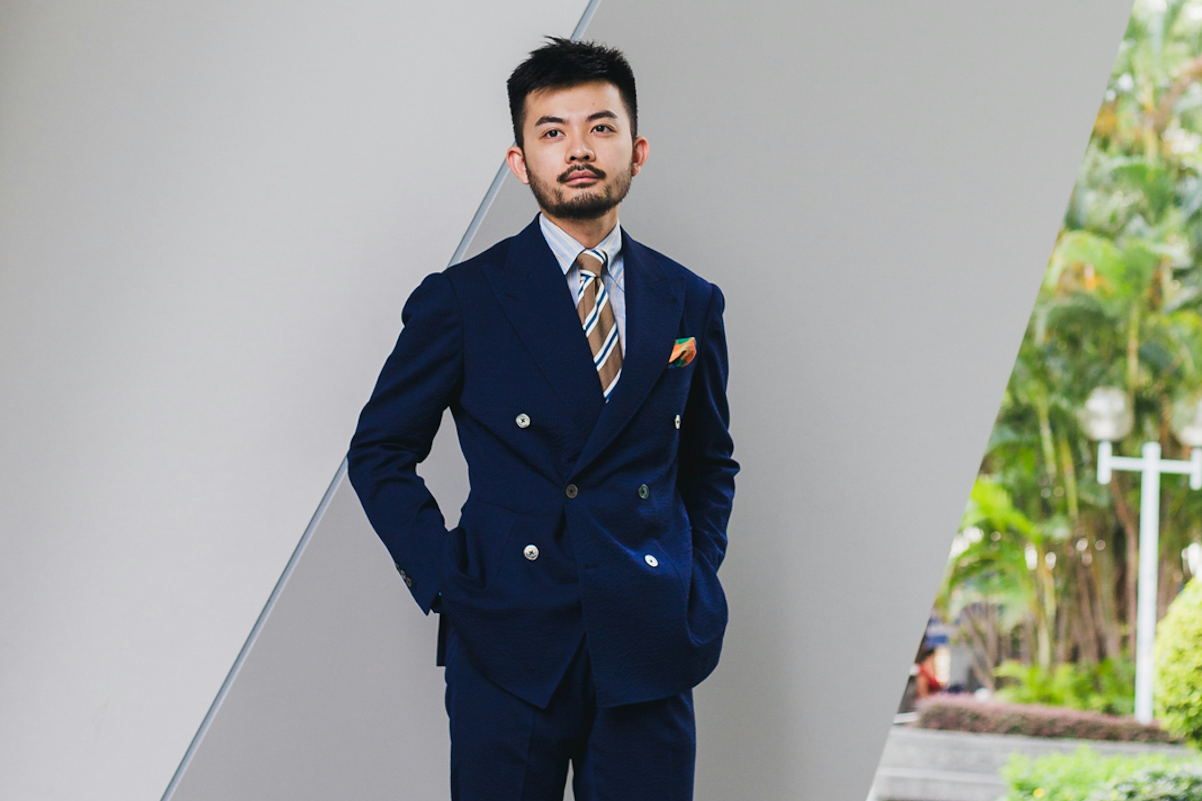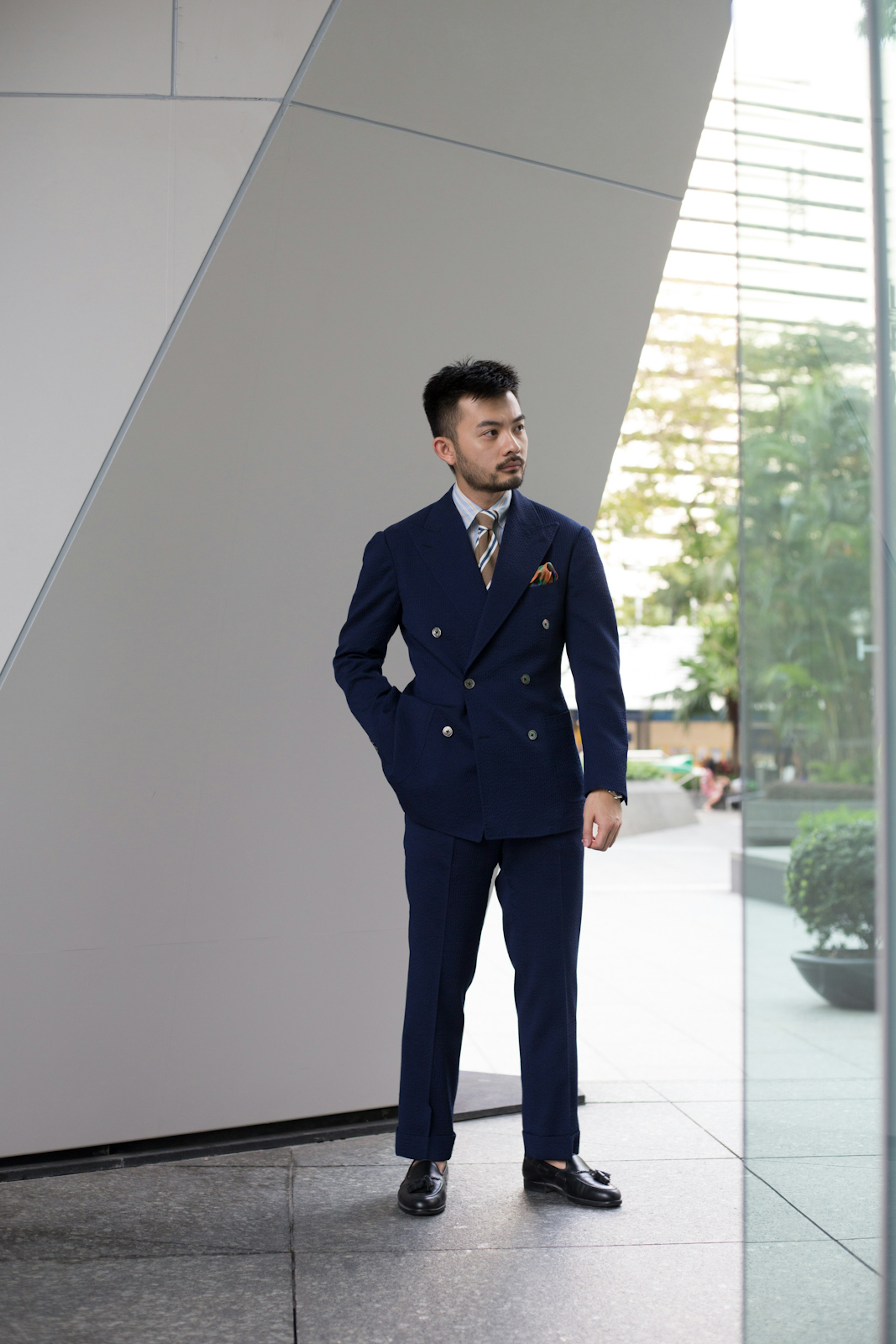 This is one of our favorite suiting fabrics from VBC, the four-ply wool. The high-twist yarn makes it a perfect cloth for Hong Kong’s warm weather. As a four-ply weave is a slightly heavier it provides a nice drape to the suit. I also like the idea of having a heftier cloth made with Ueki san’s soft tailoring, which gives a structured, comfortable fit. In terms of color, I went for a monotone palette to emphasize the different patterns.