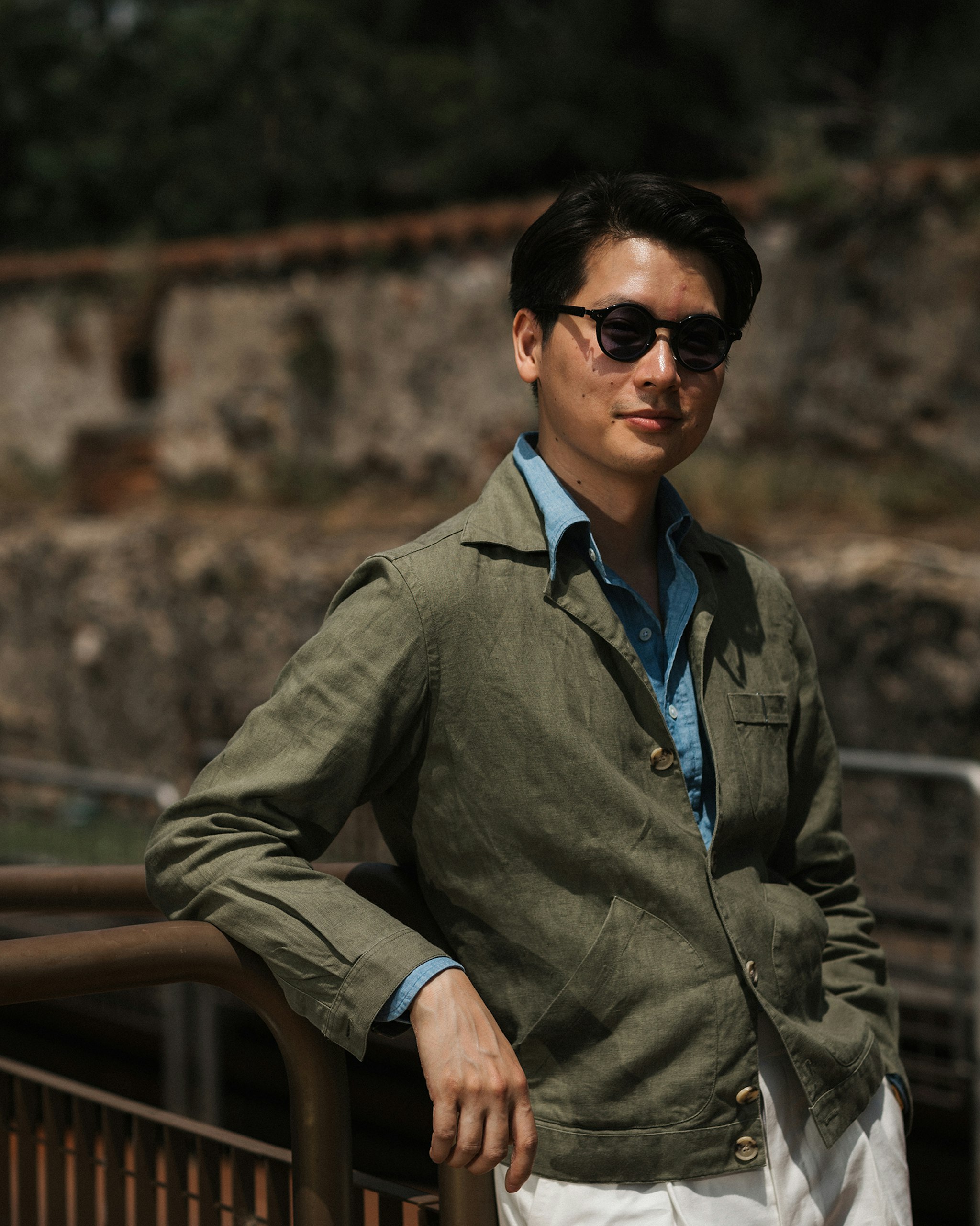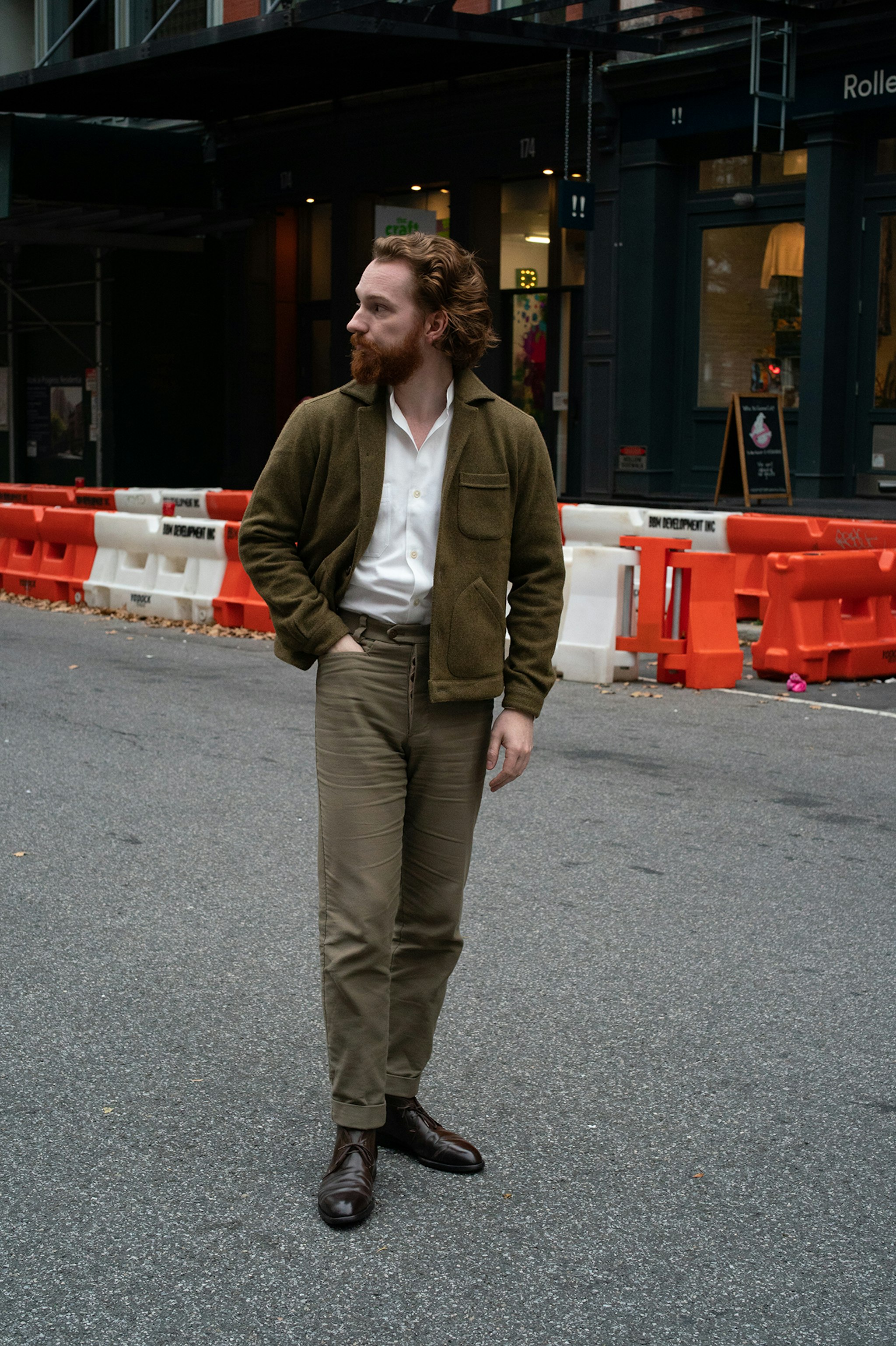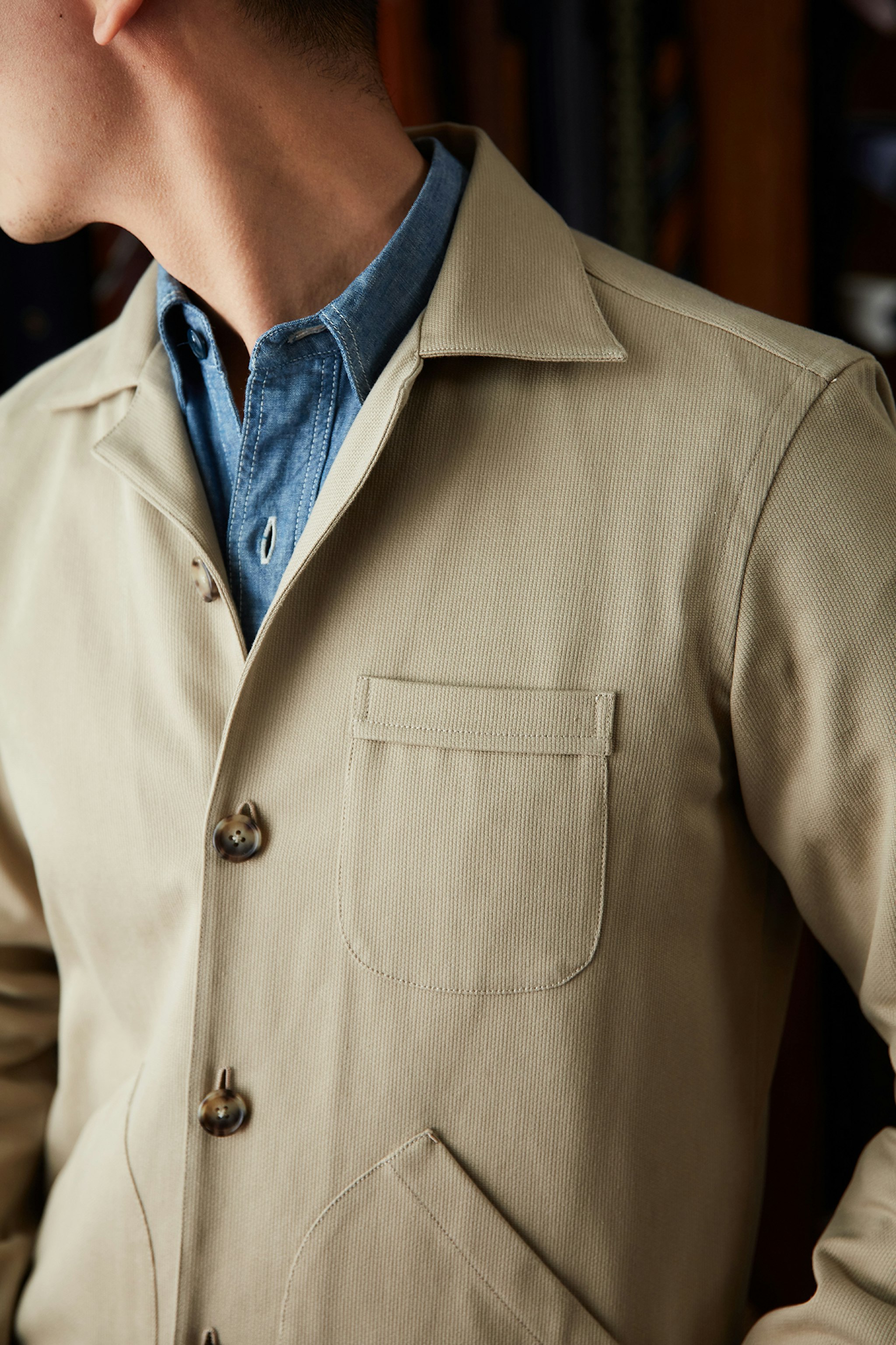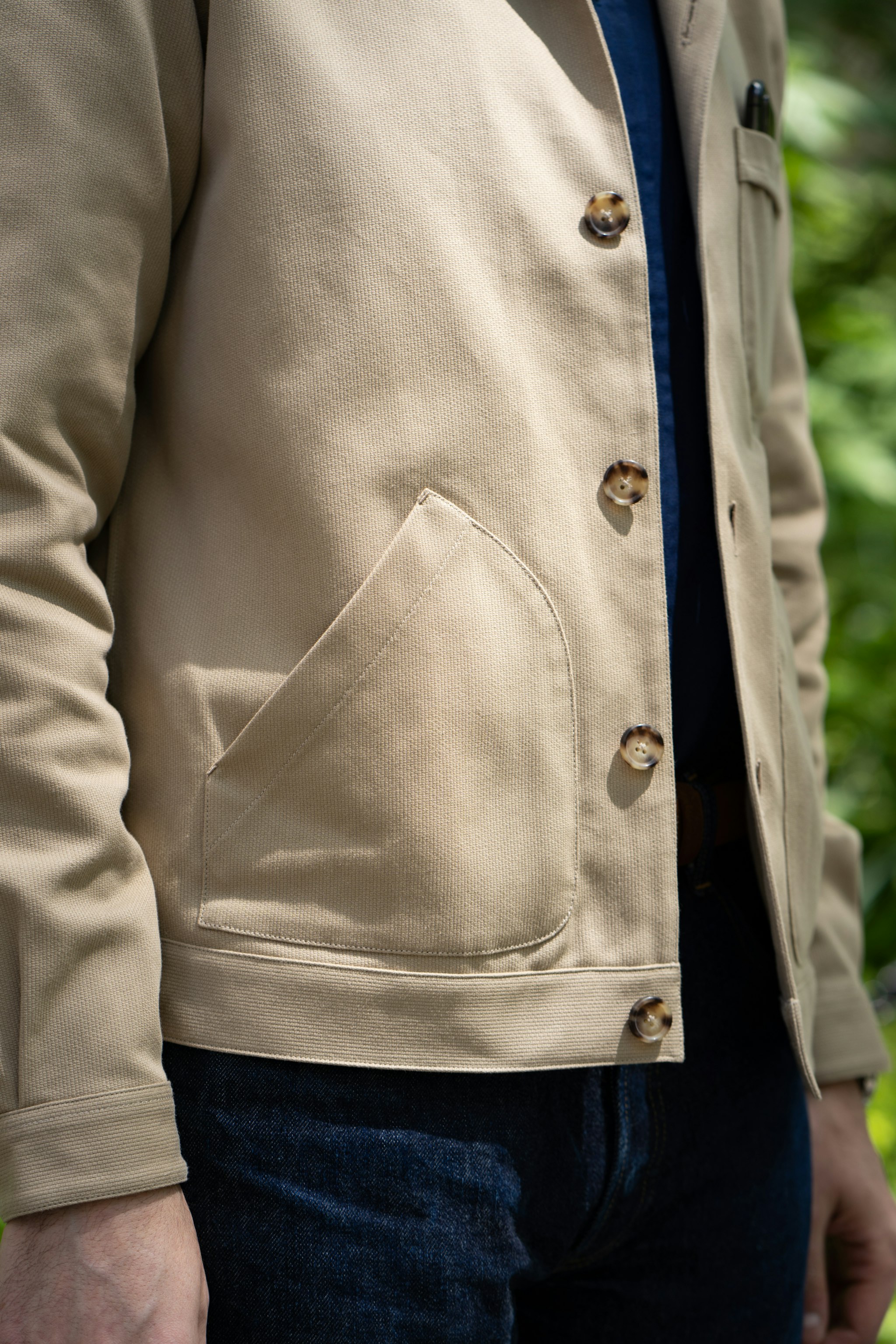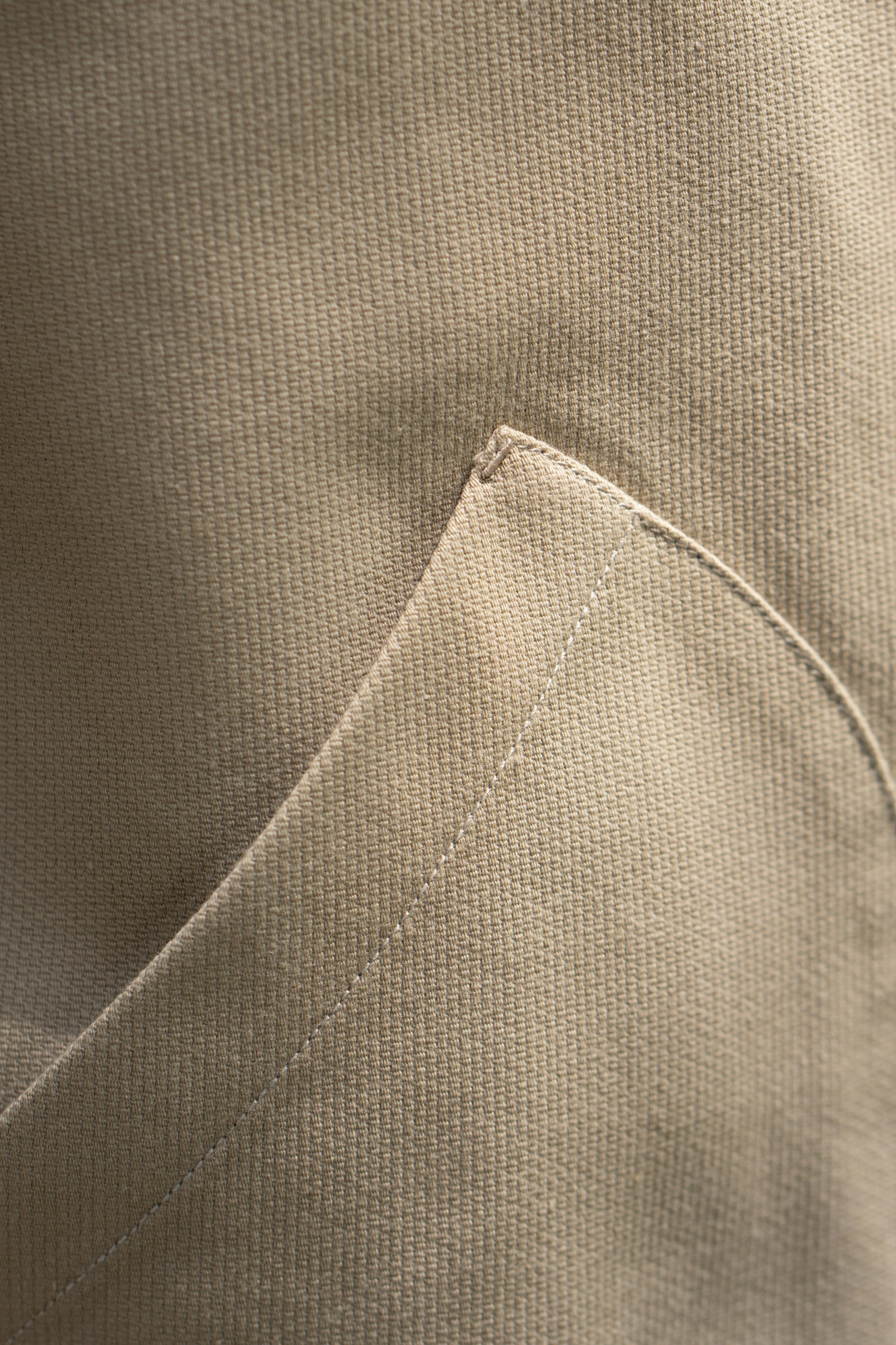 We sourced this khaki cotton in Japan. We particularly liked it’s tough and unusual texture, the fabric has a lot of body which will soften over time like a pair of good jeans.