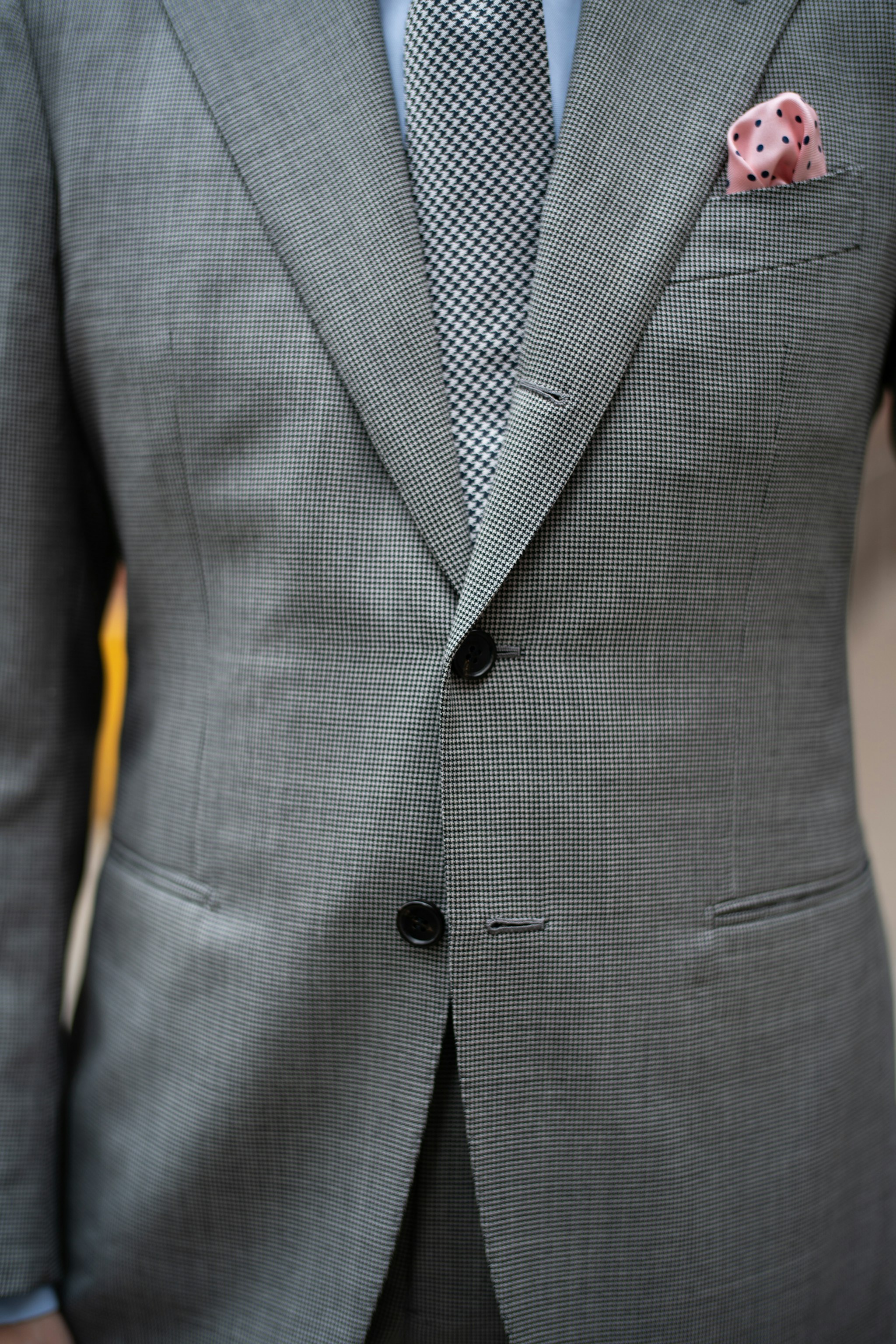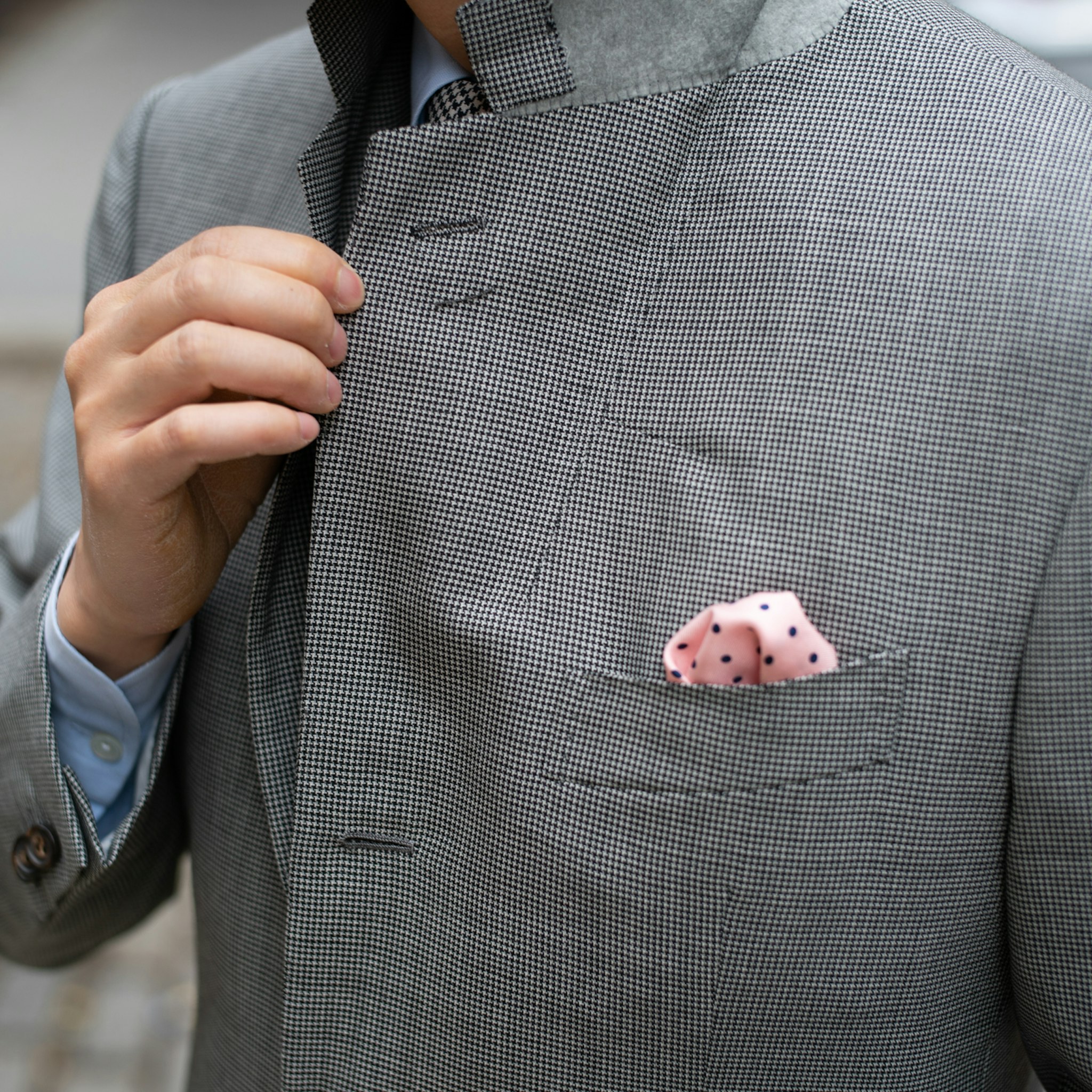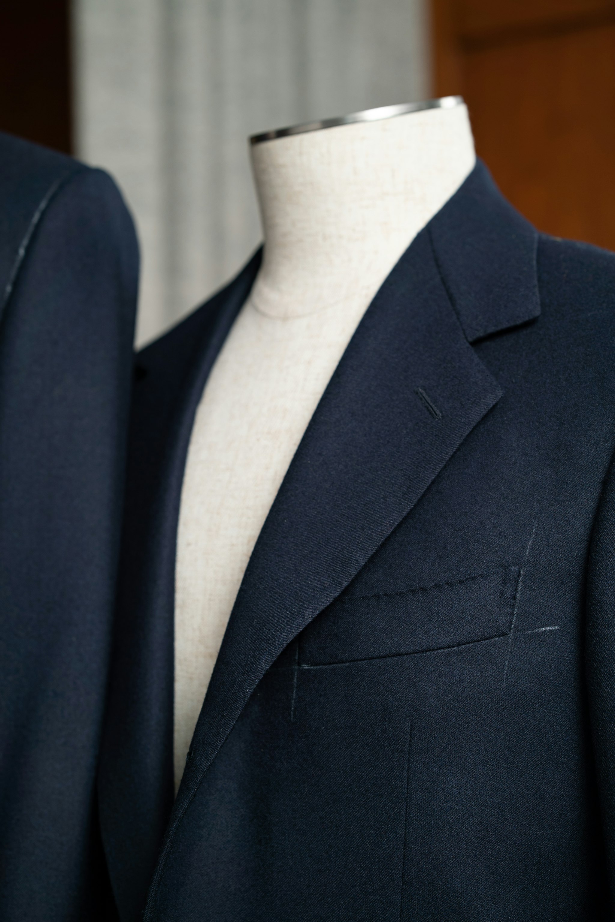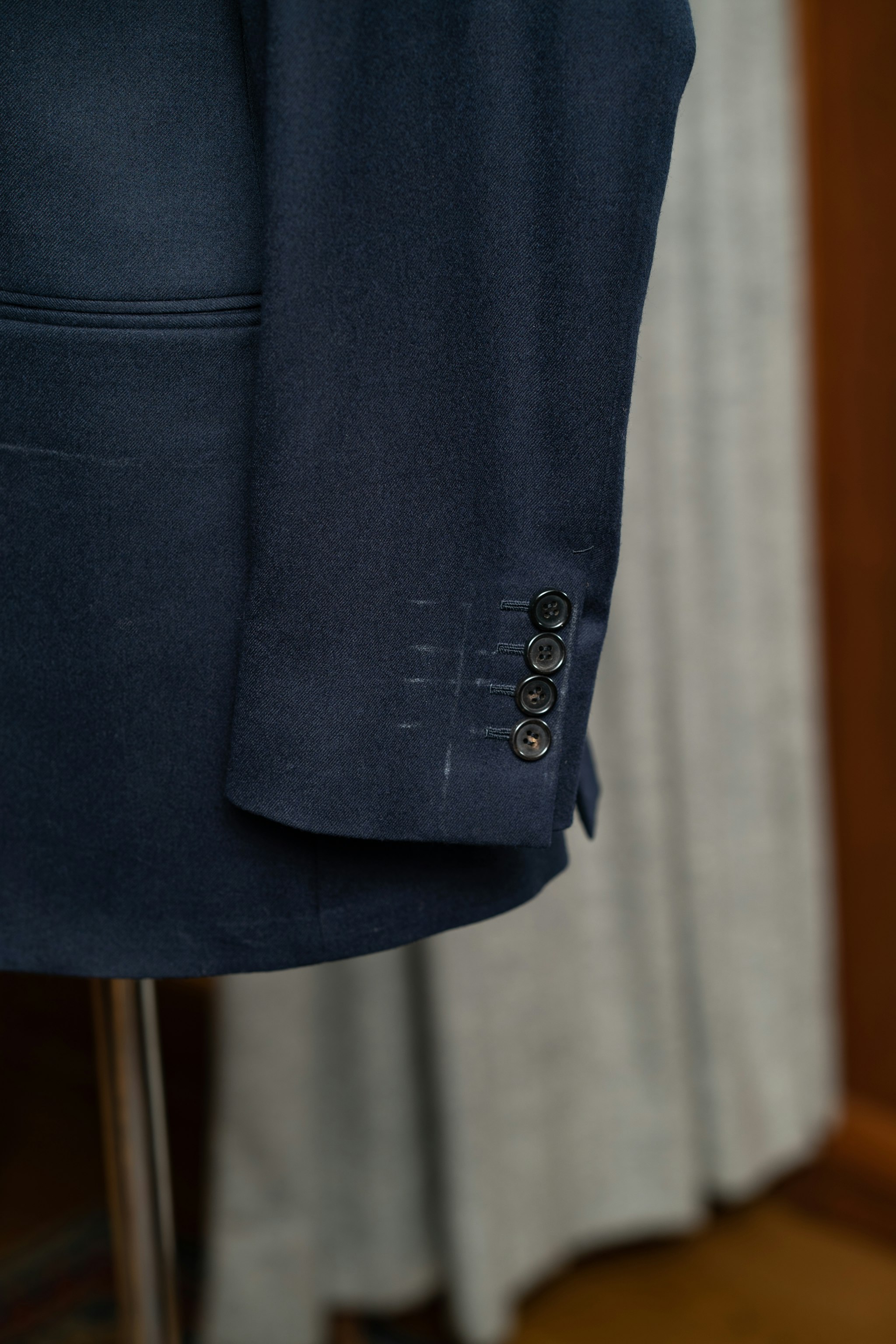 Our take on the continental cut looked for inspiration in Northern Italy, France and the UK, places where a little more structure in a jacket is welcome. The shoulders of the jacket are moderately padded and provide a more defined shoulder line. The collar of the jacket has a strong, square shape which leads to a long, straight lapel. The buttoning point sits slightly above the natural waist, with a mild cutaway to the quarters beneath. Despite our emphasis on structure, the chest is soft and pliable.