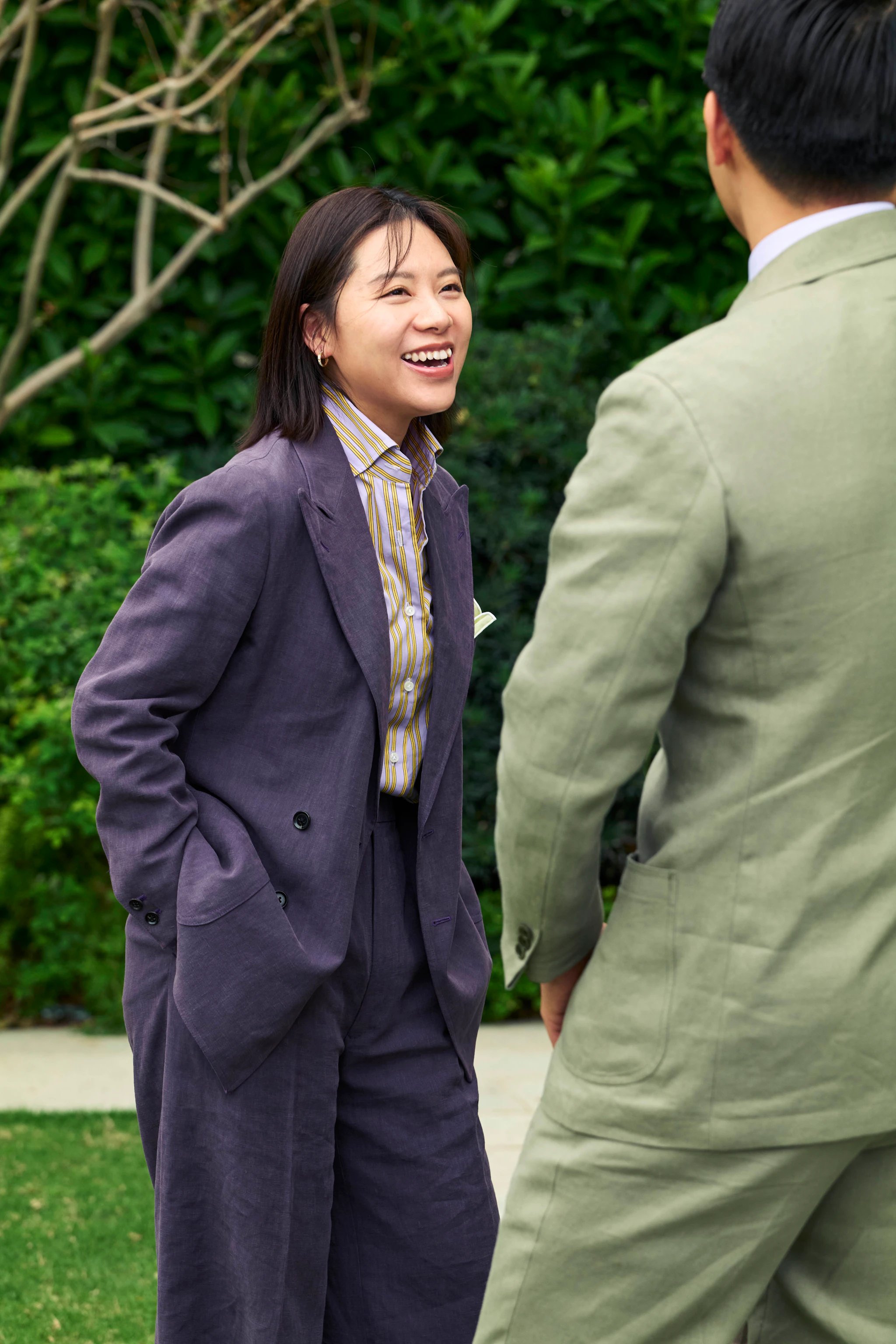 Sam in our Linen Model 3 Suit, a Cotton-Linen Button-Down Polo and Tie Your Tie Pocket Square.