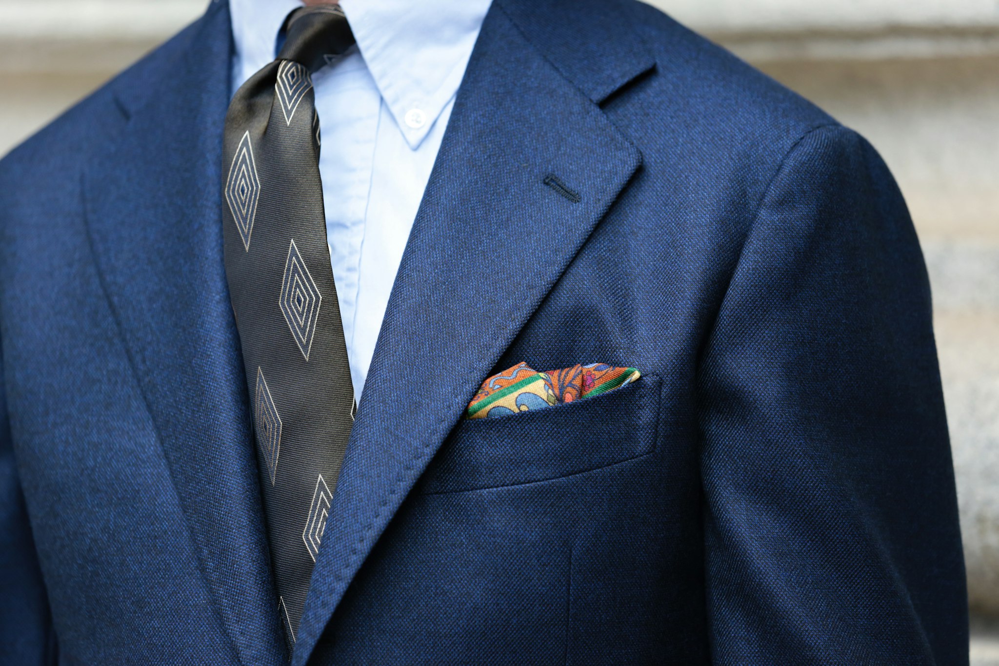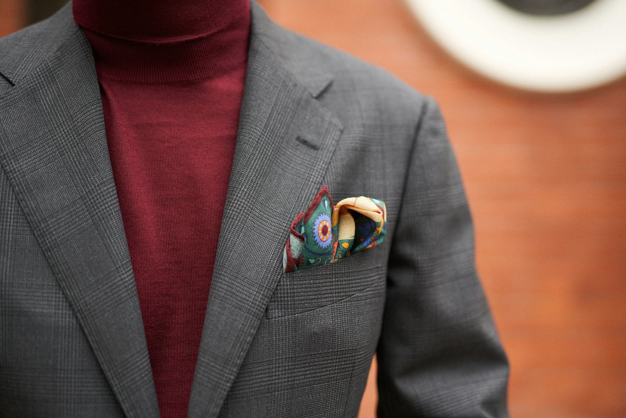The chest pocket is cut straight, contrasting those of the softer neapolitan makers, fitting in with Florentine tailors. The pocket is angled downwards, and lowered to match the slightly lowered gorge line.