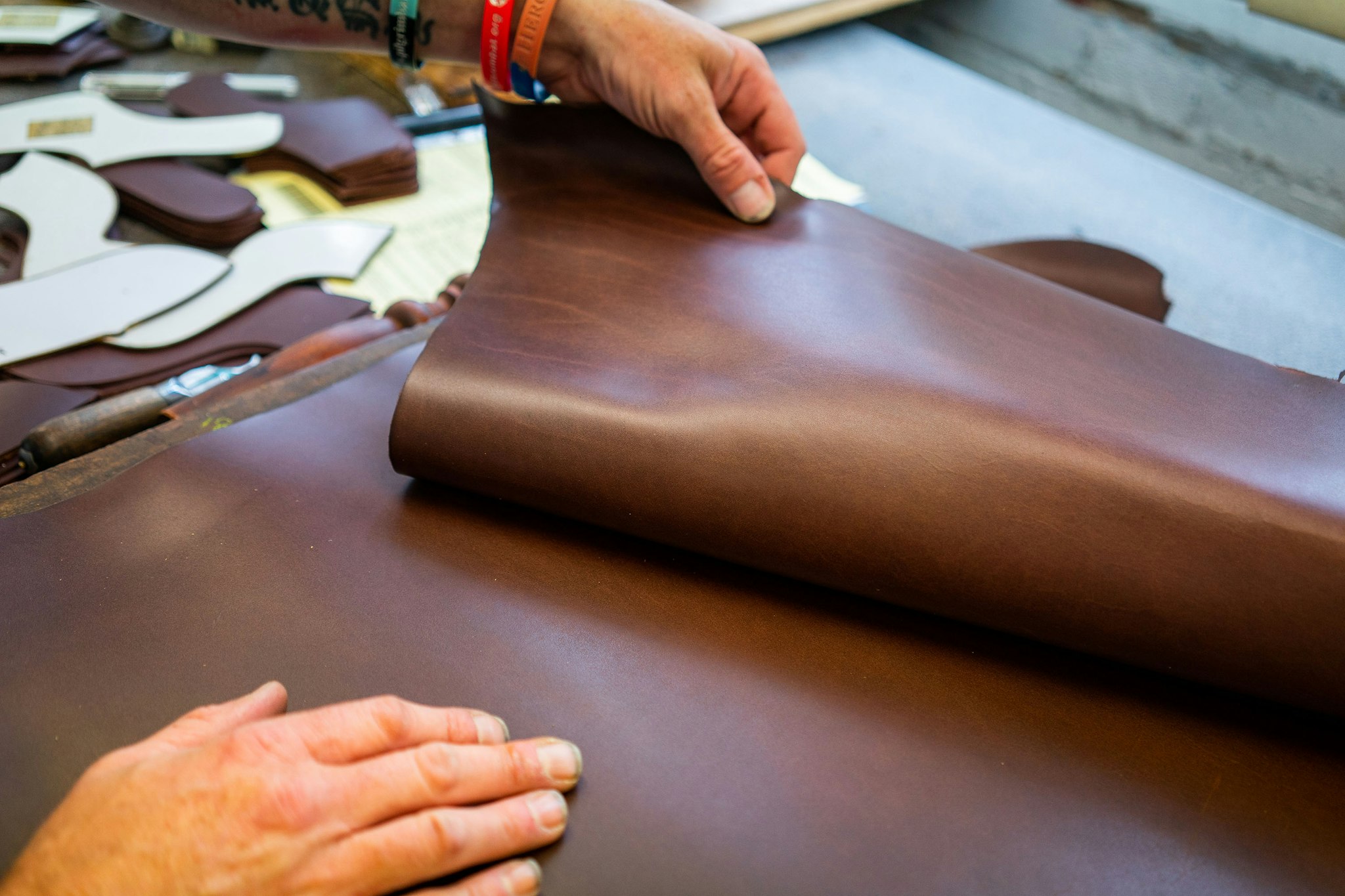 Our calf leathers are sourced from the 150 year old Weinheimer-Leder tannery in Germany. They have excellent qualities and with a little attention can hold a high shine.