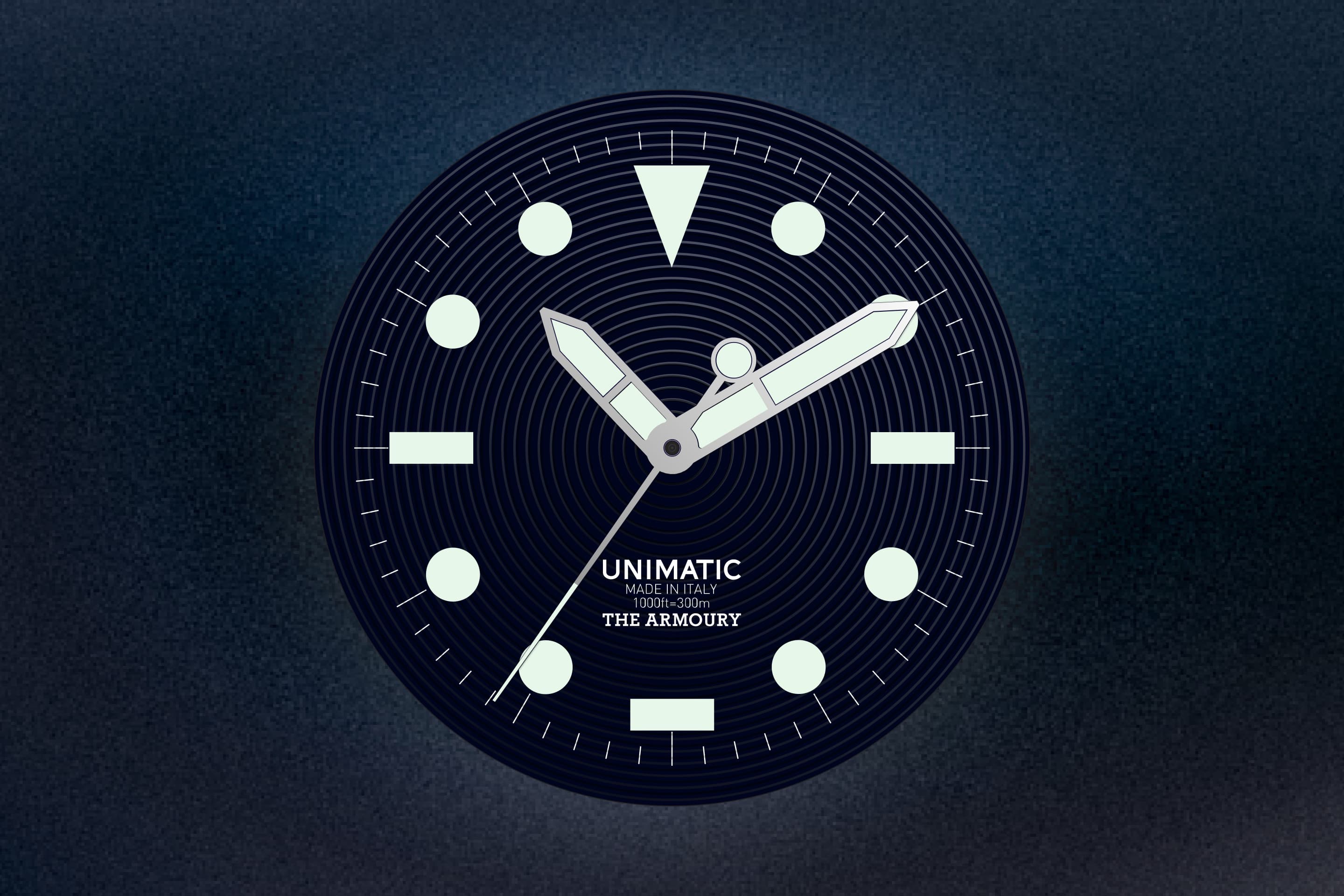 The Modello Cinque U5S-TA ‘Blu Notte’ watch is a collaboration between Unimatic and The Armoury. This timepiece, the first collaboration between the two brands, merges Unimatic’s distinctive design with The Armoury’s timeless aesthetic.