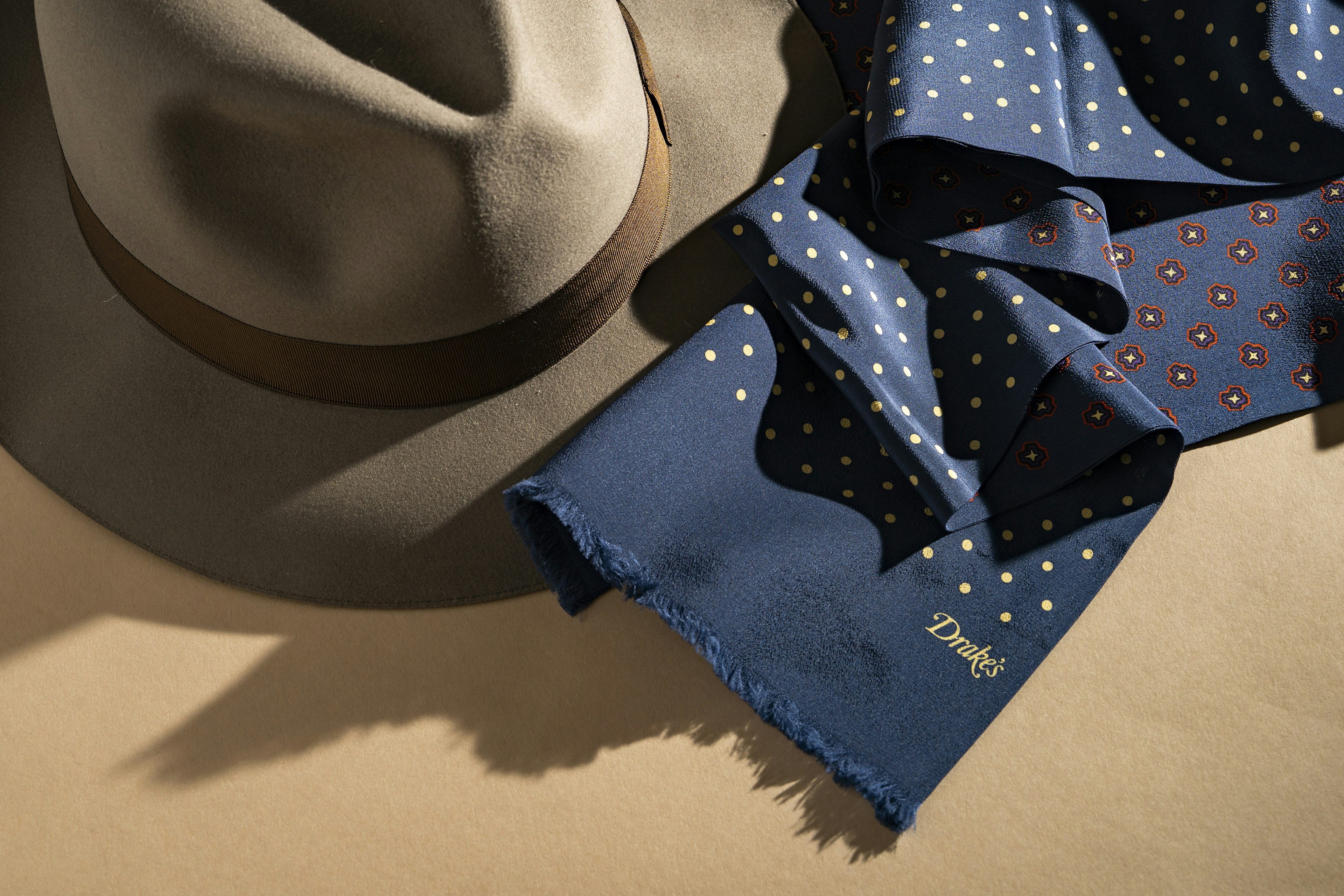 The Armoury’s own Fedora is a result of many years of research and testing. Made in Italy, from a luxurious beaver fur felt, it features a 3 inch brim and comes unblocked, allowing the wearer to shape the crown however they wish. This season we’ve gone with a heavier beaver felt, providing added warmth and stability. The reversible scarf is a classic design which Drake’s do so well.