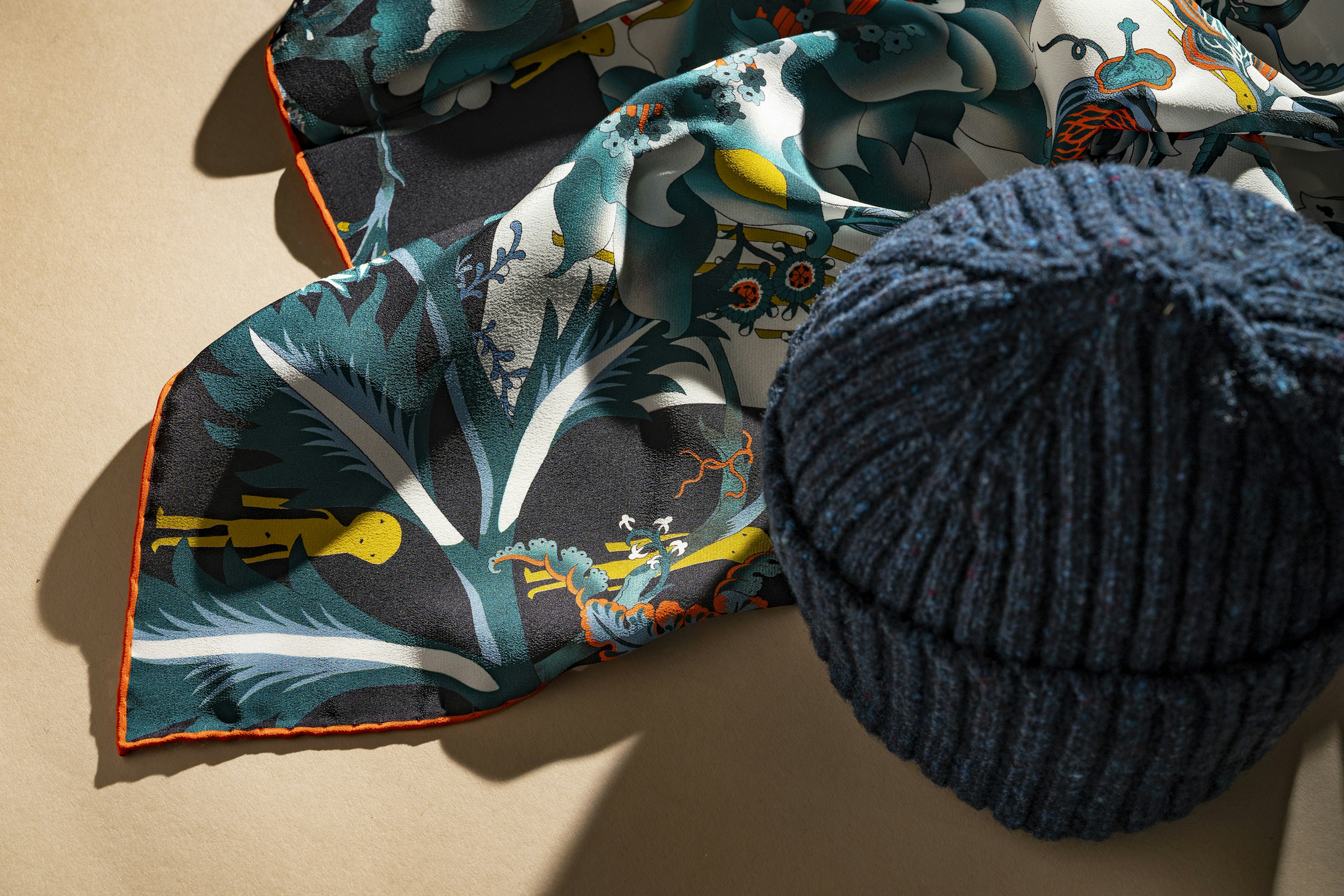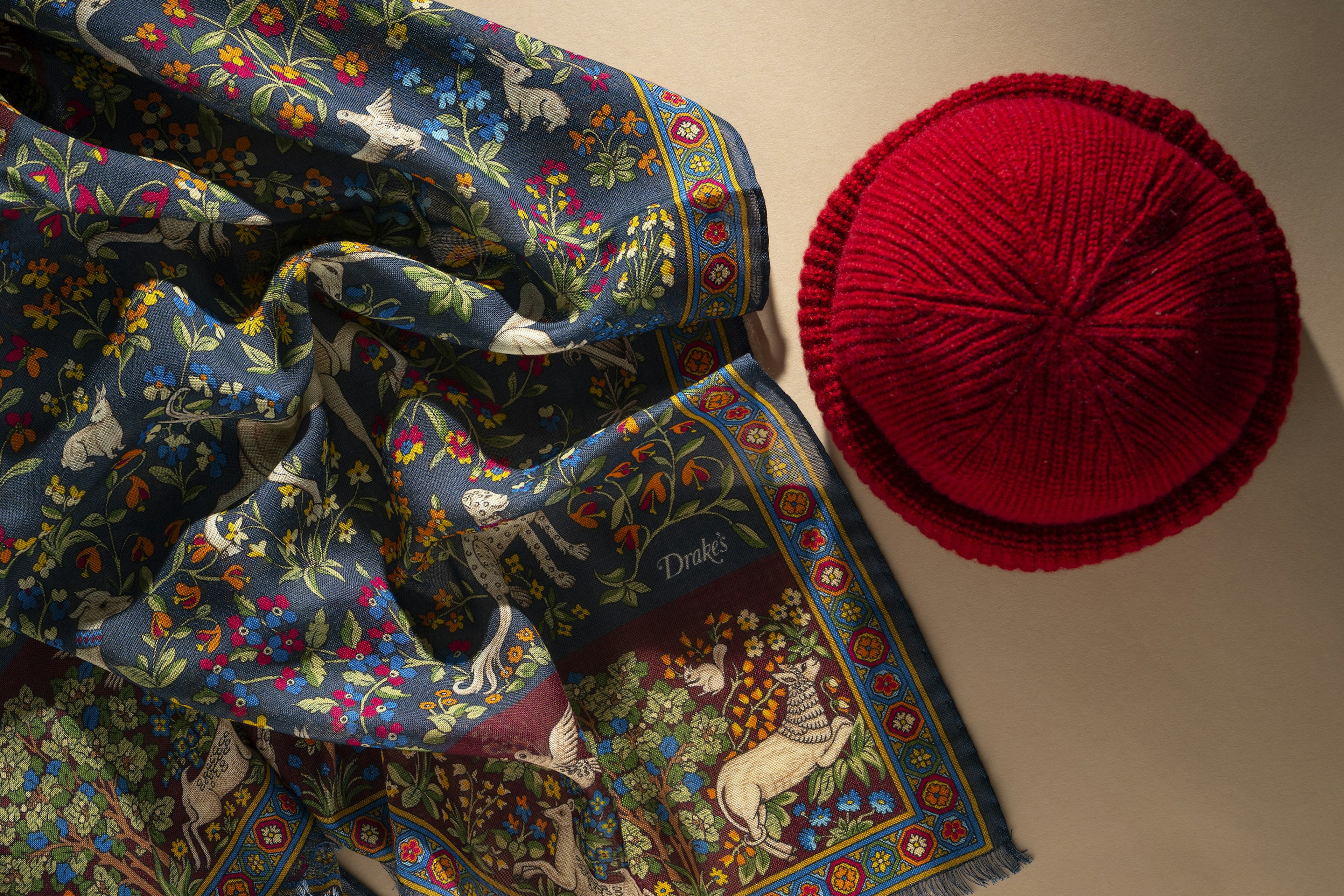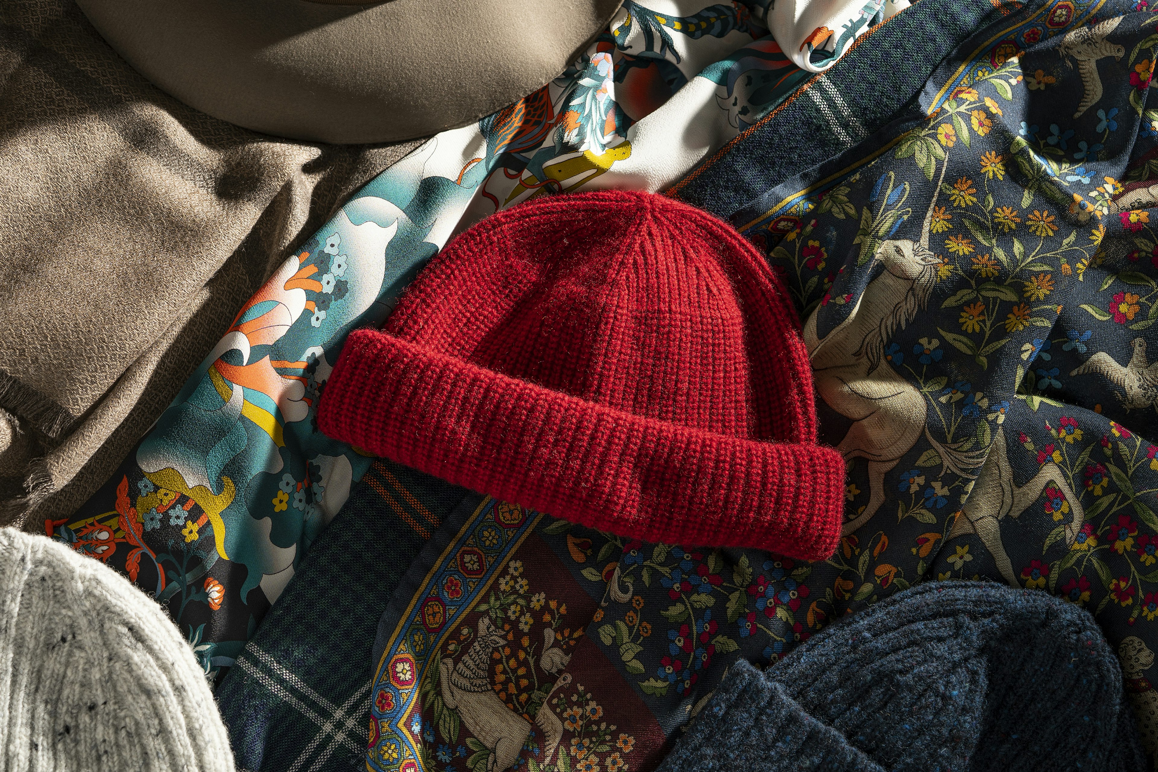 Inspired by Steve Zissou’s iconic red cap, we created our version in several colors. With their nautical or workwear-inspired design we suggest wearing it rolled up high. We also like to add a bit of pattern where possible so picked a Drake’s Mythical Forest print too.