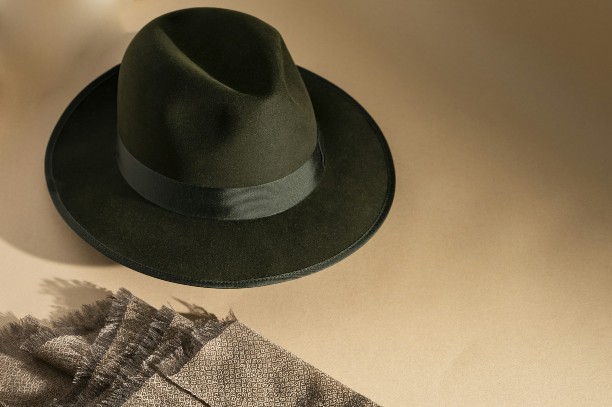 The tones and details of this pairing are subtle. As well as the bound edge this fedora features an elasticized lapel keeper, an old school detail that safeguards your hat from flying away in high winds. The Andreas 1947 cashmere scarf is exceptionally light but provides excellent warmth.