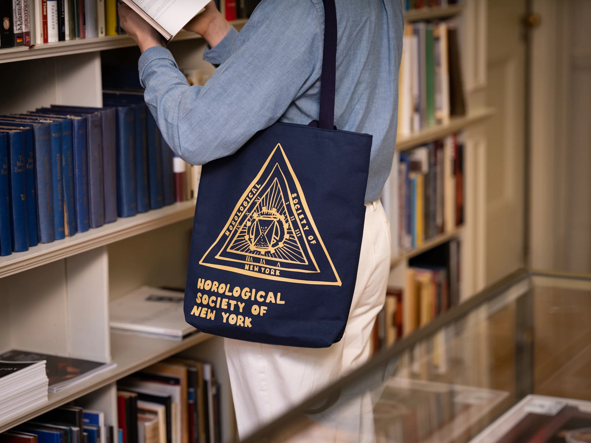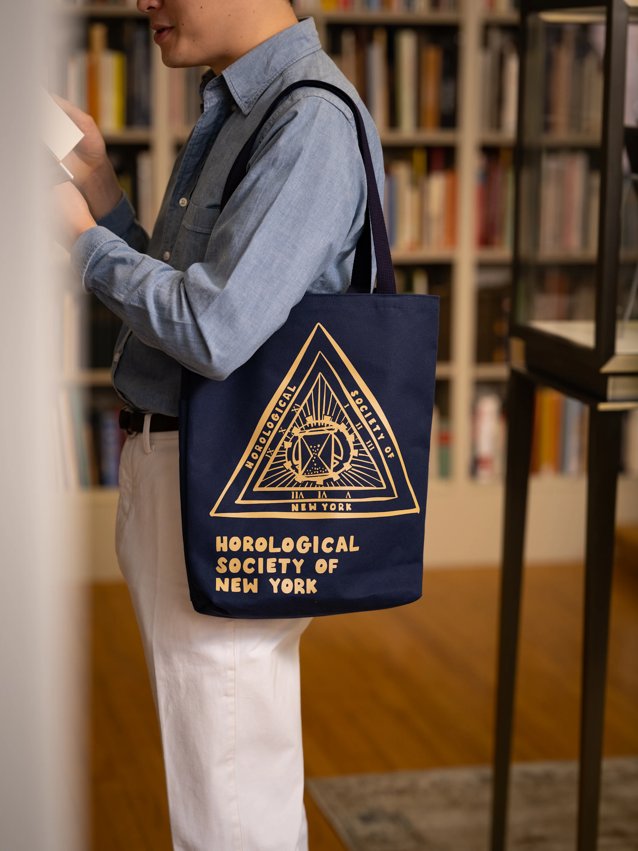 A Silver membership to HSNY features The 44th Street Tote, designed in a heavy-duty cotton canvas material and manufactured in Japan. The navy tote depicts a playful version of the iconic HSNY logo in gold, multiple pockets (perfect for carrying HSNY complimentary magazine subscriptions), and short and long straps for maximum comfort and versatility.