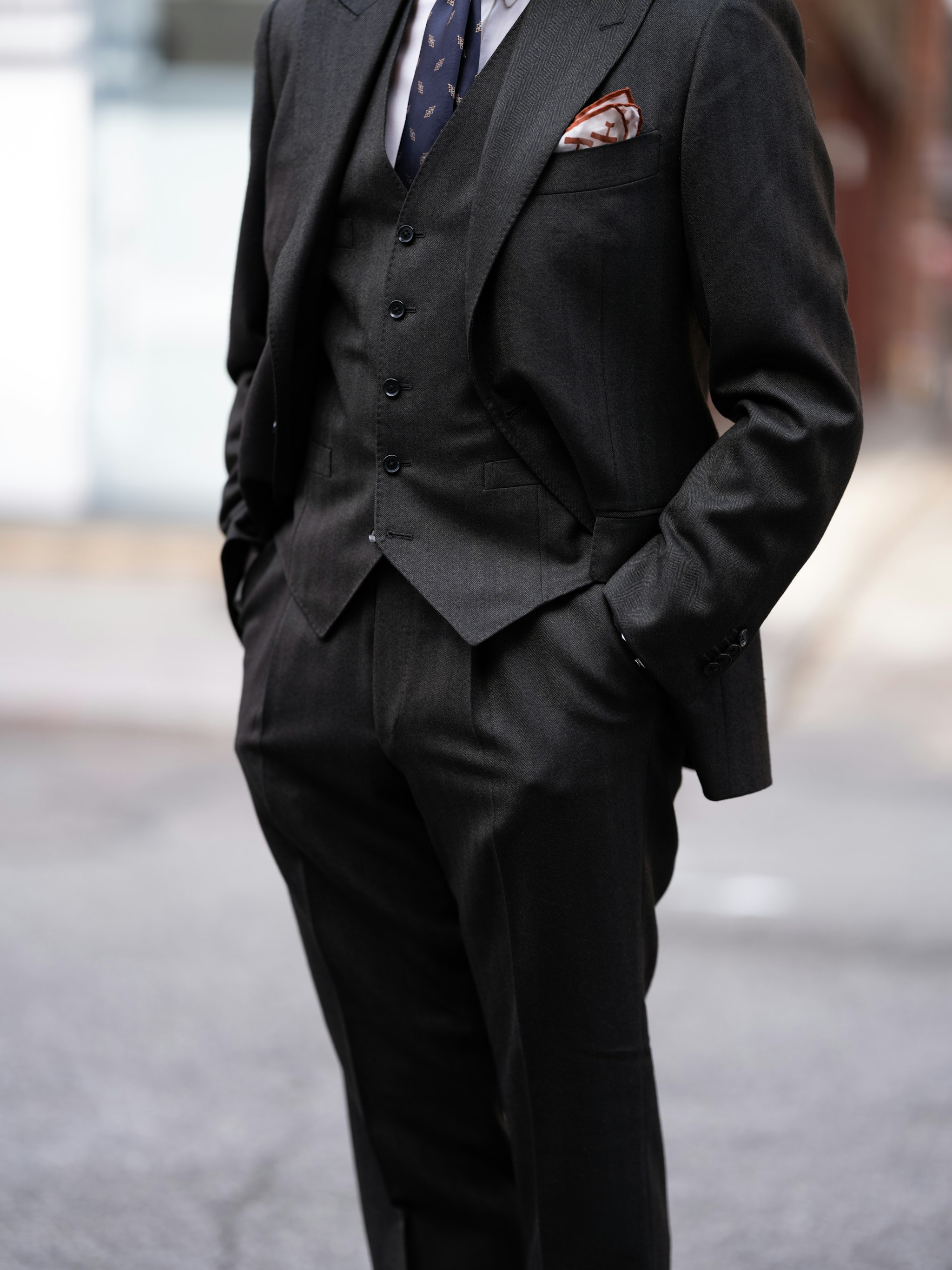 Found in Standeven's 'Heritage Twist' bunch, this dark green herringbone is the second single button suit in this collection. Primarily used as our Tuxedo Model, this jacket can be made in a range of cloths, and pairs well with our vest for a 3 piece suit.