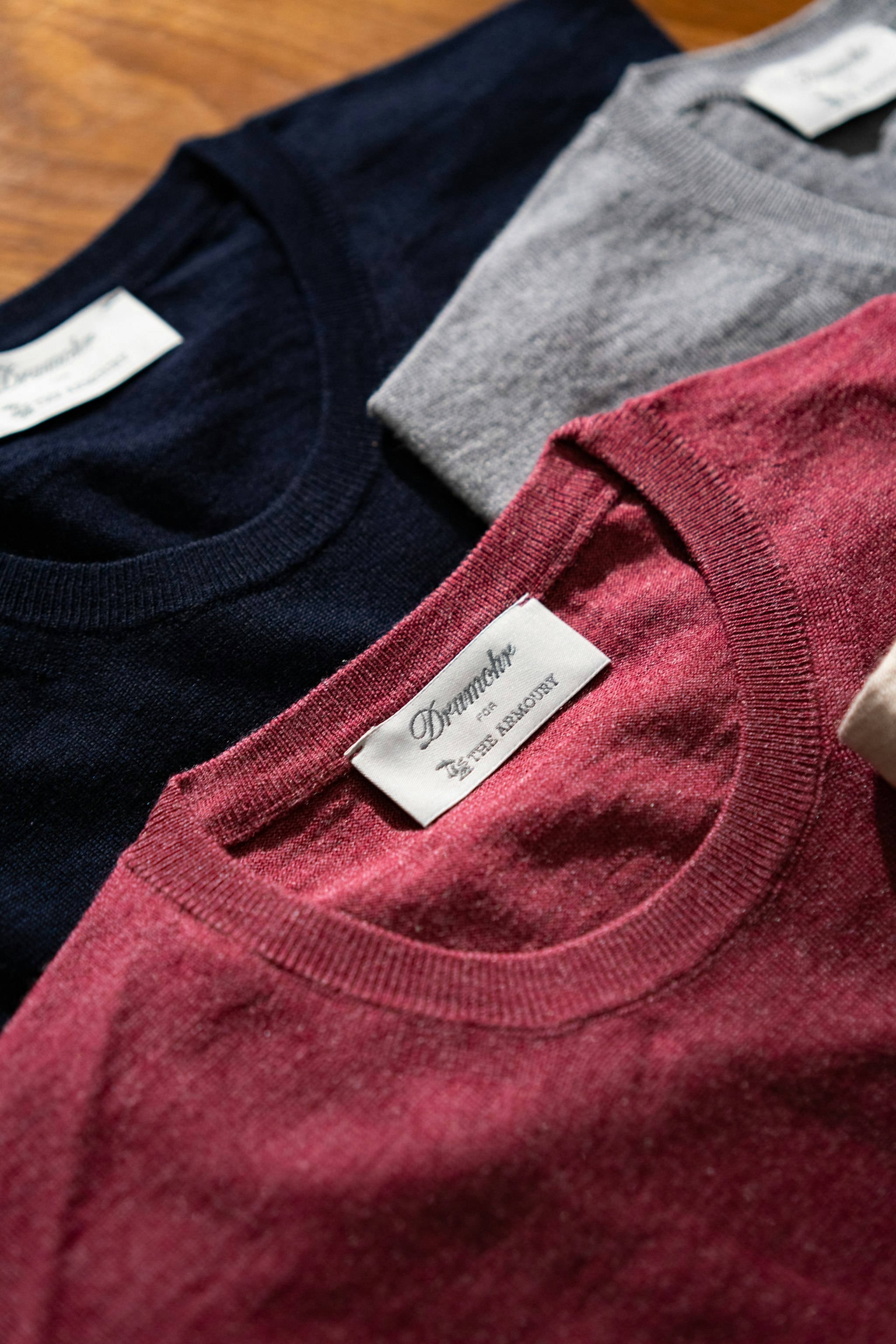 We developed our own line of knitwear in partnership with a historic Scottish mill. Each of our designs is exclusive to The Armoury, featuring specific details and refined fit which make them the perfect compliment to tailoring and casual outfits.