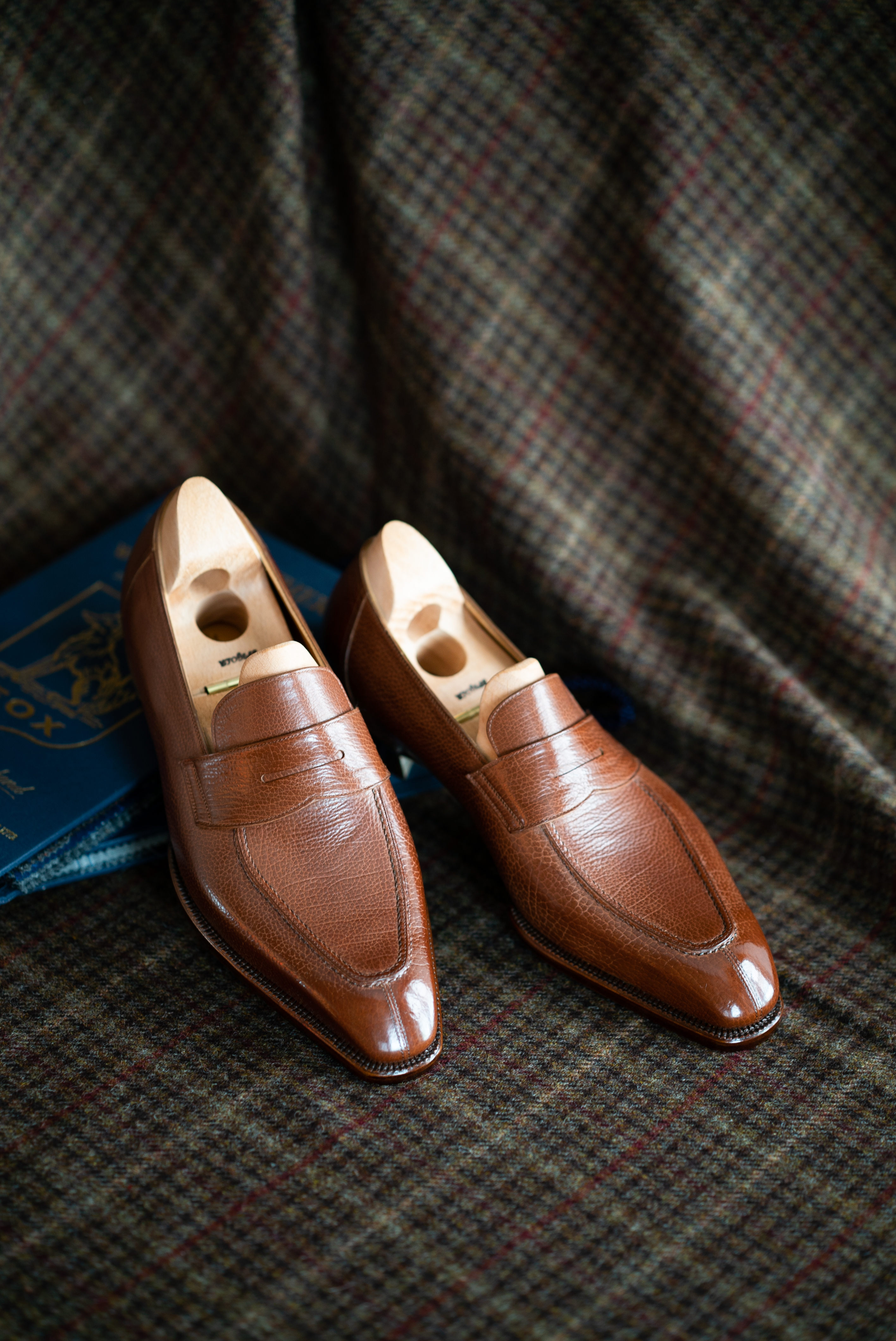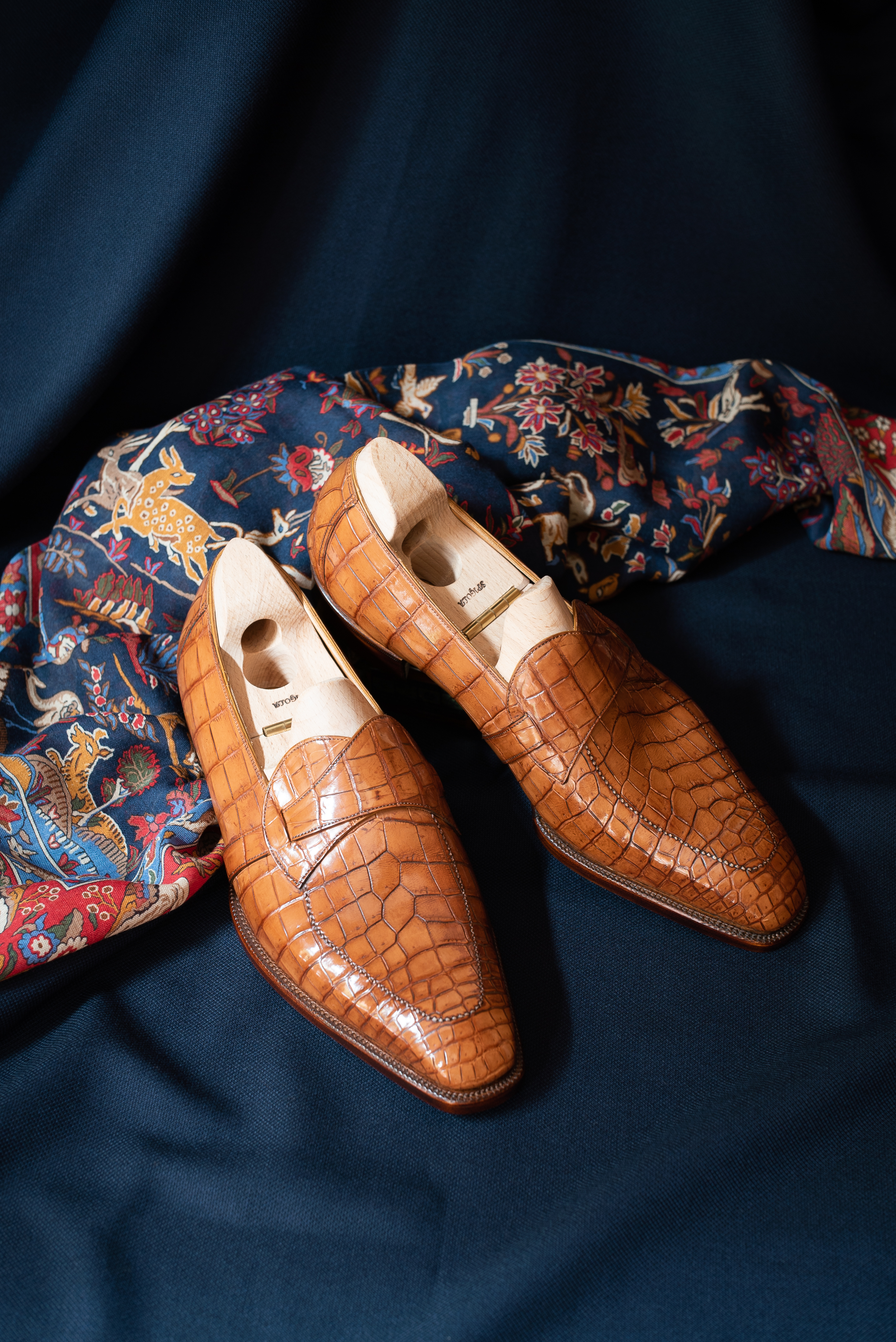 "My newest pair are captoes in a lighter shade of llama leather. I wasn't planning on ordering a new pair at this particular trunk show, but Koji showed me this unique swatch and I pounced on this llama like an Andean mountain lion.