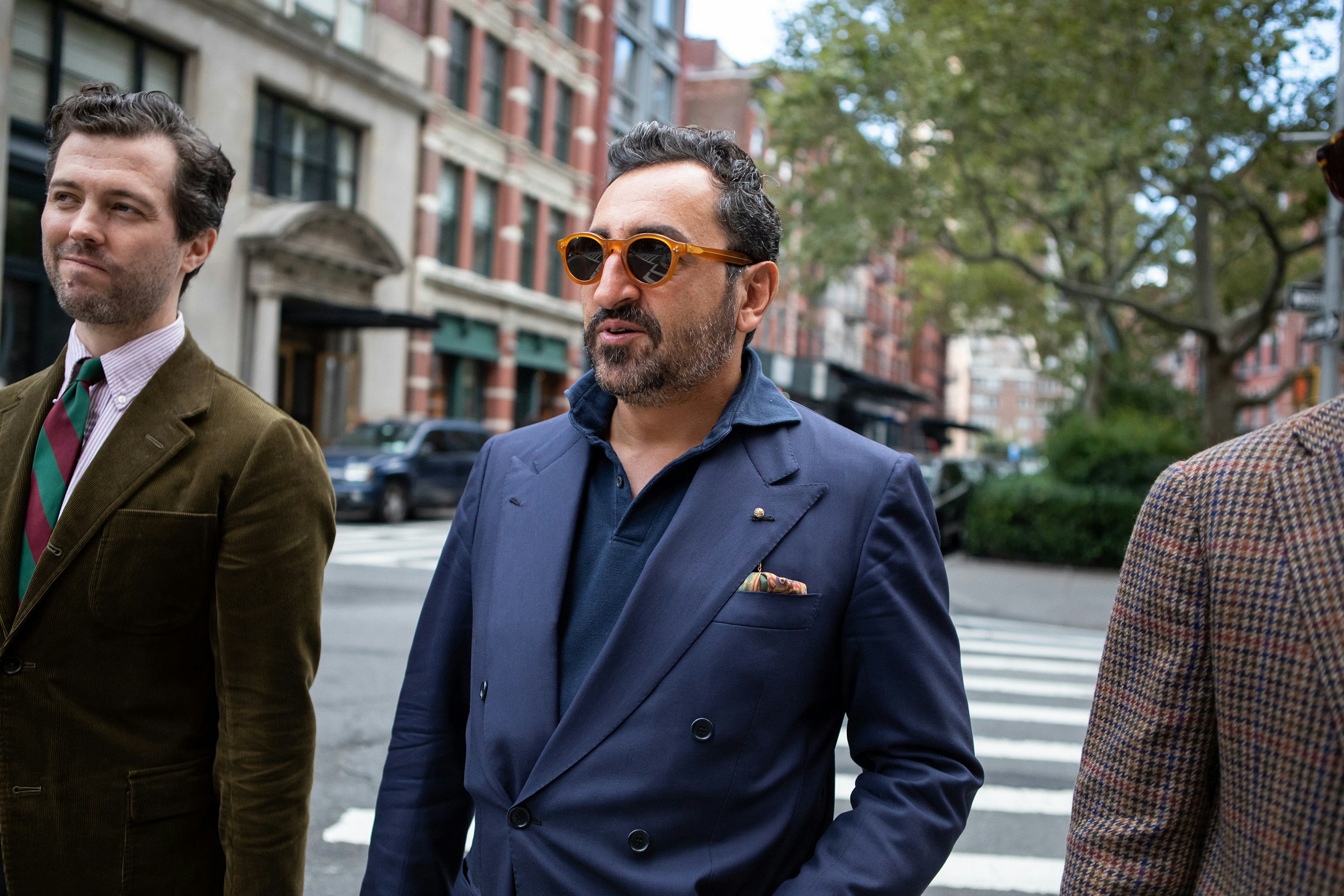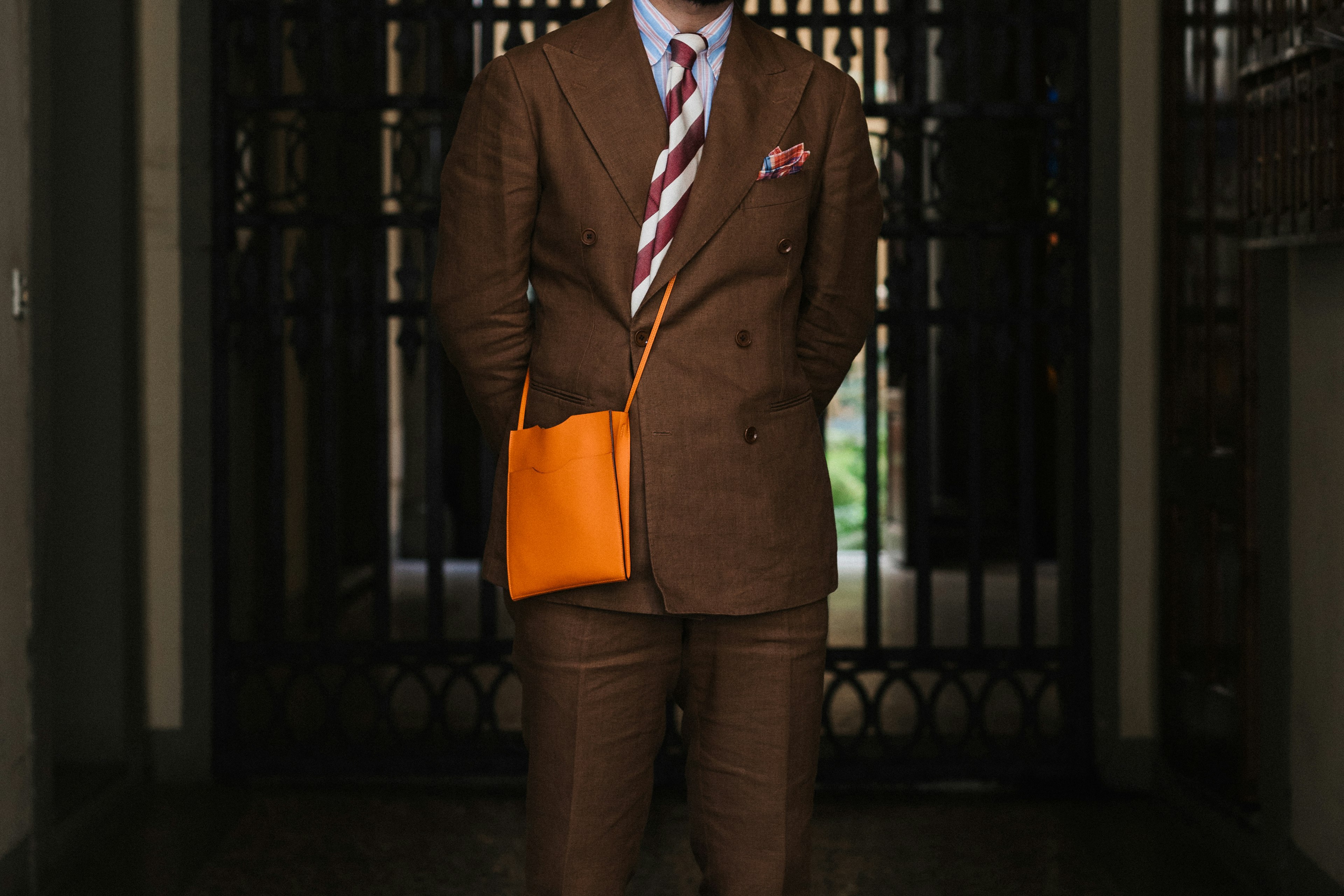 For example, I have a beautiful brown linen suit, so in summer I lighten it up with a white shirt and a colorful tie to announce the tones. Fall is more melancholic so the colors change too. But whilst it's warm, embrace the color."