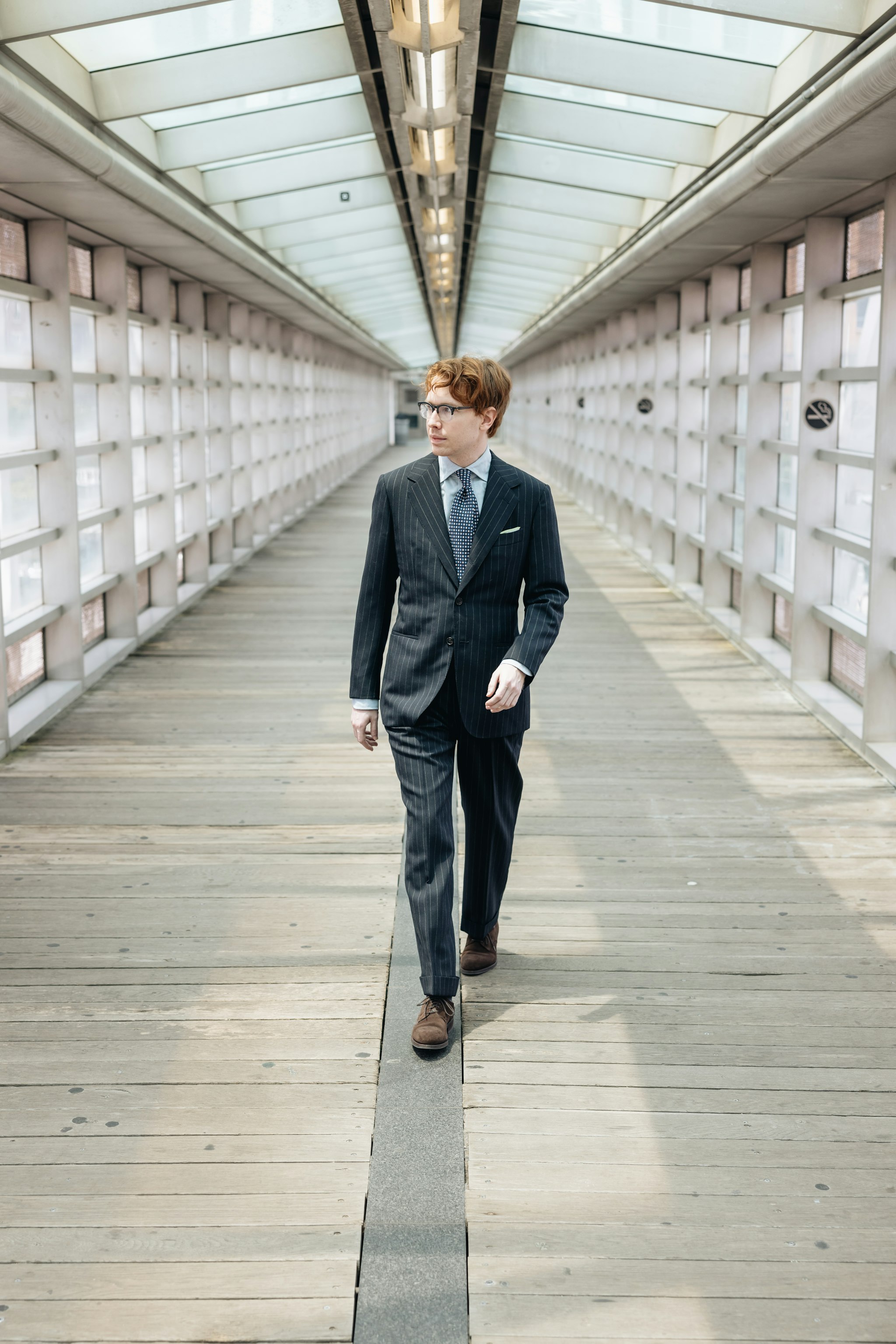 "I've always liked a serious suit with suede shoes: I often wear elegant suede oxfords with soft tailoring, but I really like a slightly chunkier derby with the Milanese-influenced style of this Armoury Model 101 suit. I think of this look, with the printed tie and the open shirt cuffs, as "1990s Italian industrialist style," the sort of thing you see on guys in the background of Ferrari press launches.