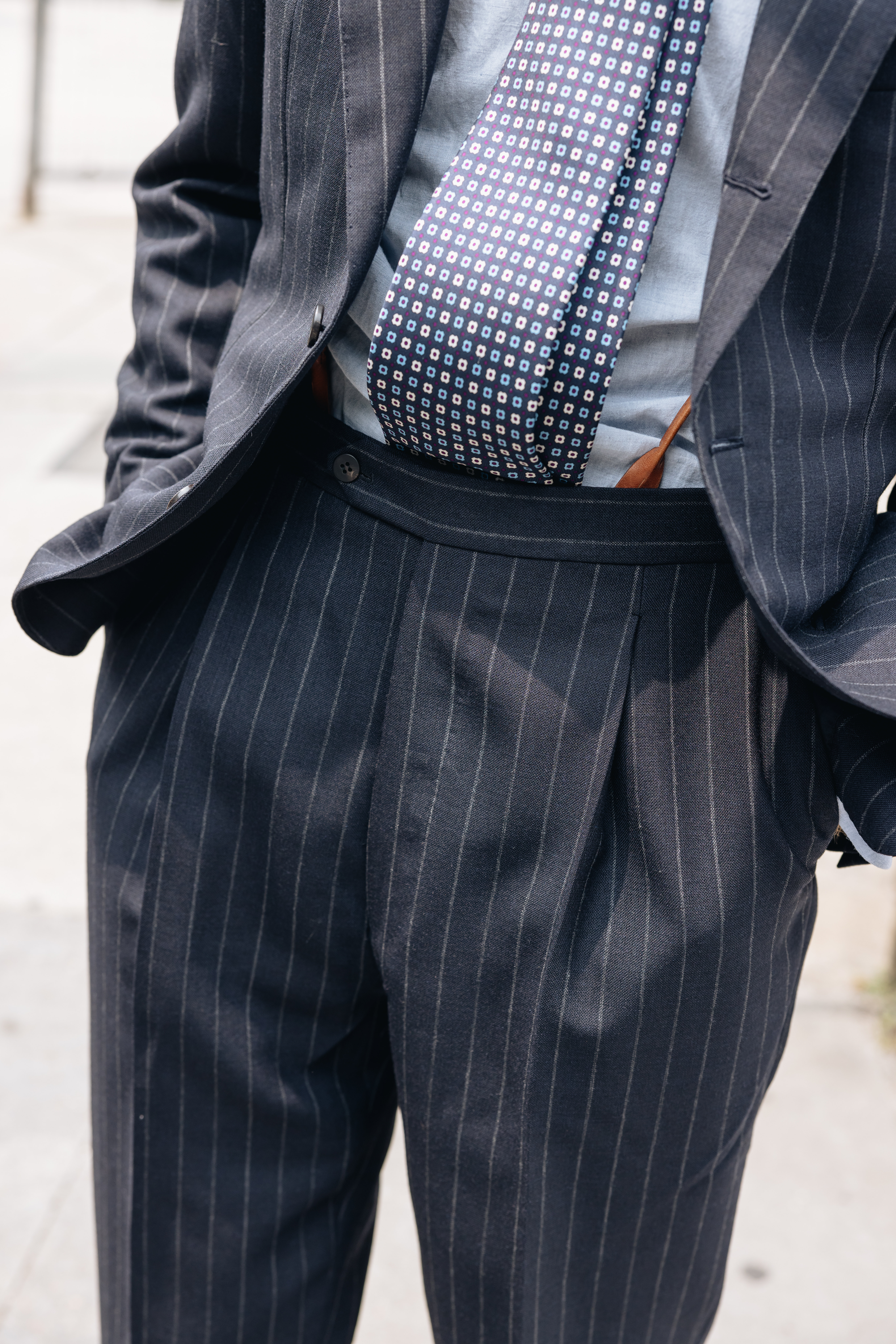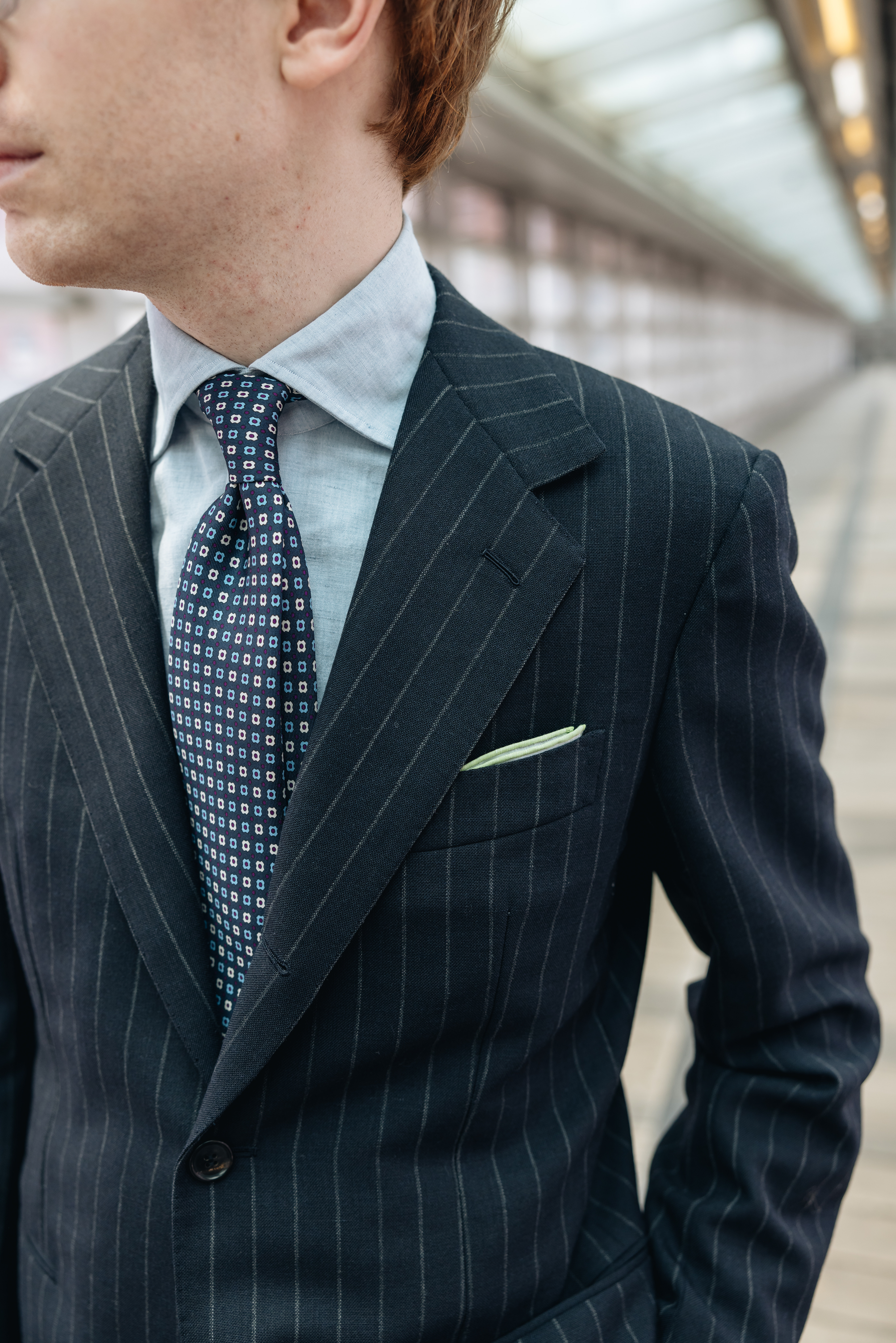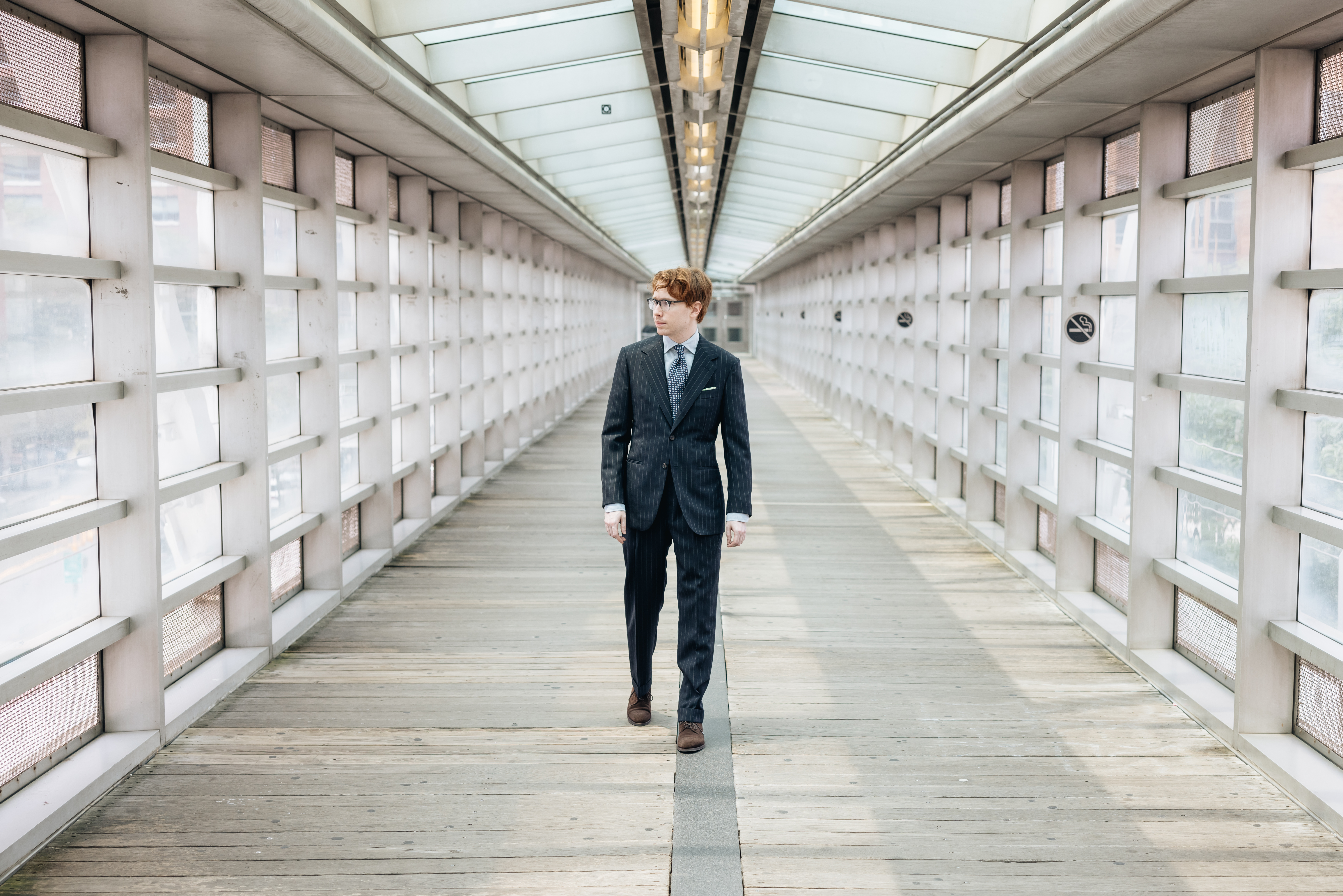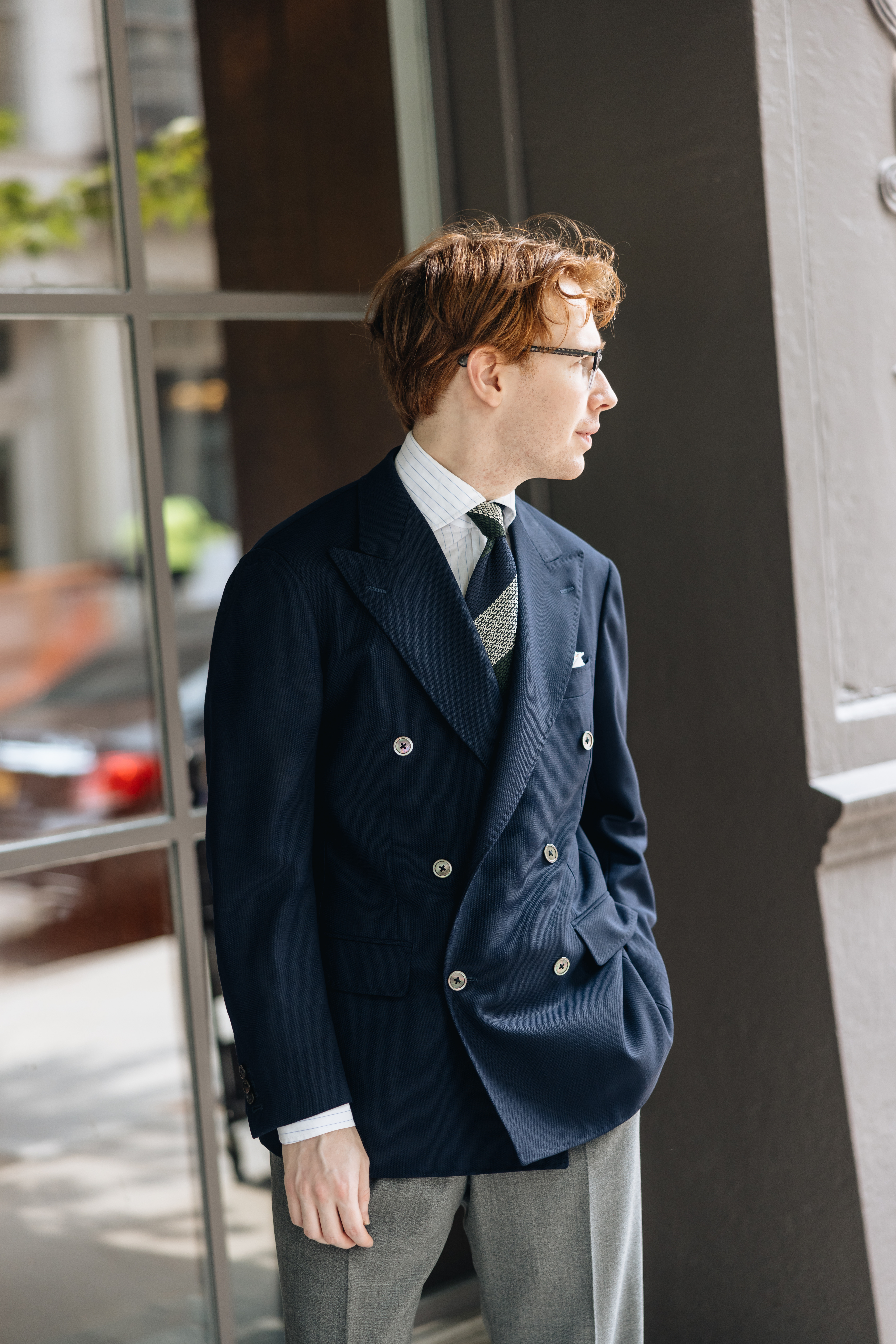 "I've always liked a serious suit with suede shoes: I often wear elegant suede oxfords with soft tailoring, but I really like a slightly chunkier derby with the Milanese-influenced style of this Armoury Model 101 suit. I think of this look, with the printed tie and the open shirt cuffs, as "1990s Italian industrialist style," the sort of thing you see on guys in the background of Ferrari press launches.