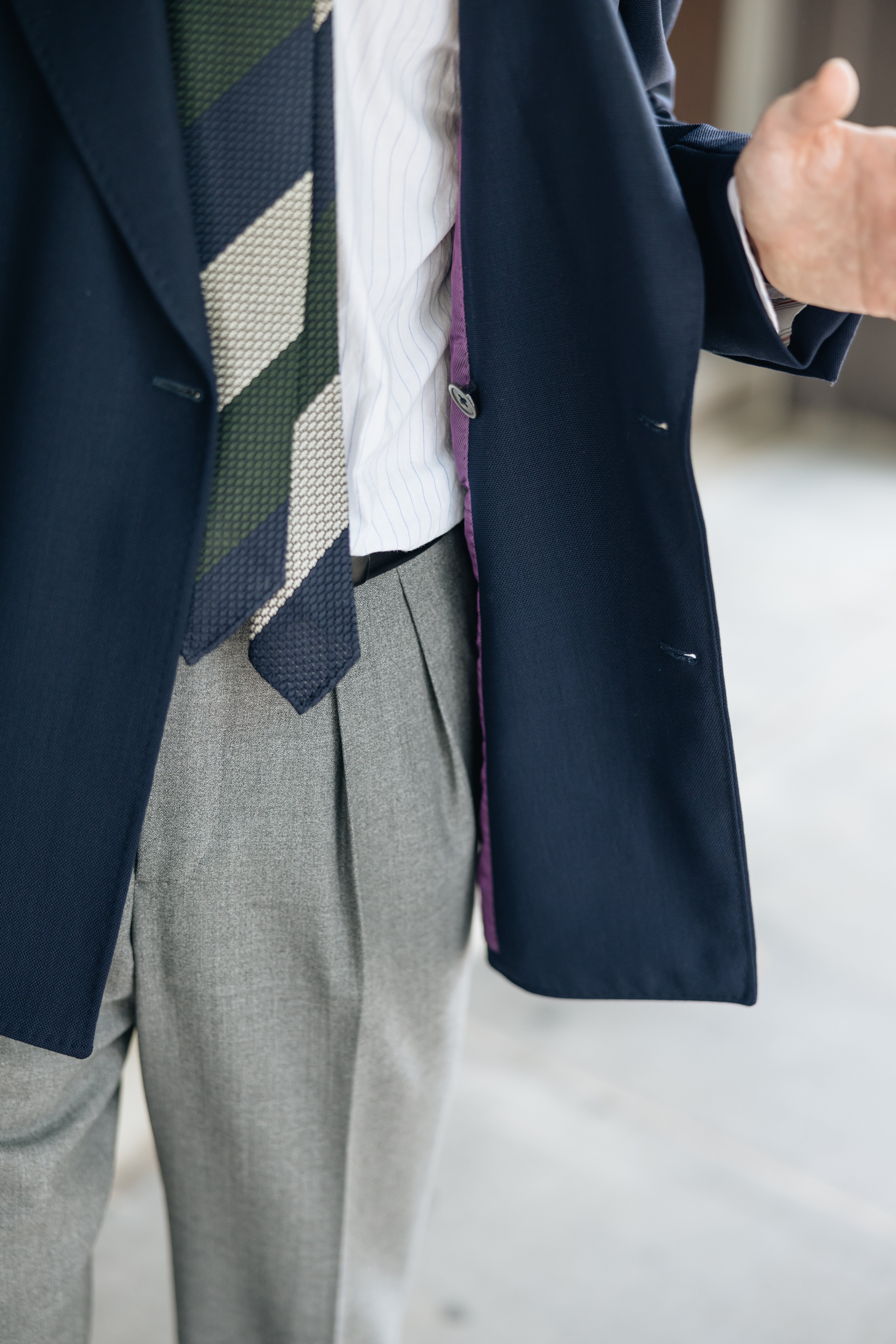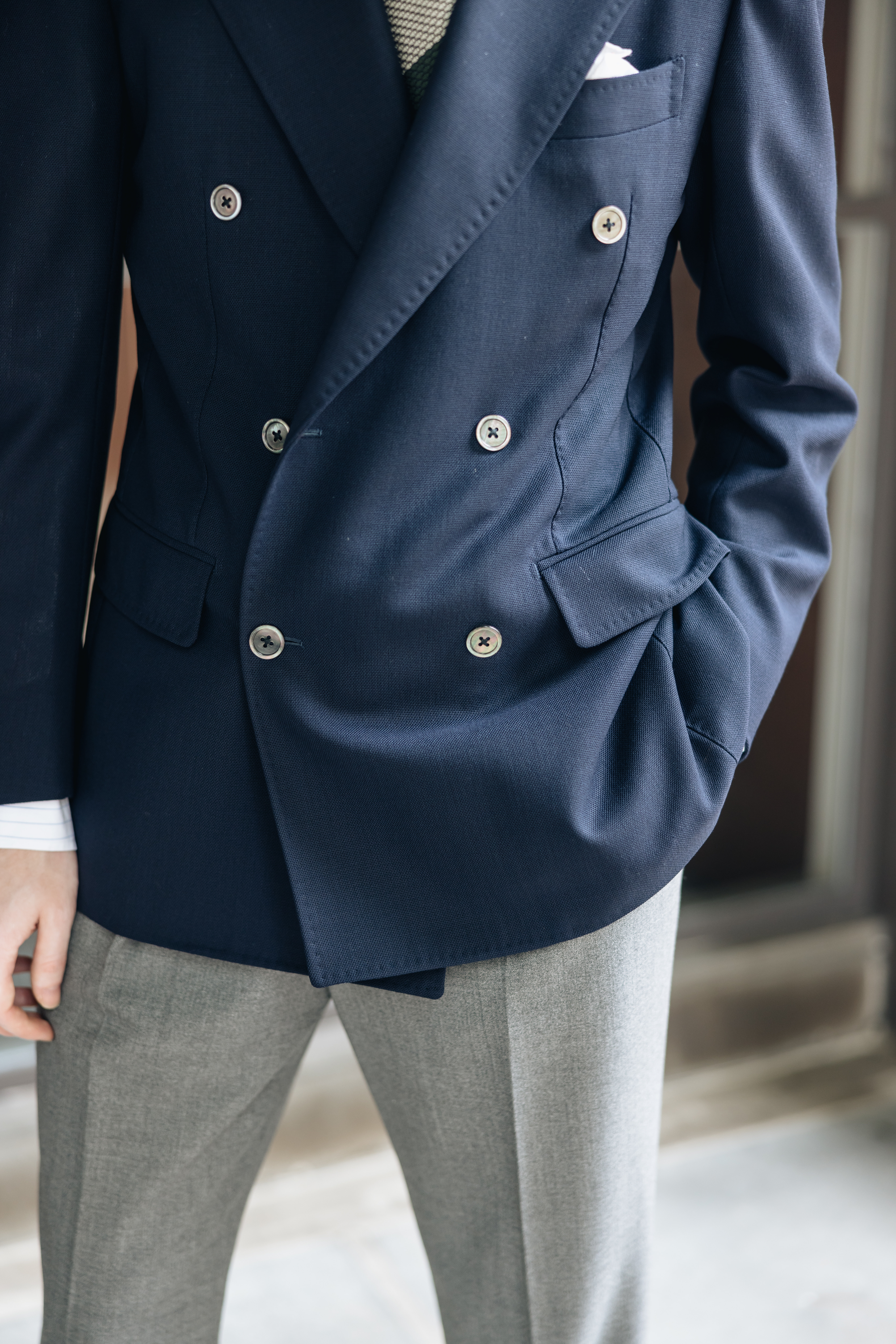 Breathable high-twist wool is the best for this, and my favorite example is the VBC for Draper's 'Ascot' bunch. There's no fuzziness to add warmth, and it's tough as nails. This made-to-measure Model 6 blazer is in the thicker six-ply, and these Rota trousers are in the well-balanced four-ply: this kind of stuff is the heaviest I can get away with in the summer and the lightest I can wear in the winter."
