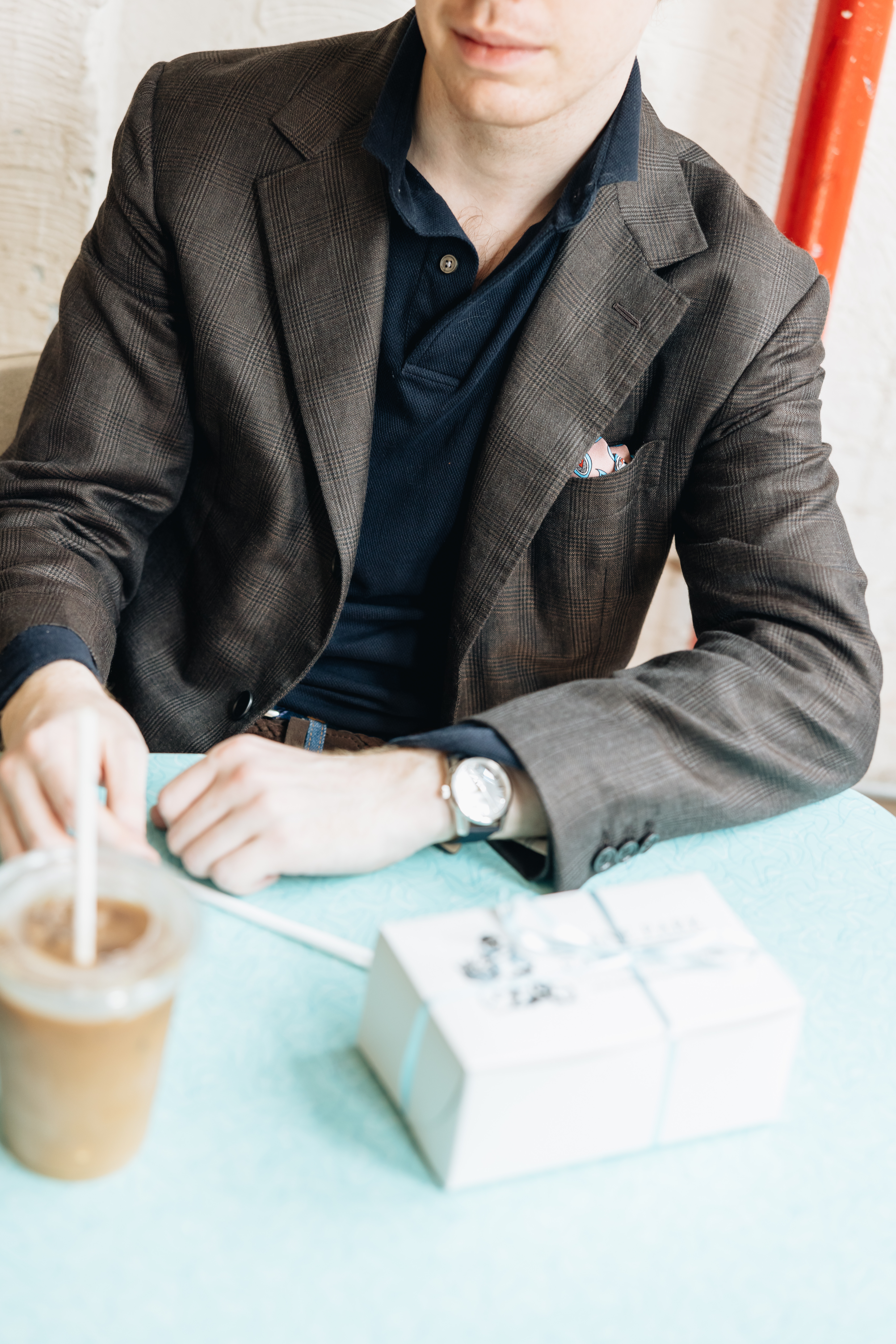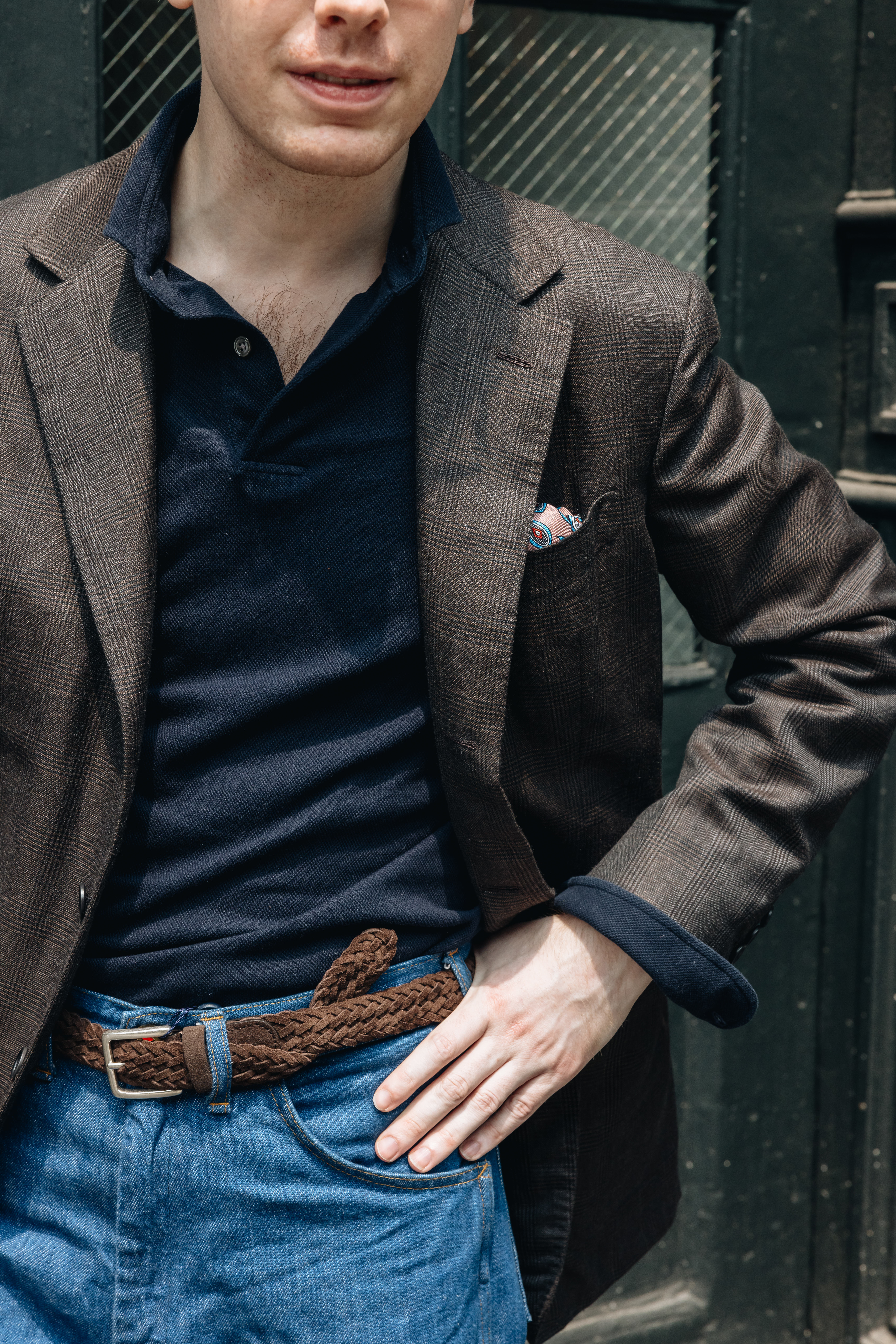 "When I worked for Drake's, I lived in checked jackets and blue jeans. Lately, I tend to break this kind of look out on wet days: no need to worry about losing the crease in the trousers if there was never a crease to begin with, and our navy polo is a nice alternative to a shirt and tie: it's almost the summer version of a turtleneck.