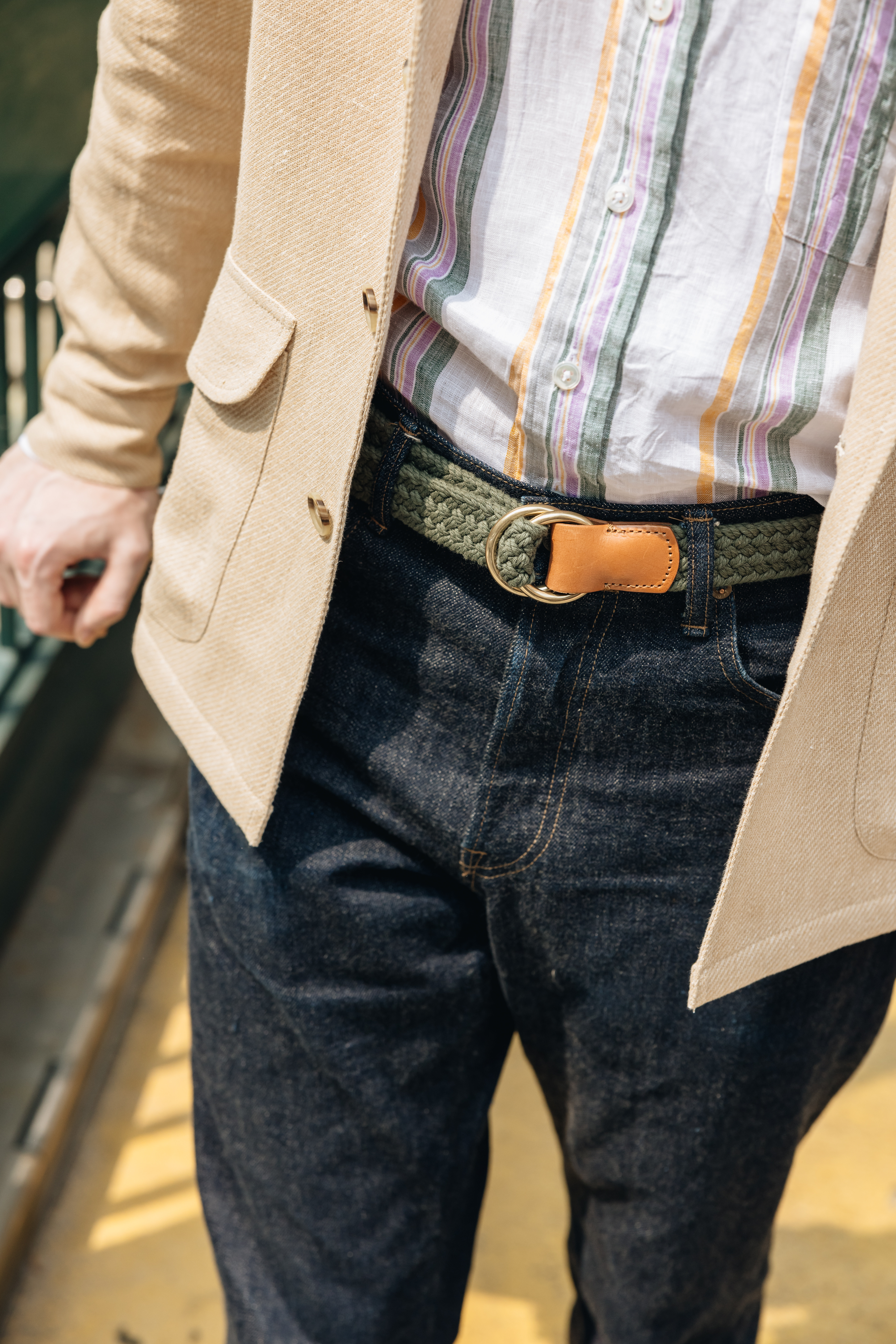 I think Drake's does a great job of drawing on their heritage as a tie maker by taking colors that are typically seen in neckwear and putting them in a different context: the colorful stripes elevate this simple linen shirt and keep things from being too neutral."