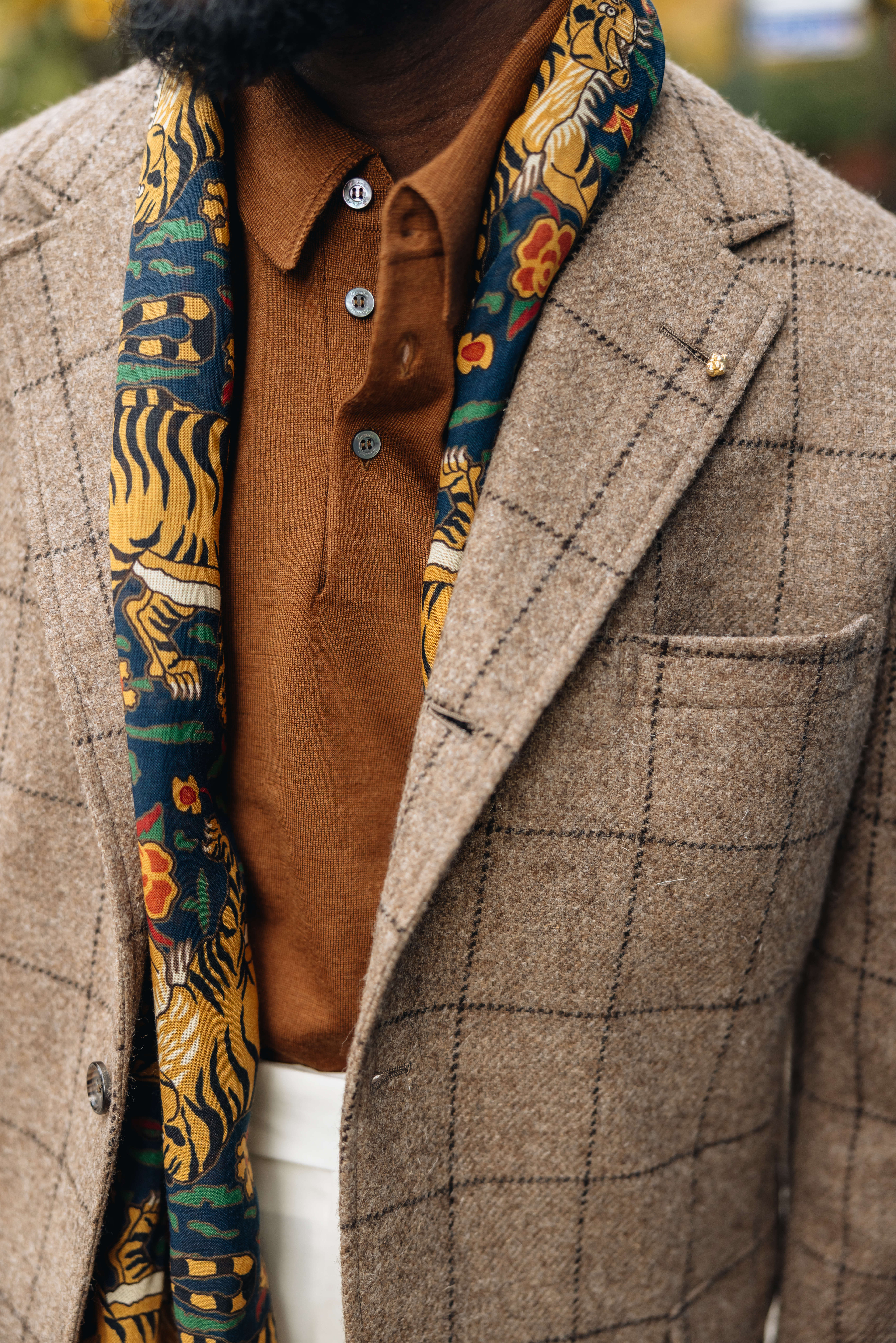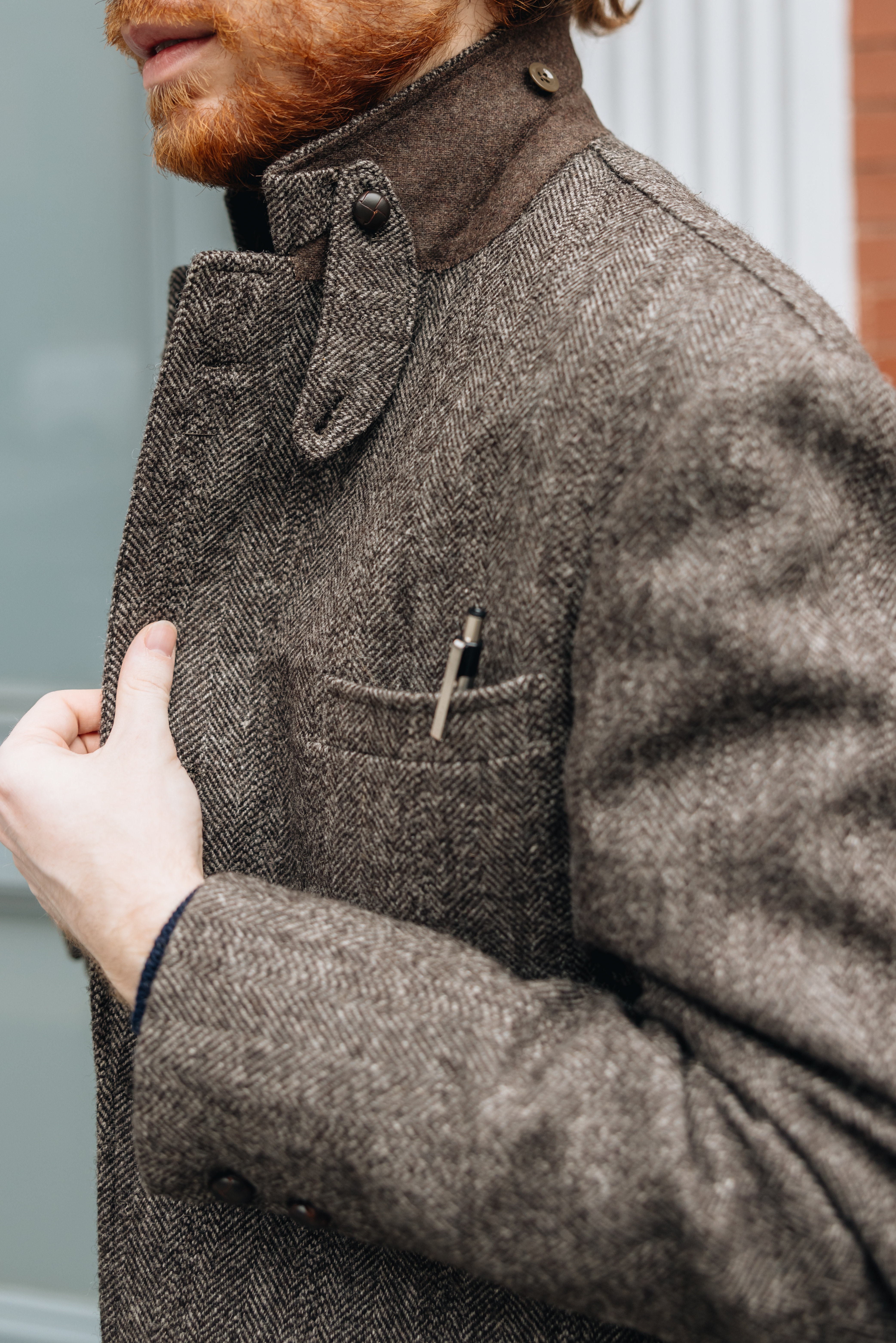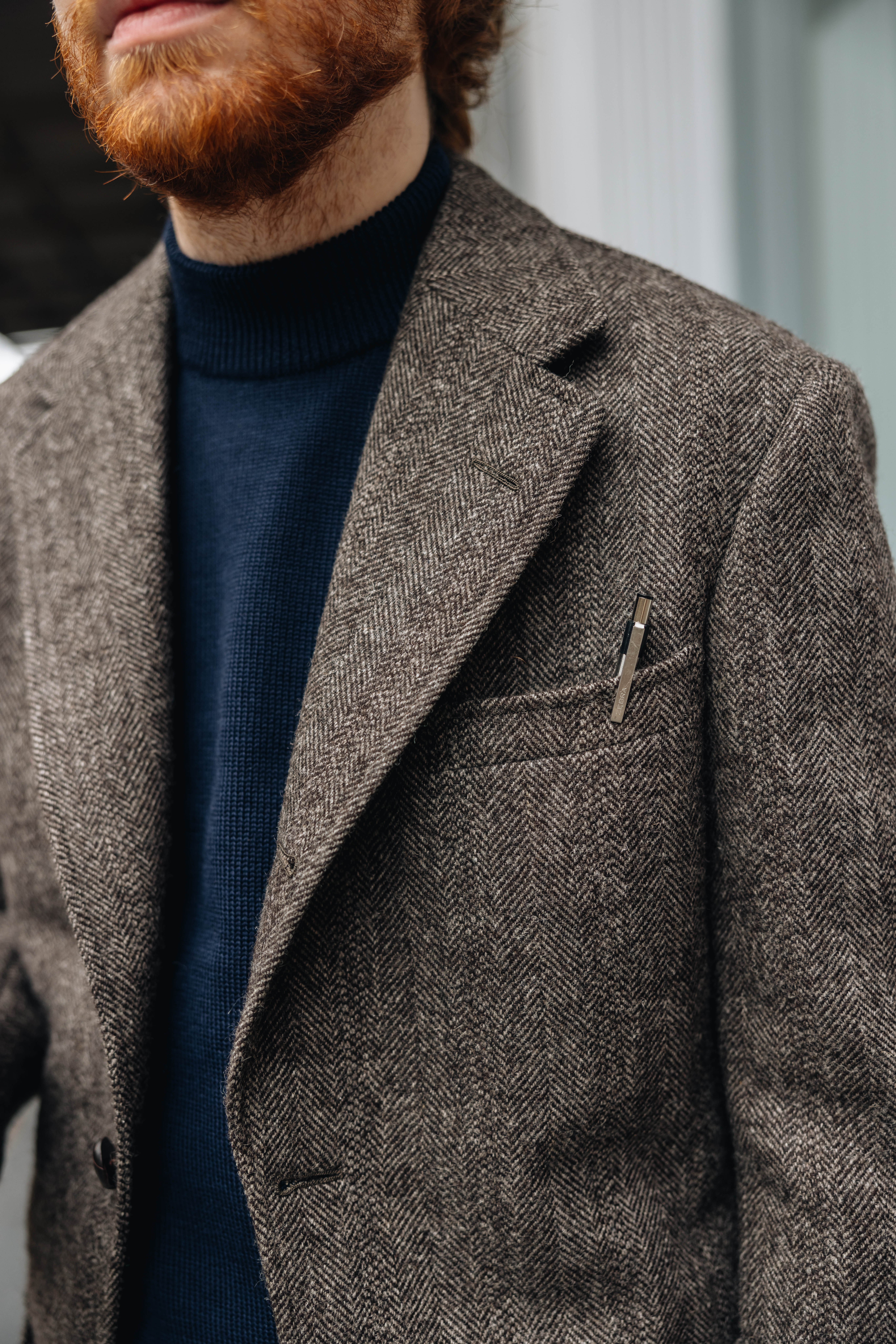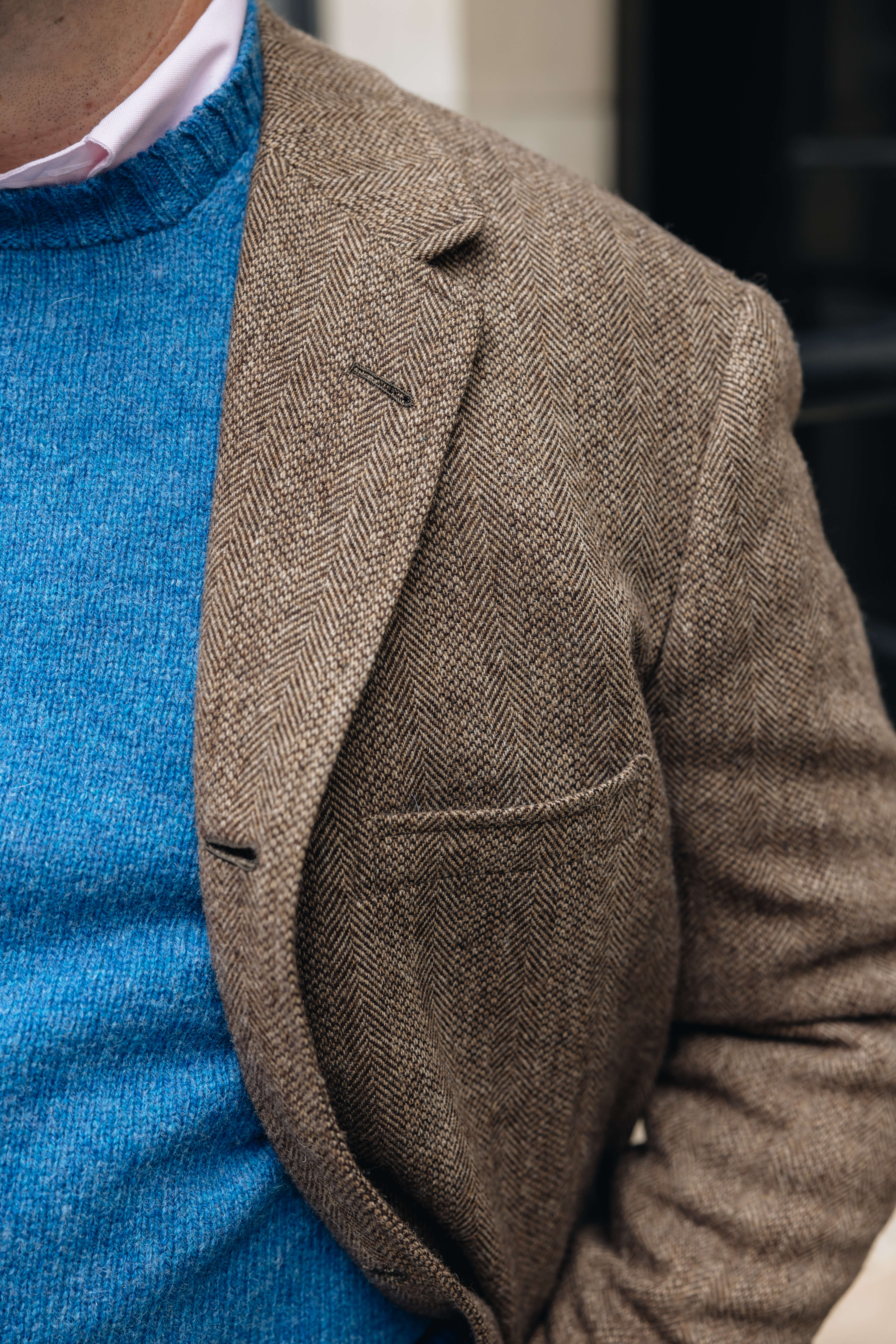 "Like much of Tailor Caid's work, this jacket had a few inspirations: the first was a jacket that Robert Redford wears in the opening scene of Three Days of the Condor. The throat latch was inspired by vintage jackets I've handled from a few famous New York brands: typically those were purely ornamental, but Yamamoto-san was able to create one that actually works, and can be hidden away completely if I want. The final piece of the puzzle was the perfect tweed: undyed shetland lambswool in a rare weave that alternates between herringbone and barleycorn - I'd call it unique if not for the fact that my colleague Daniel wound up ordering something very similar indeed..."