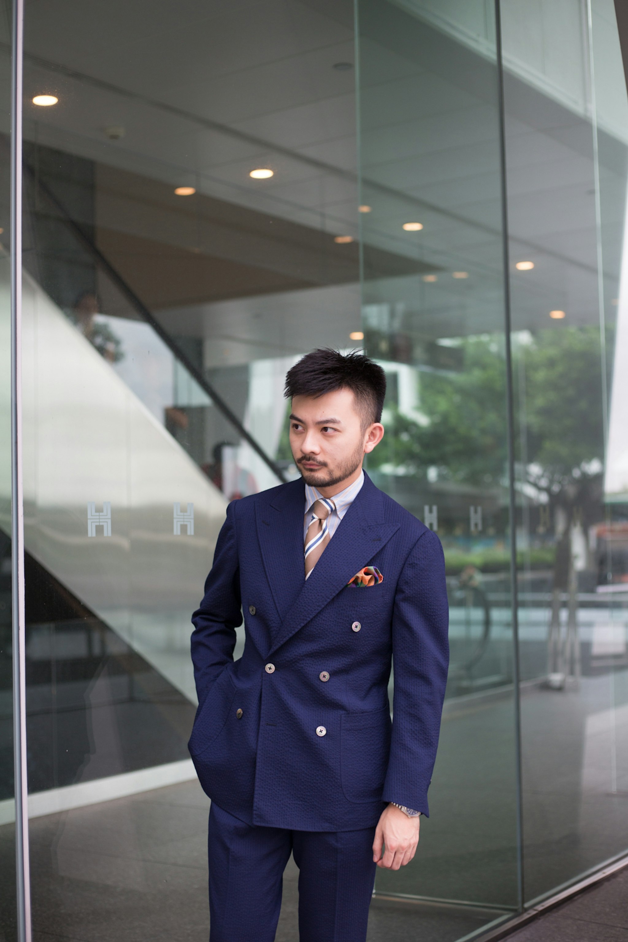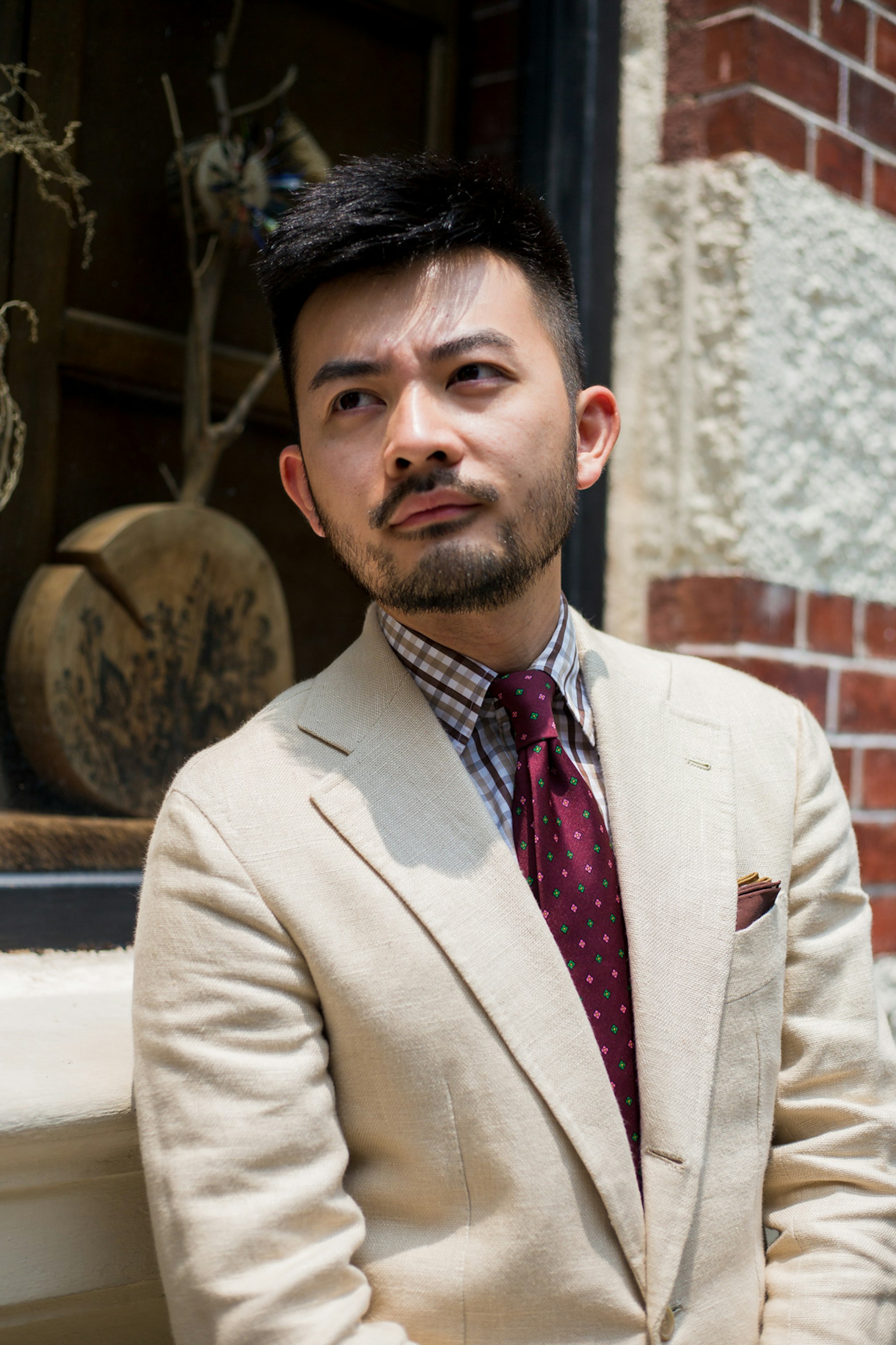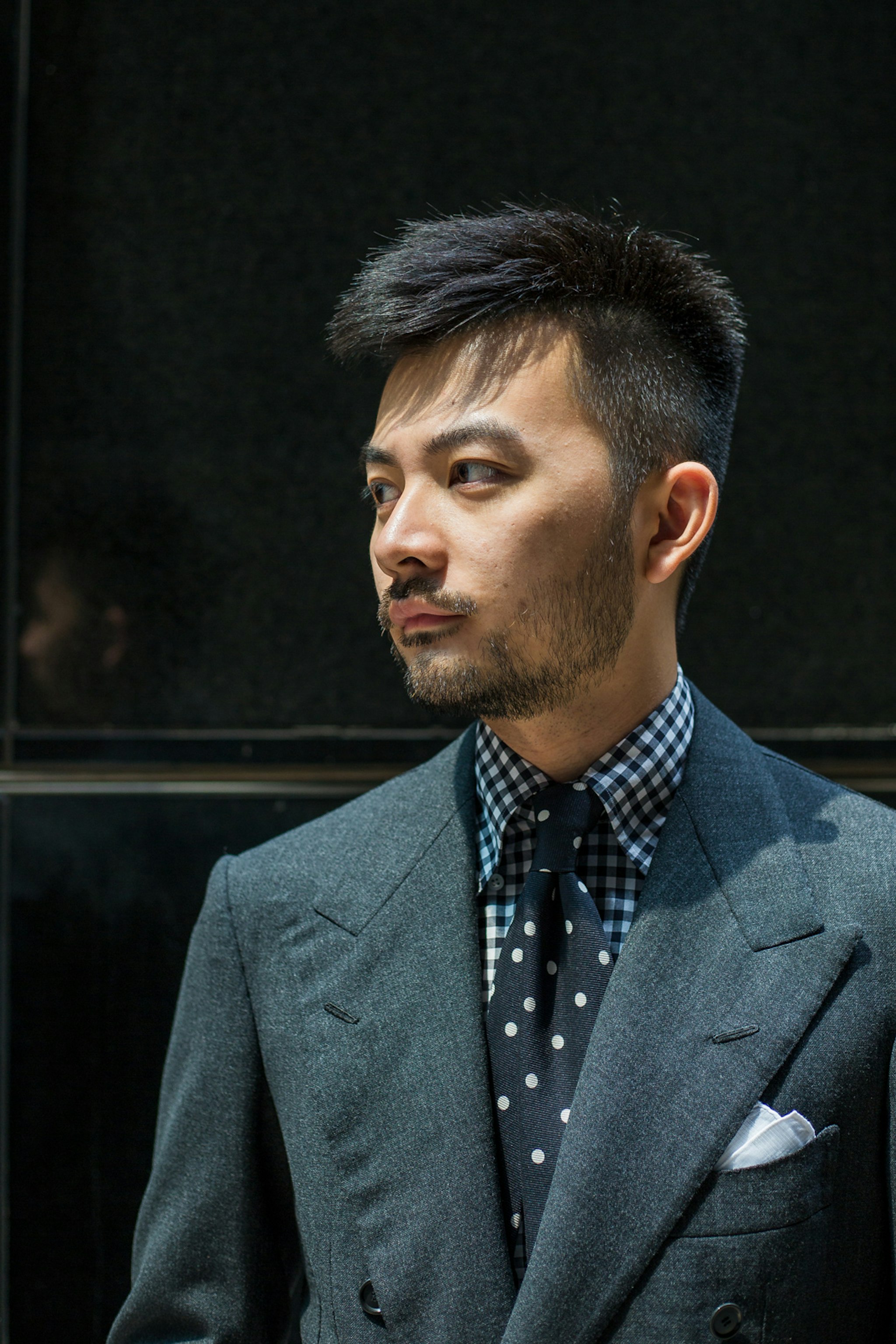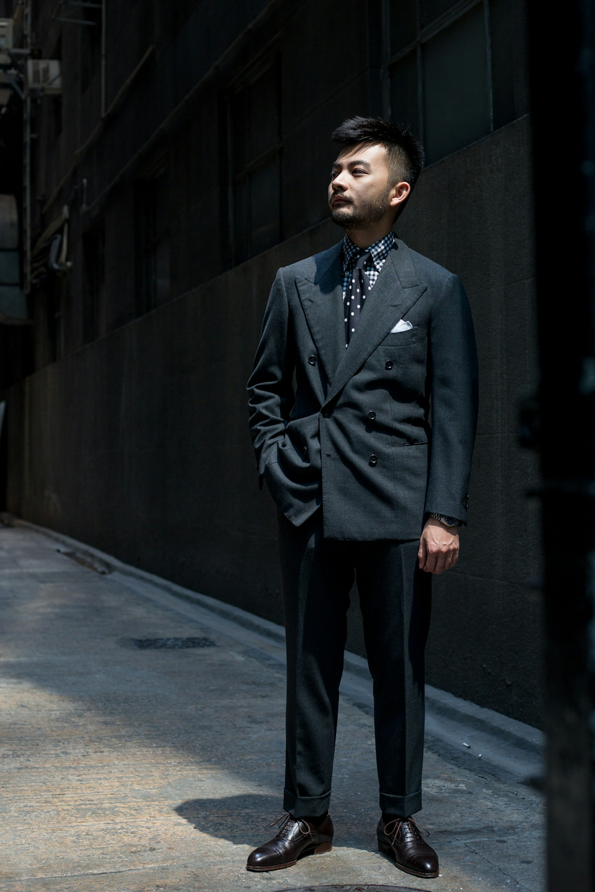 This is one of our favorite suiting fabrics from VBC, the four-ply wool. The high-twist yarn makes it a perfect cloth for Hong Kong’s warm weather. As a four-ply weave is a slightly heavier it provides a nice drape to the suit. I also like the idea of having a heftier cloth made with Ueki san’s soft tailoring, which gives a structured, comfortable fit. In terms of color, I went for a monotone palette to emphasize the different patterns.