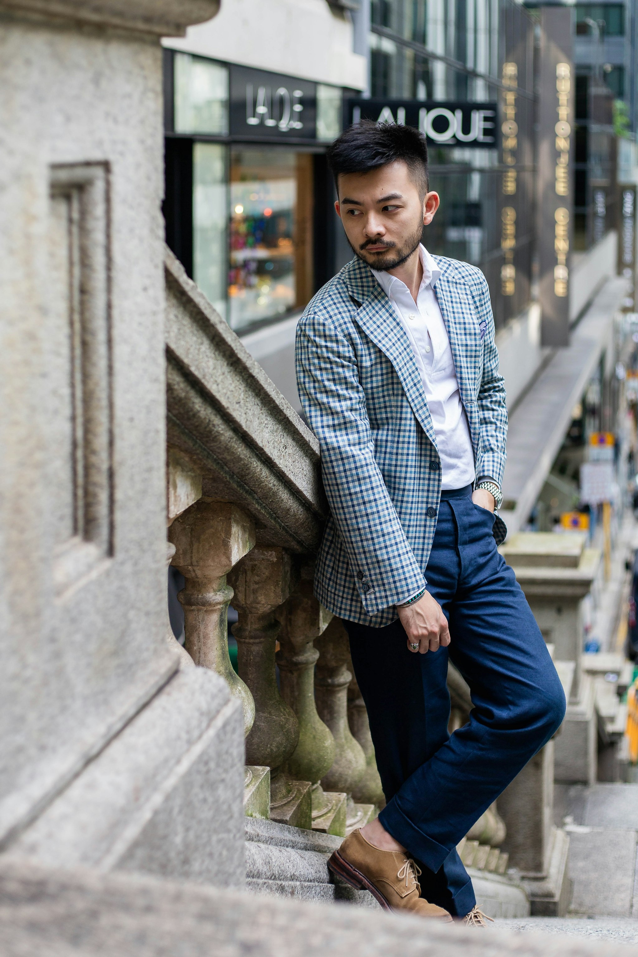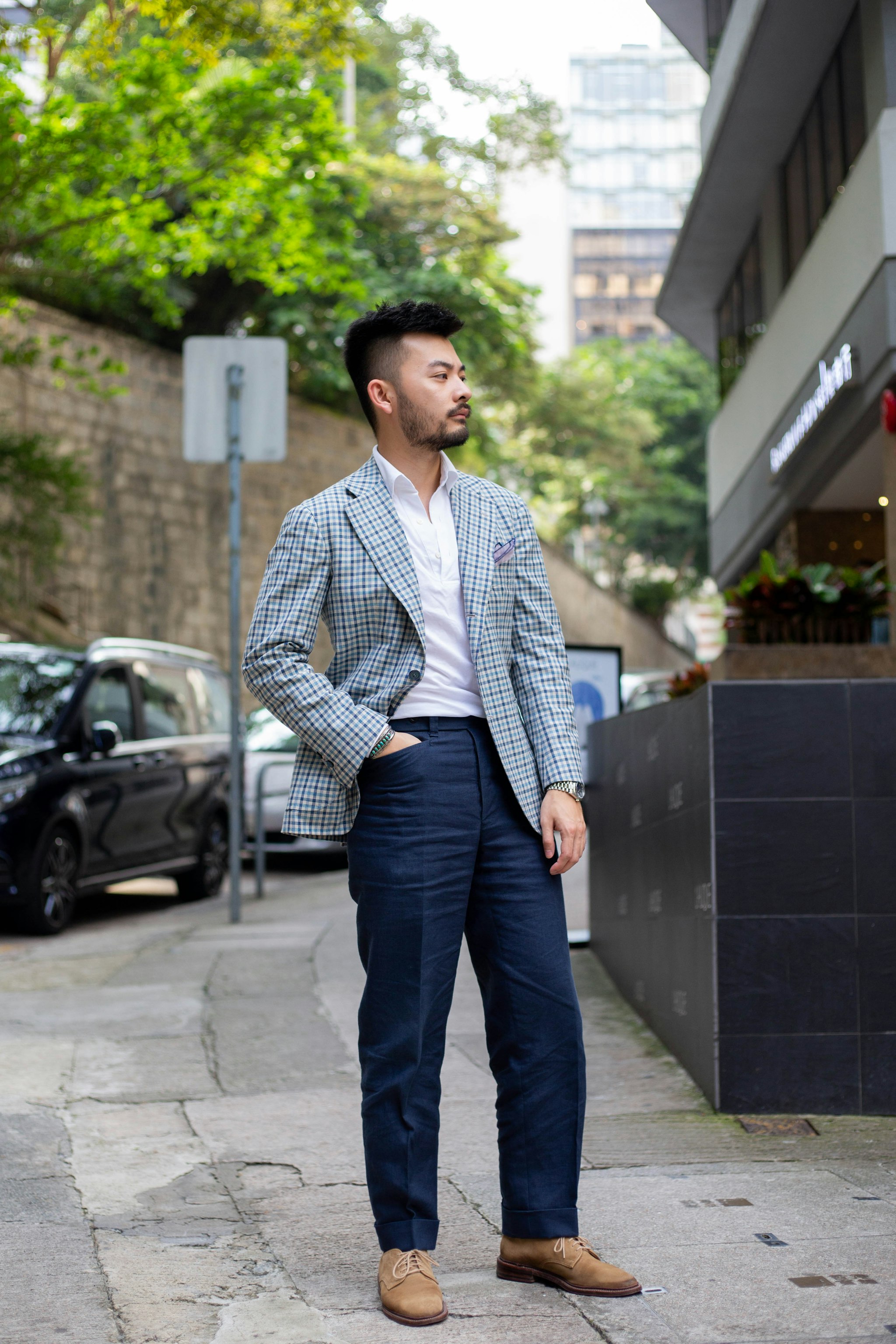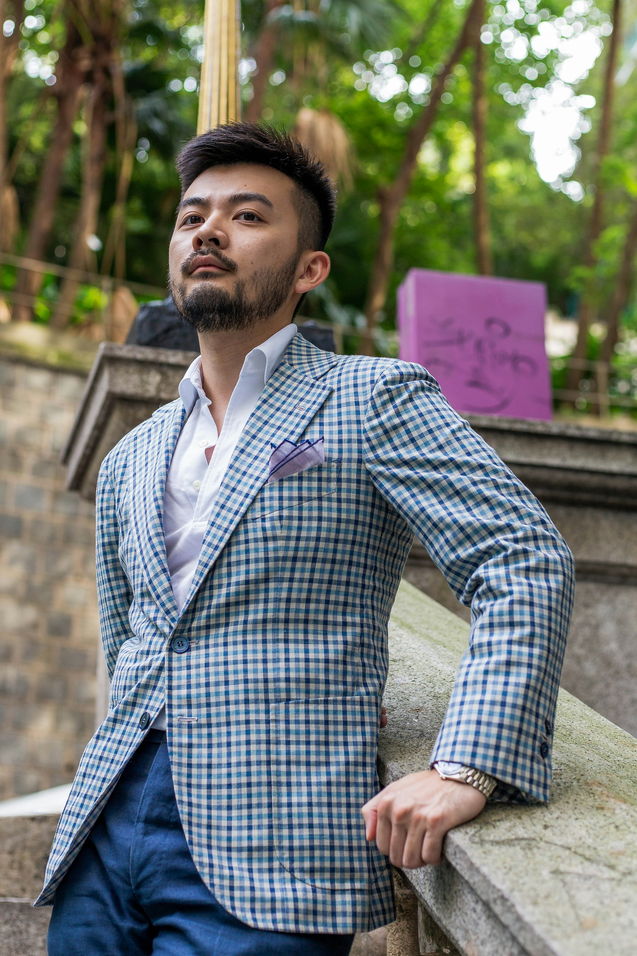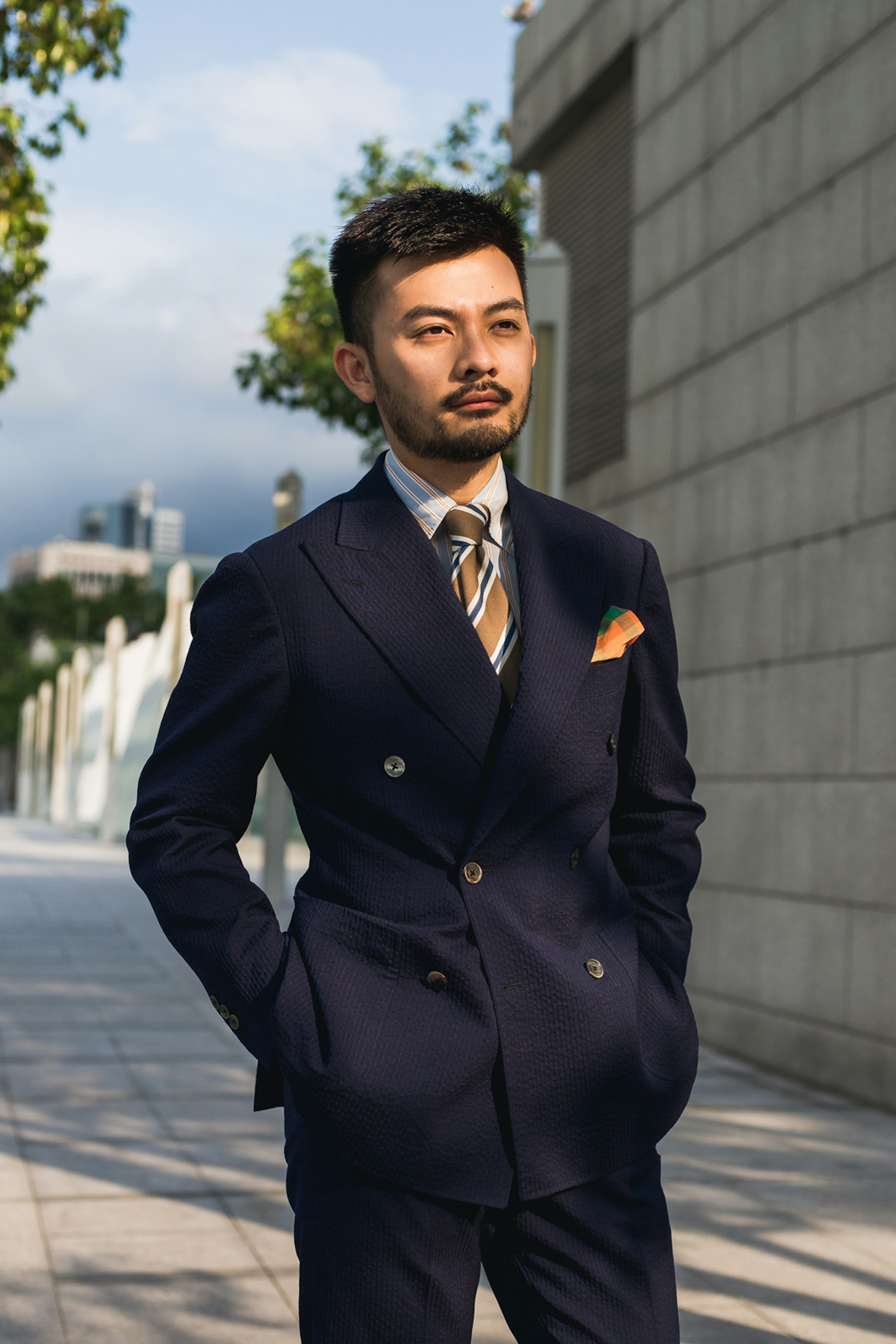 This is one of our favorite suiting fabrics from VBC, the four-ply wool. The high-twist yarn makes it a perfect cloth for Hong Kong’s warm weather. As a four-ply weave is a slightly heavier it provides a nice drape to the suit. I also like the idea of having a heftier cloth made with Ueki san’s soft tailoring, which gives a structured, comfortable fit. In terms of color, I went for a monotone palette to emphasize the different patterns.