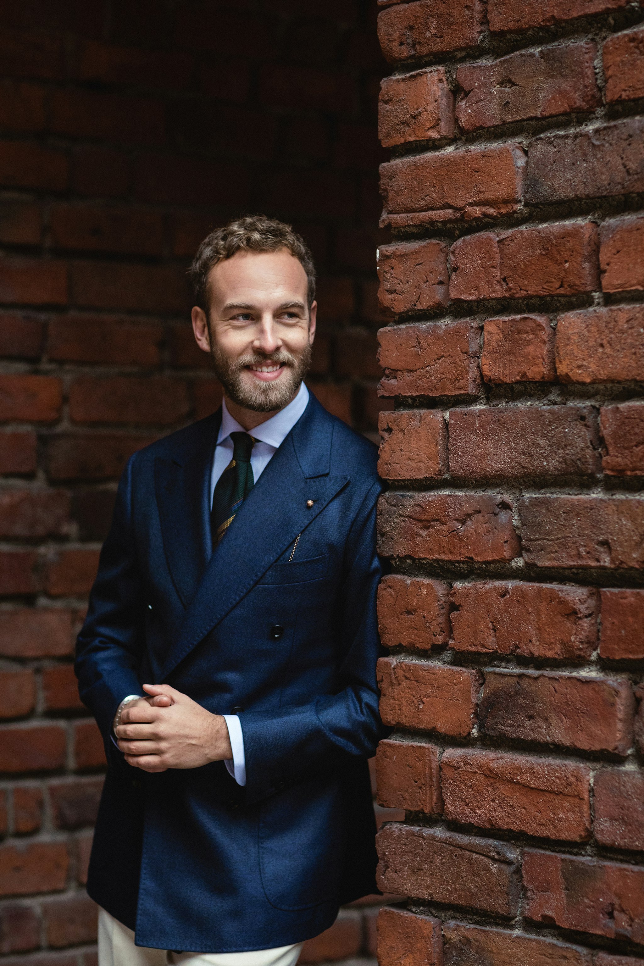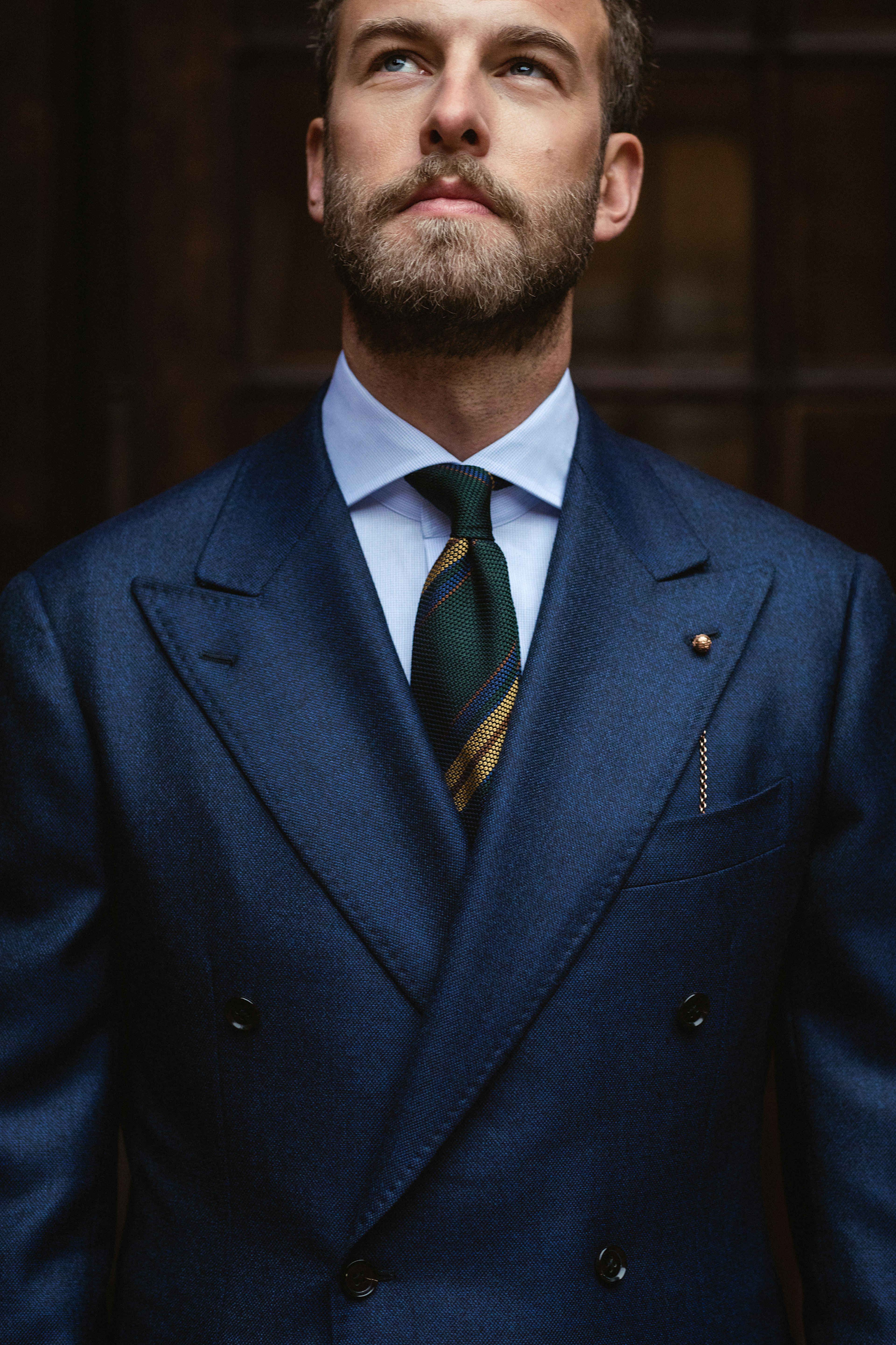 "I added a light blue shirt from Ascot Chang with a shade between the two other garments to balance it out and the seven fold grenadine tie from Tie Your Tie. The construction of the tie is so soft that it makes for a small and tight knot while it still has a casual feel to it."