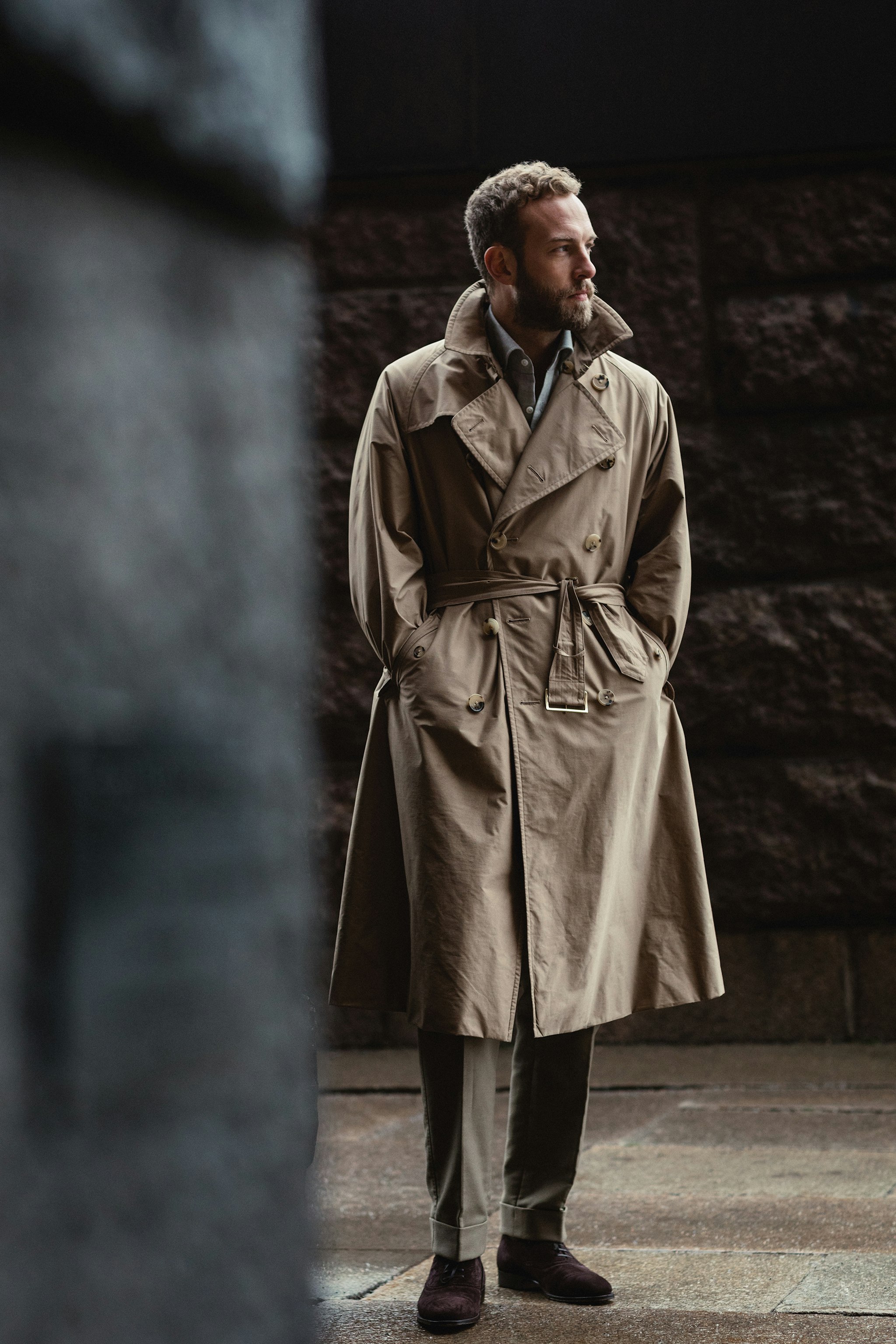 ”The AL trenchcoat from Coherence is a true classic with proportions and a silhouette that brings style icons like Albert Camus or Humphrey Bogart to mind. I really like the fact that this actually keep you and your feet dry during a rain since the skirt is big enough and the length goes below the knee, something which is quite hard to find in today’s market. I prefer to tie the belt with a casual knot and pop the collar for a relaxed yet elegant approach. “