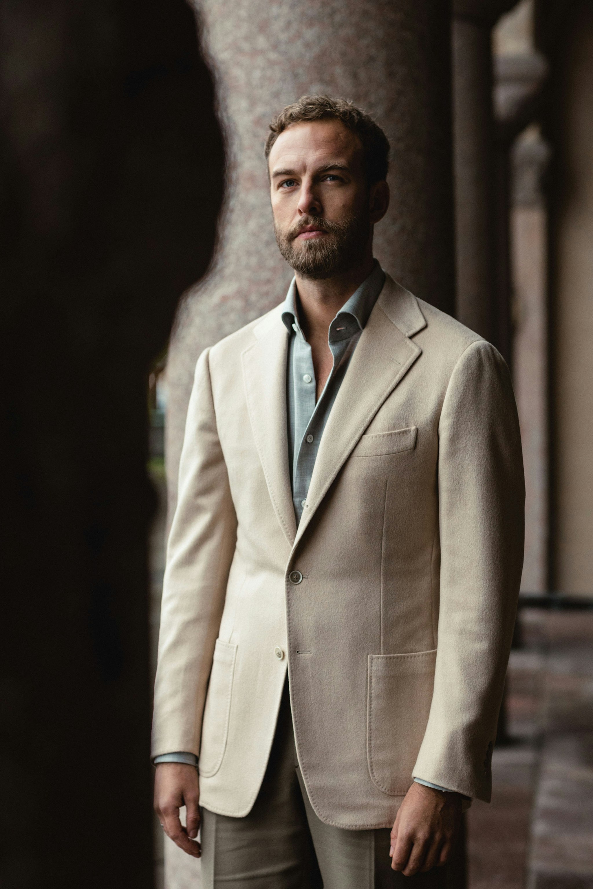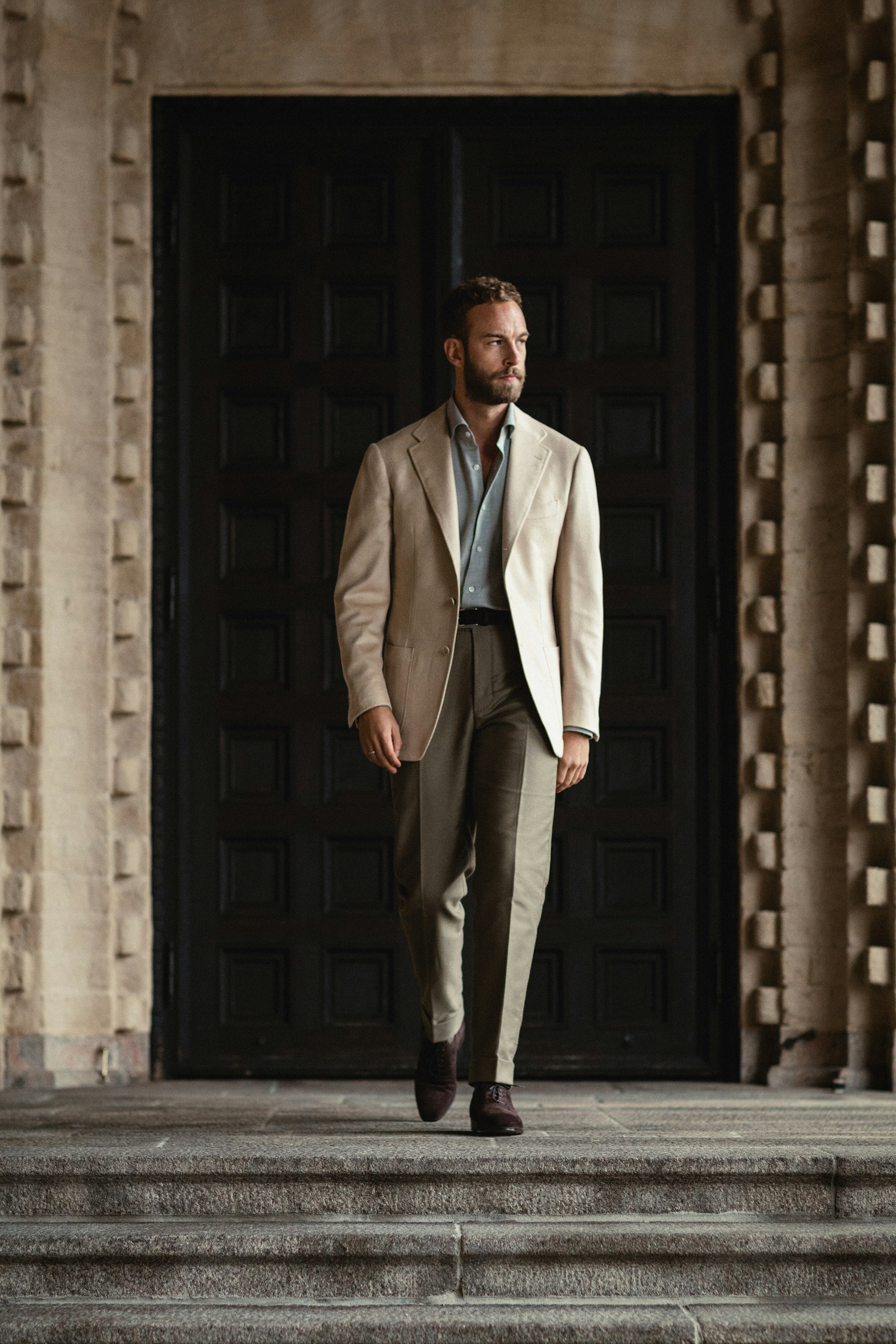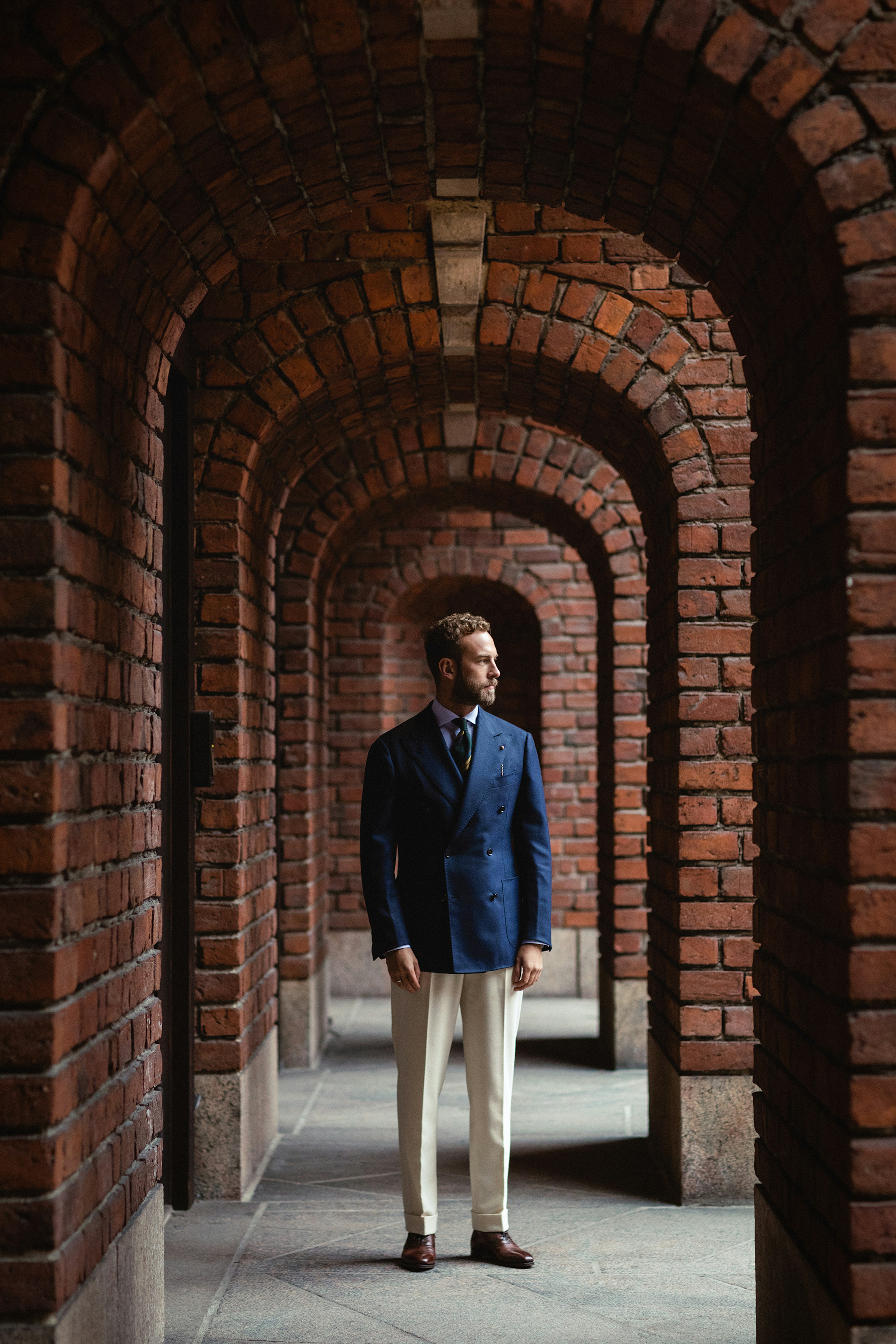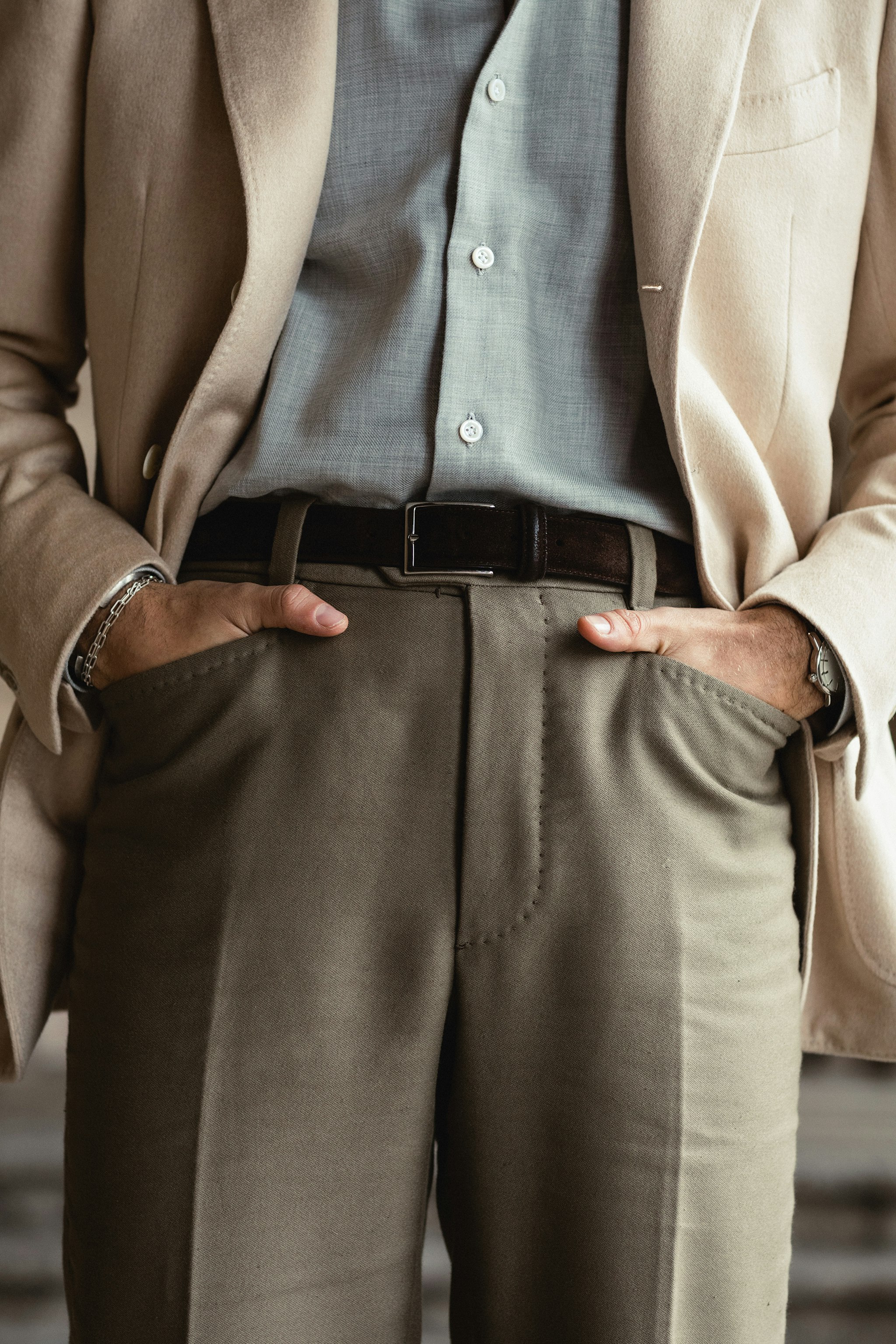 "I love the combination of light, soft and muted colors so my eye immediately caught the camel hair jacket in baby camel hair. It´s daring in some ways but I think it works wonderfully with soft shades of grey and moss. For this reason I opted for the light grey cotton/cashmere shirt made for The Armoury in Naples. I think the shade and matte finish combined with the beautiful collar makes it a casual yet elegant combination."
