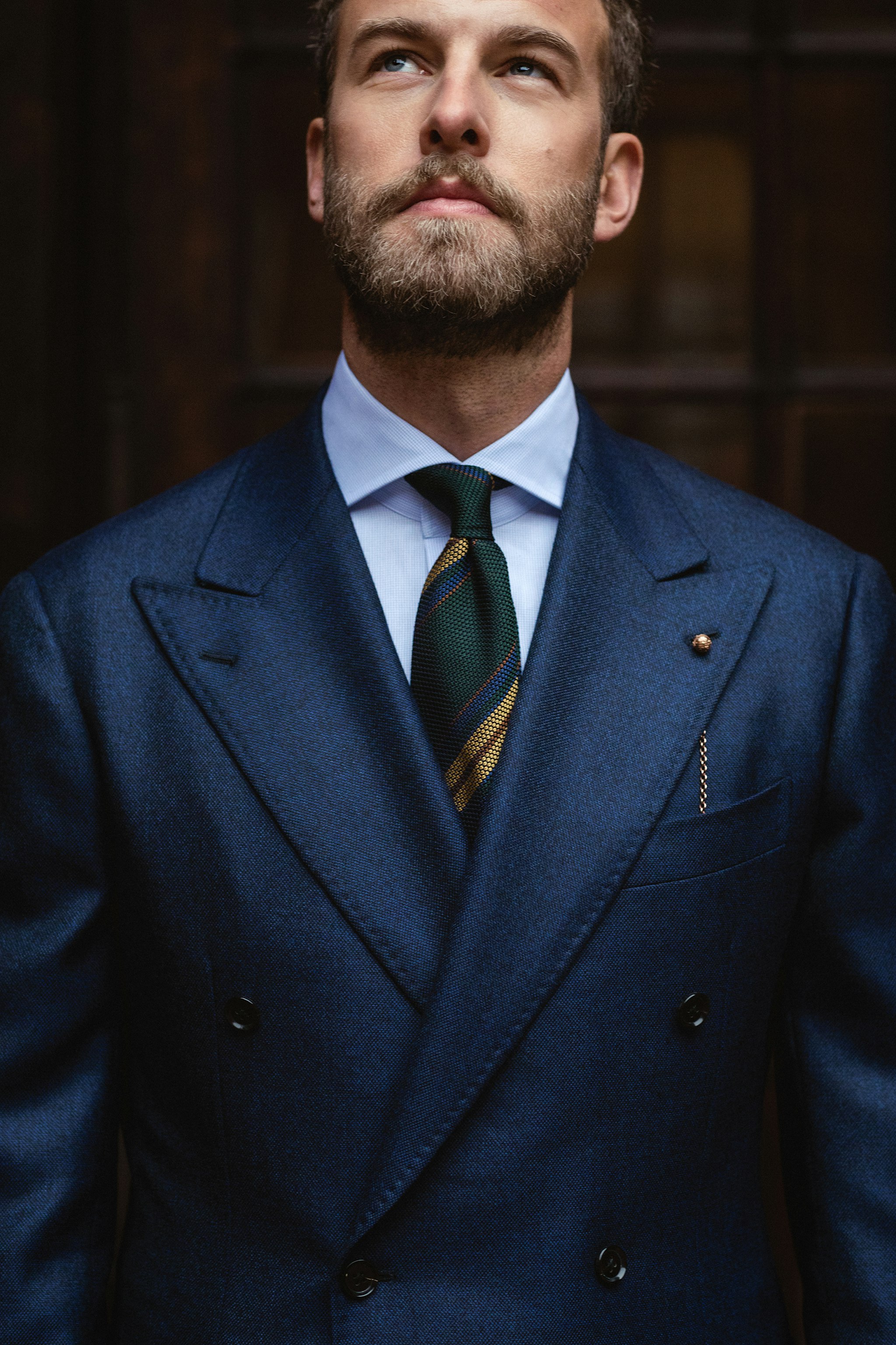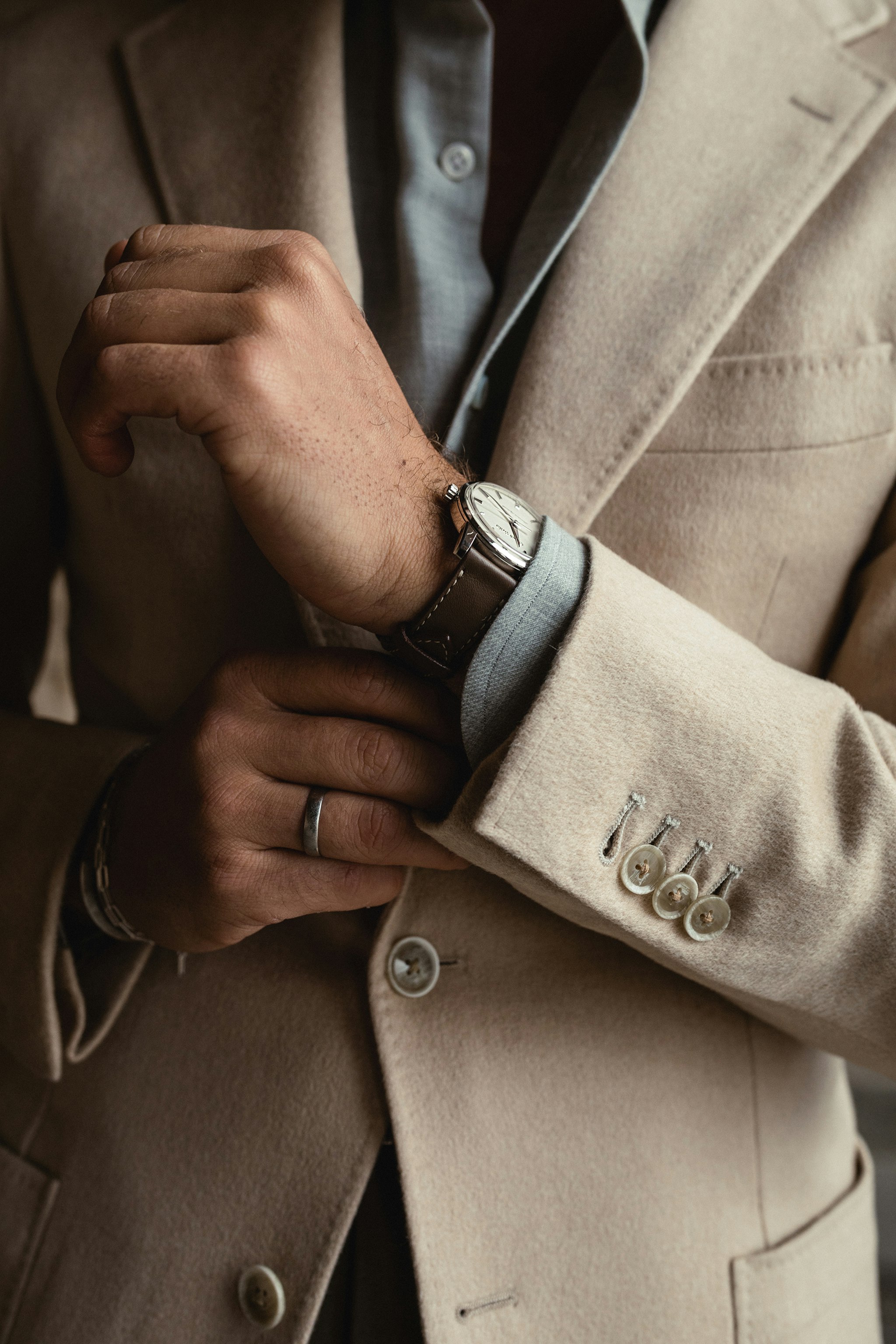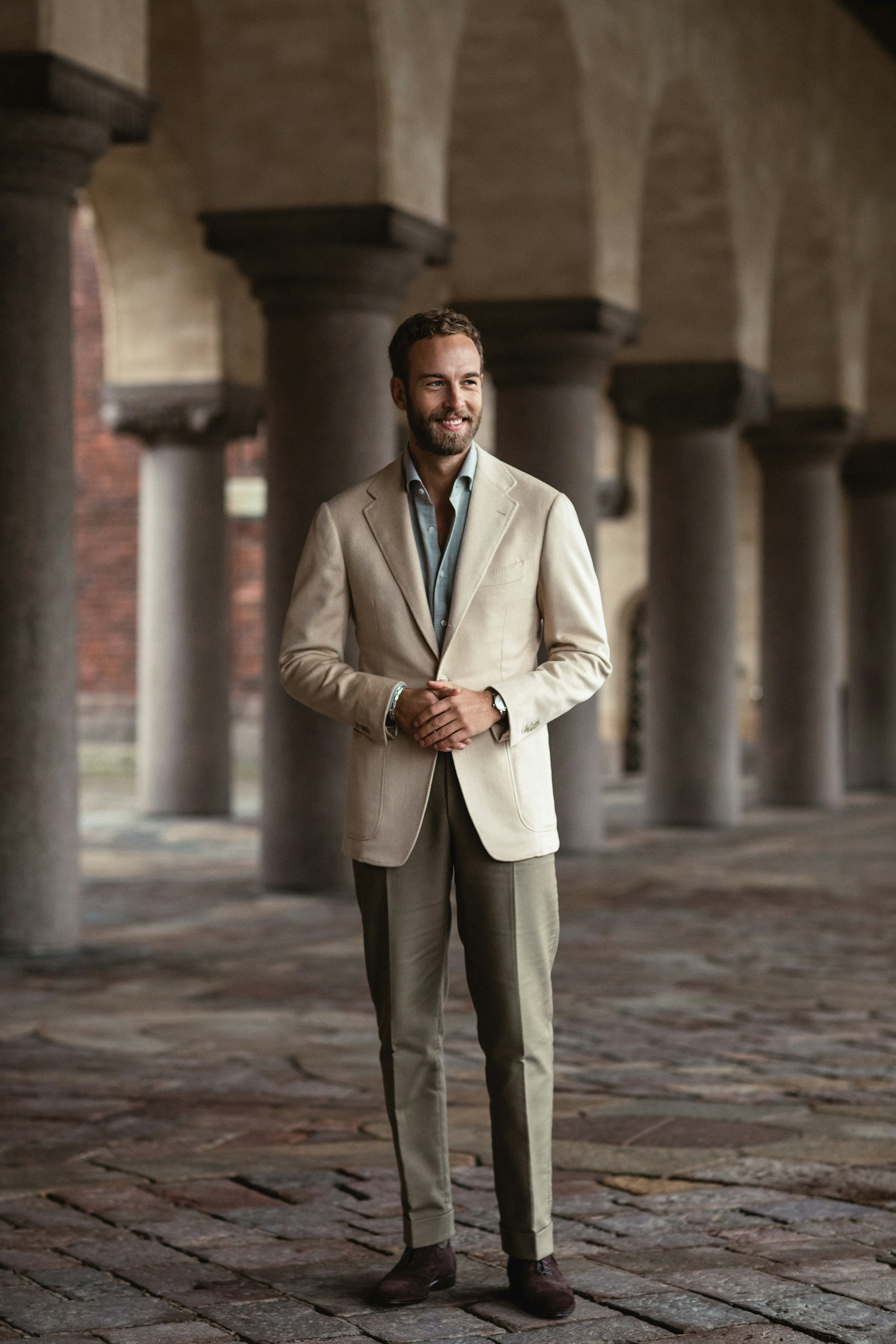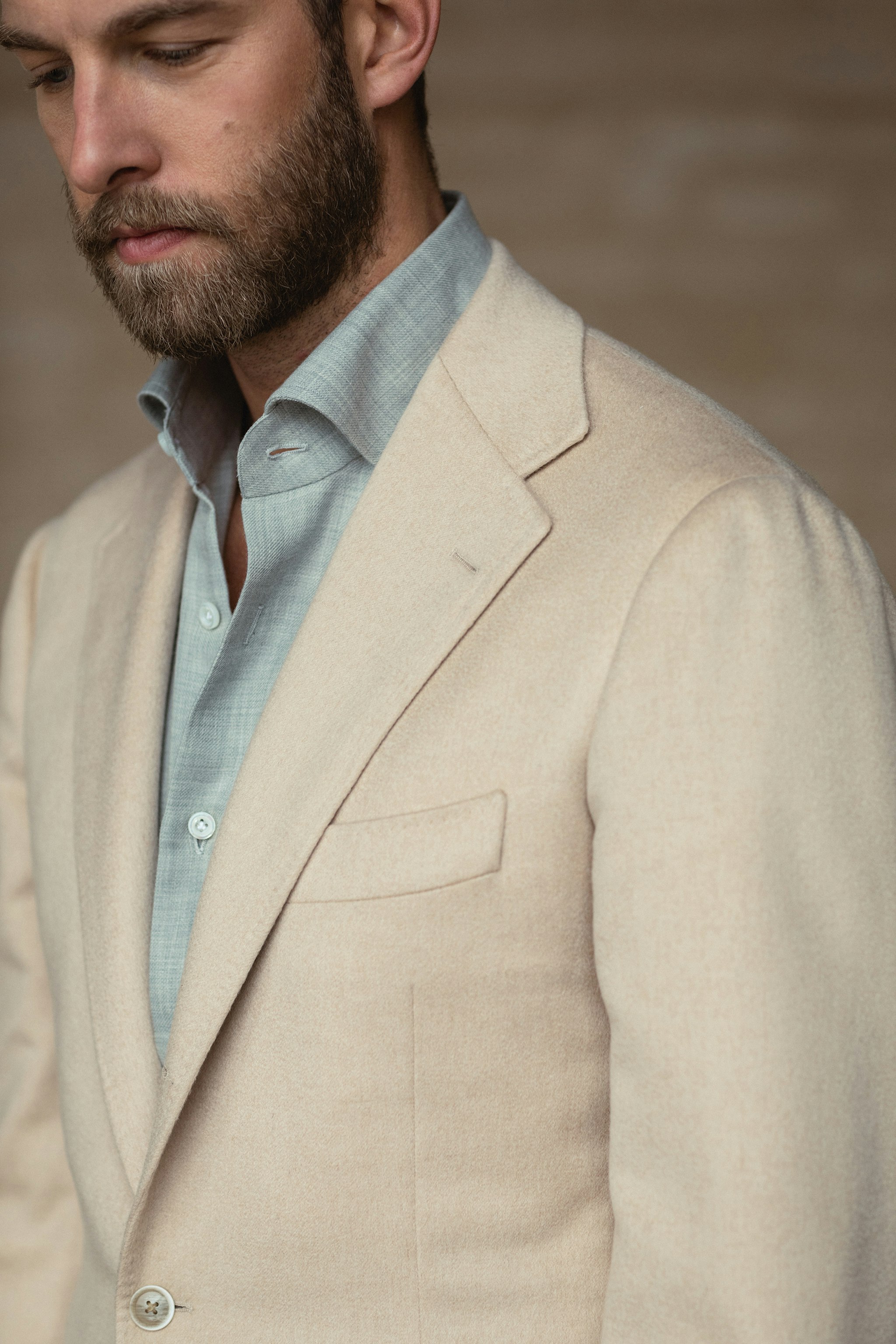 "I love the combination of light, soft and muted colors so my eye immediately caught the camel hair jacket in baby camel hair. It´s daring in some ways but I think it works wonderfully with soft shades of grey and moss. For this reason I opted for the light grey cotton/cashmere shirt made for The Armoury in Naples. I think the shade and matte finish combined with the beautiful collar makes it a casual yet elegant combination."