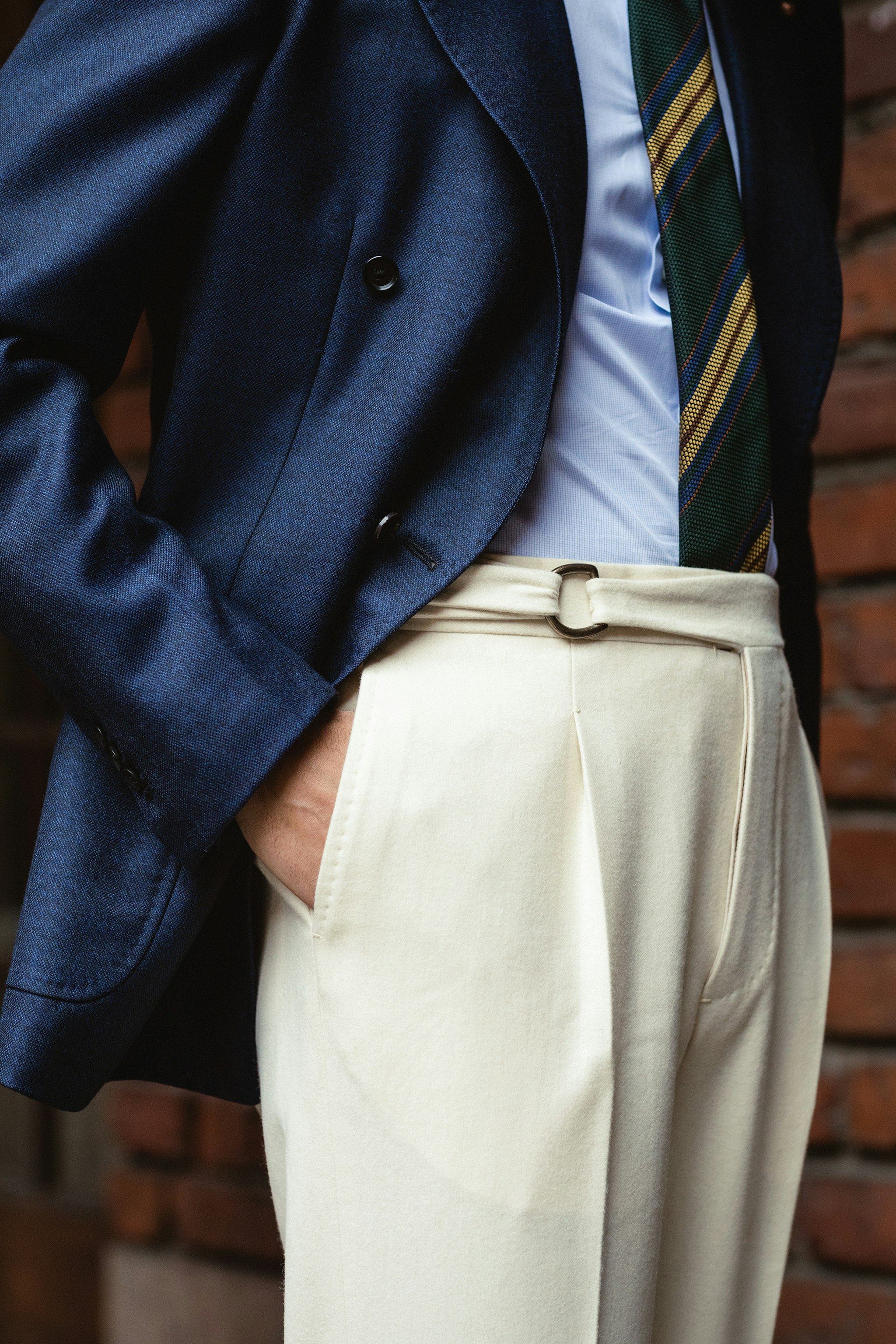 "This made it easier to combine with the PA1 trousers from Pommella in a lovely cream coloured flannel from Fox Brothers. I especially like the D-ring belted closure that is adjustable for optimal comfort. The handwork of the trousers is flawless and I prefer the fuller cut with a 2 inch cuff."