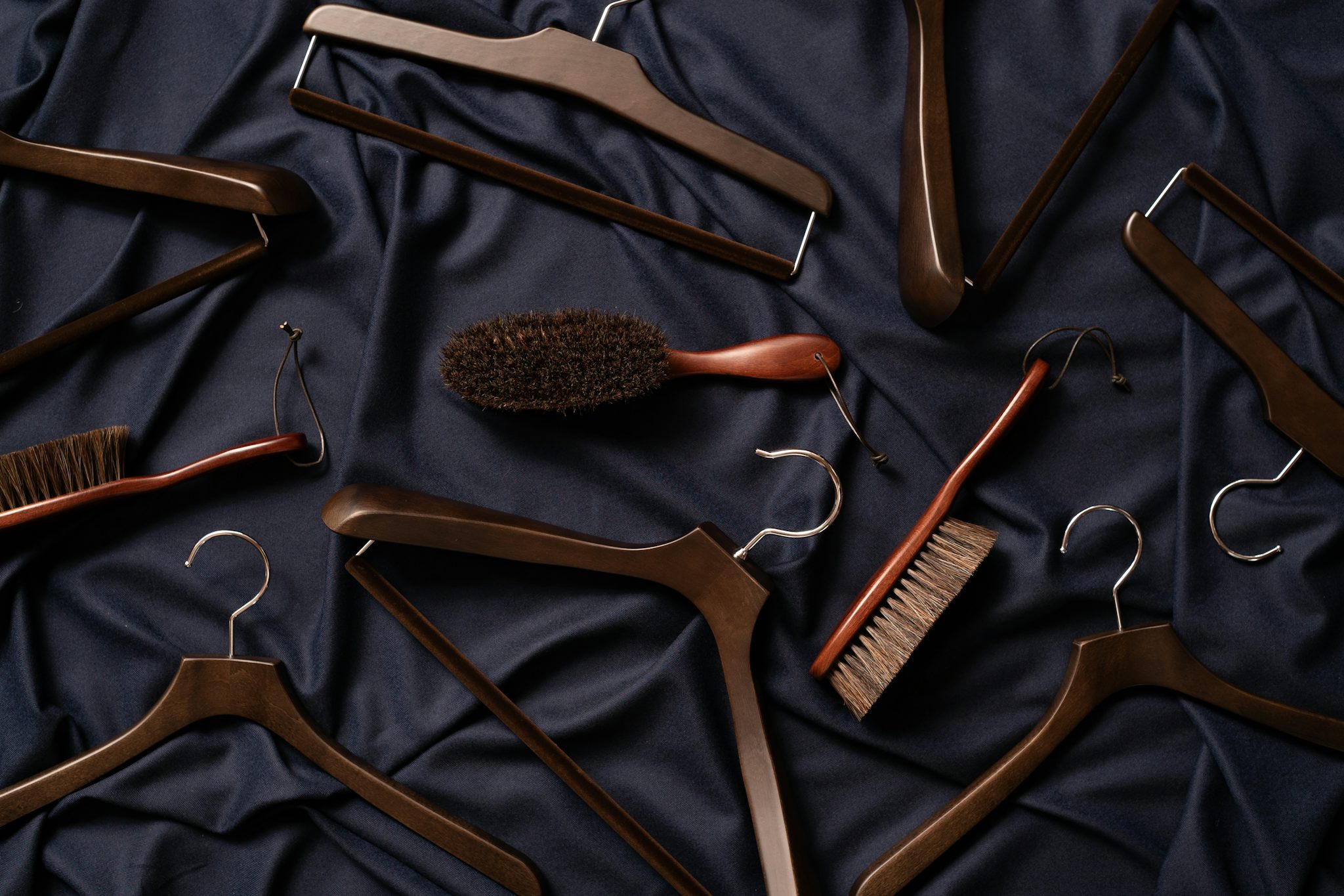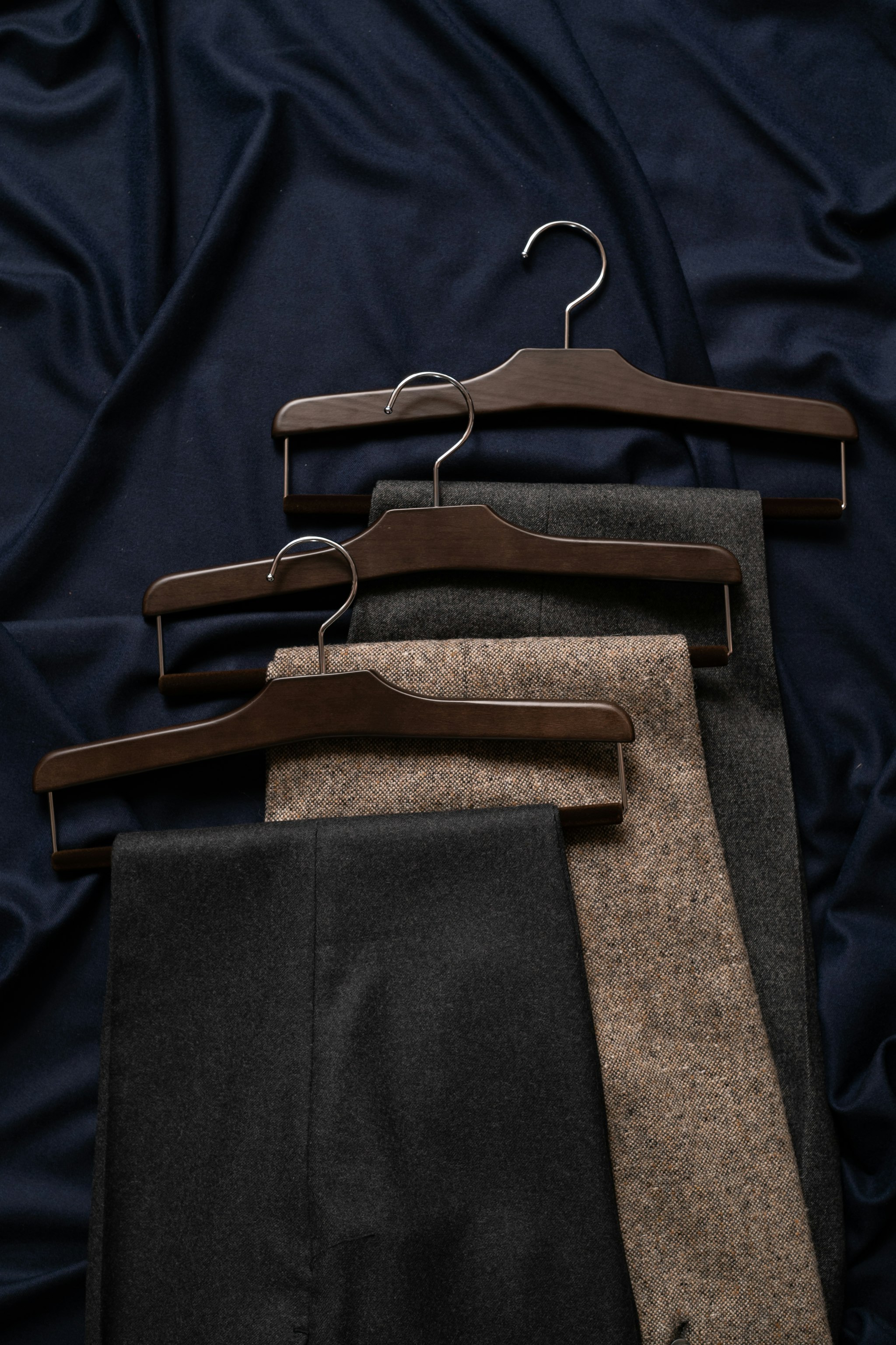 Wardrobes are built over time with considerable care and attention. One of the best things you can do for quality clothes is to support them with sturdy, well-shaped hangers. Just as shoe trees help maintain the shape of shoes, proper hangers will maintain the shape and creases of tailored clothing.