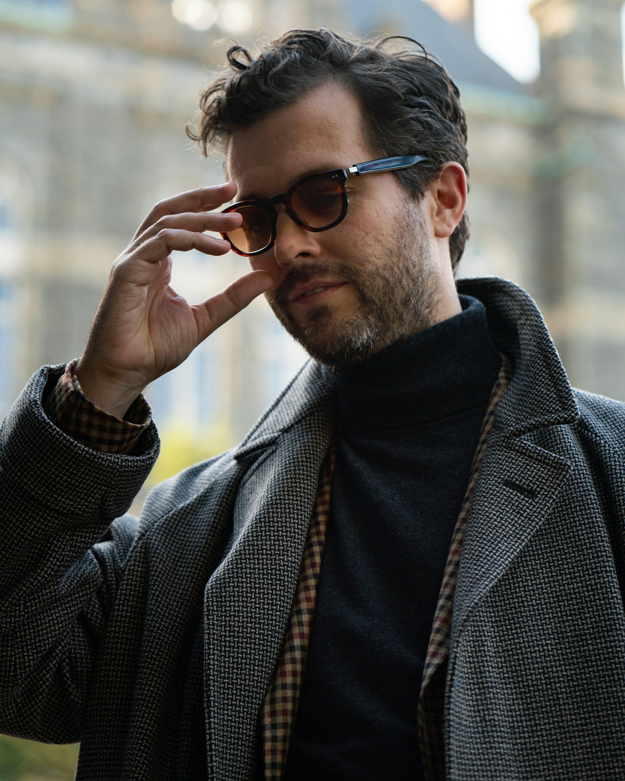 The Monocle model is inspired by a portrait from 1928 and features large front buttons, side vents, a slim lapel and collar.