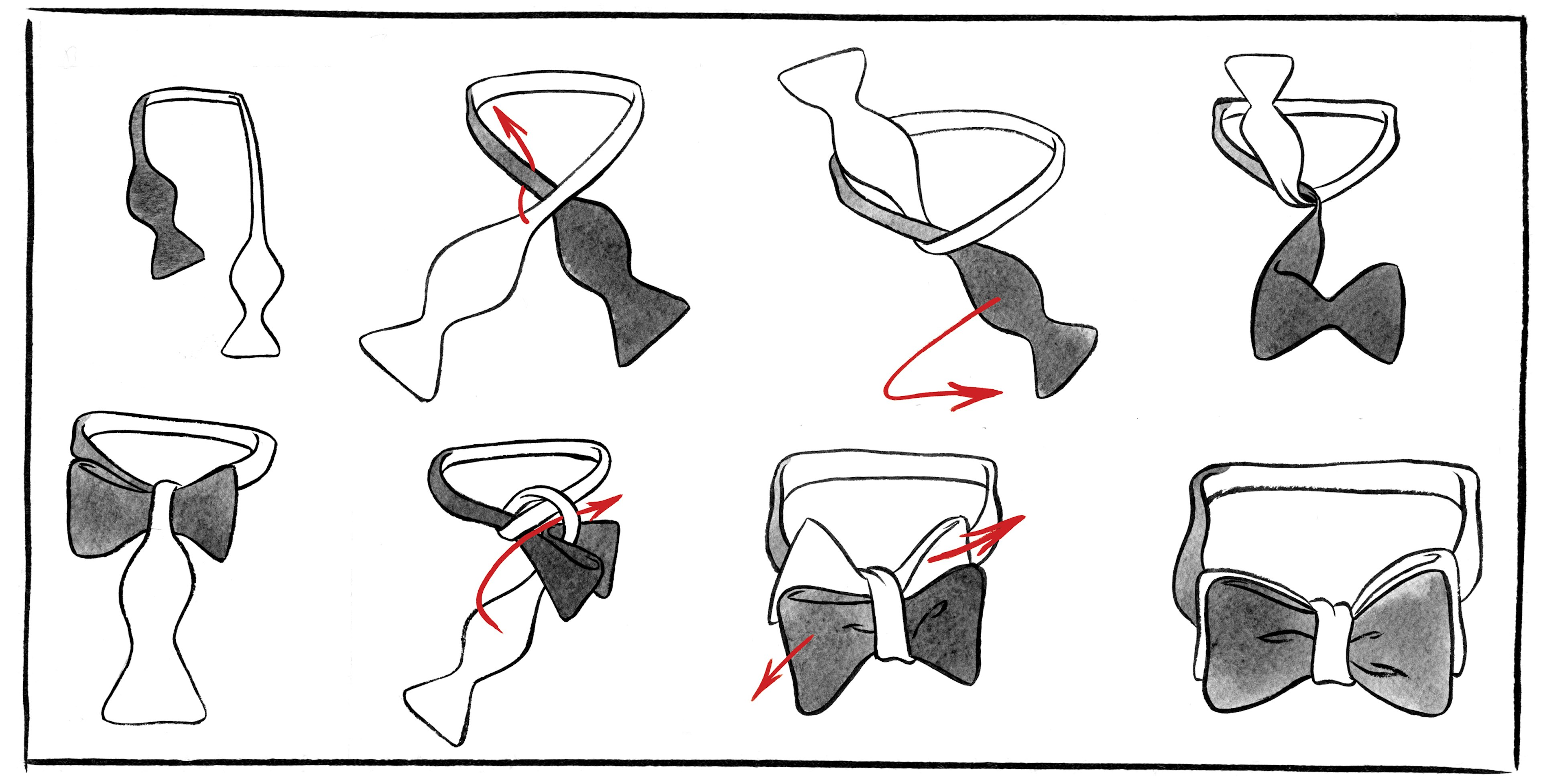 A last bit of help for tying your bow-tie. We suggest never using a pre-tied bow-tie—it doesn't have to be perfect but it does have to be tied.