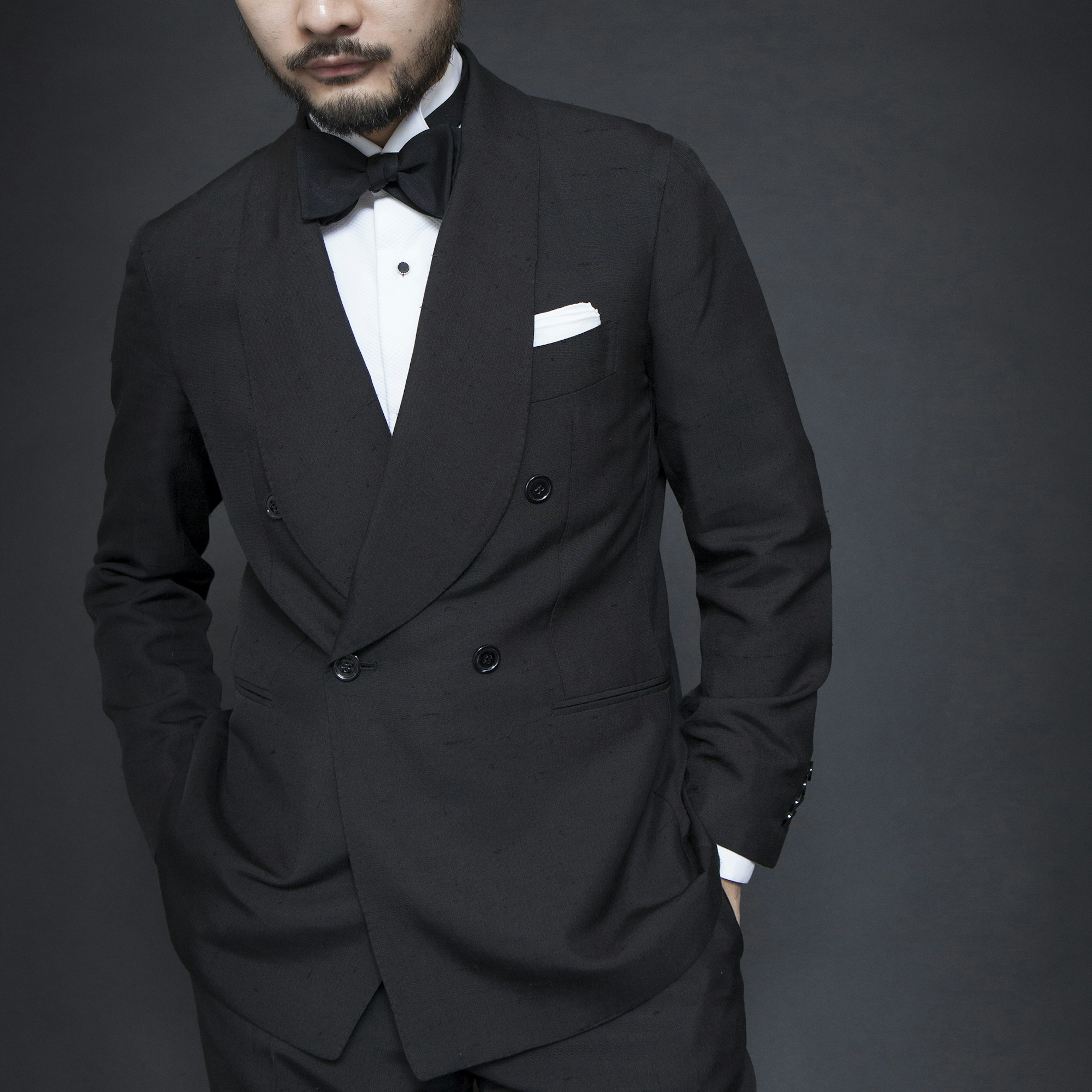 "The cloth for the tuxedo is made of pure silk, from the original Dupioni mill. They don't make this quality anymore, but we had them use their old looms to mill this batch of silk, which is more textured and breathable."