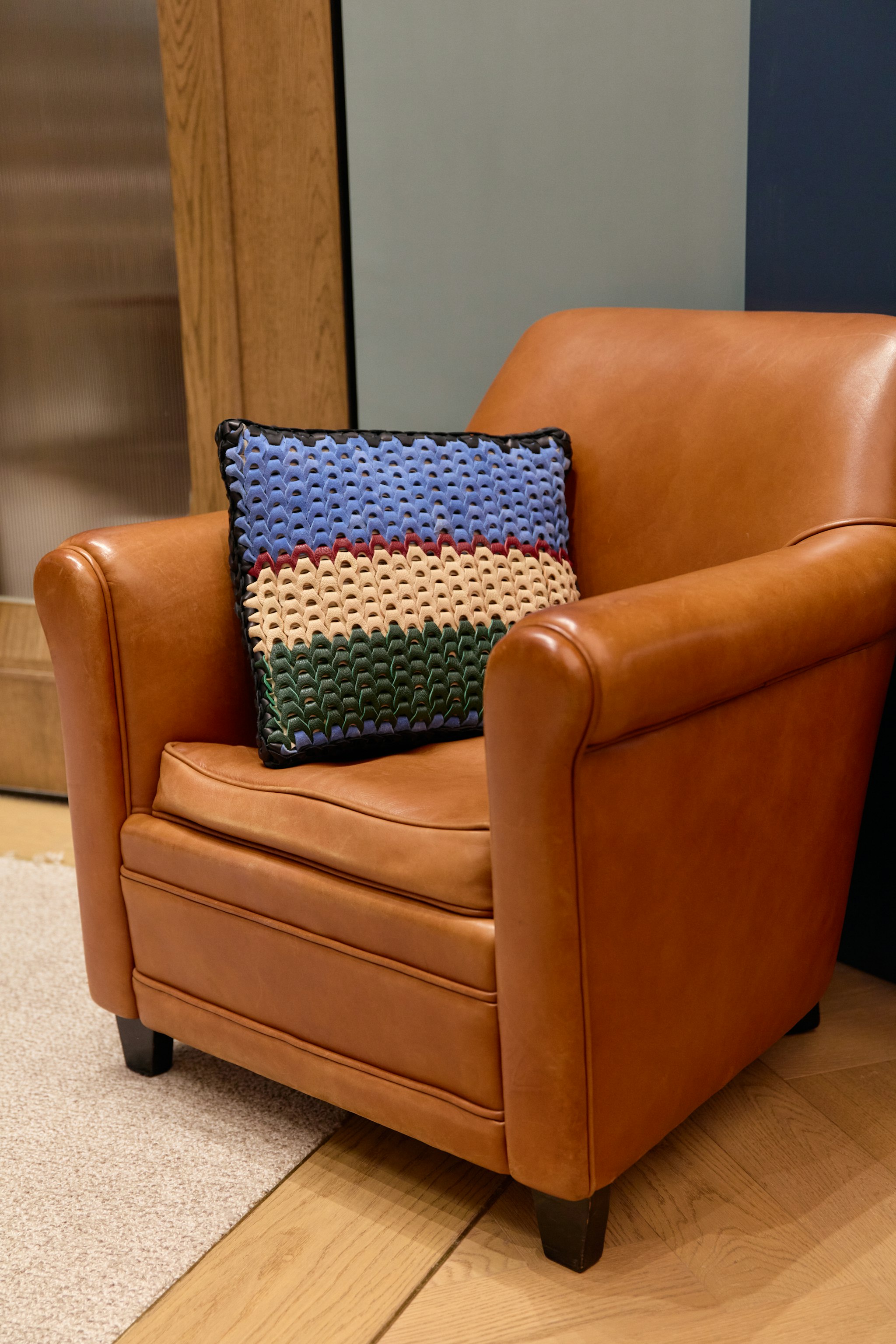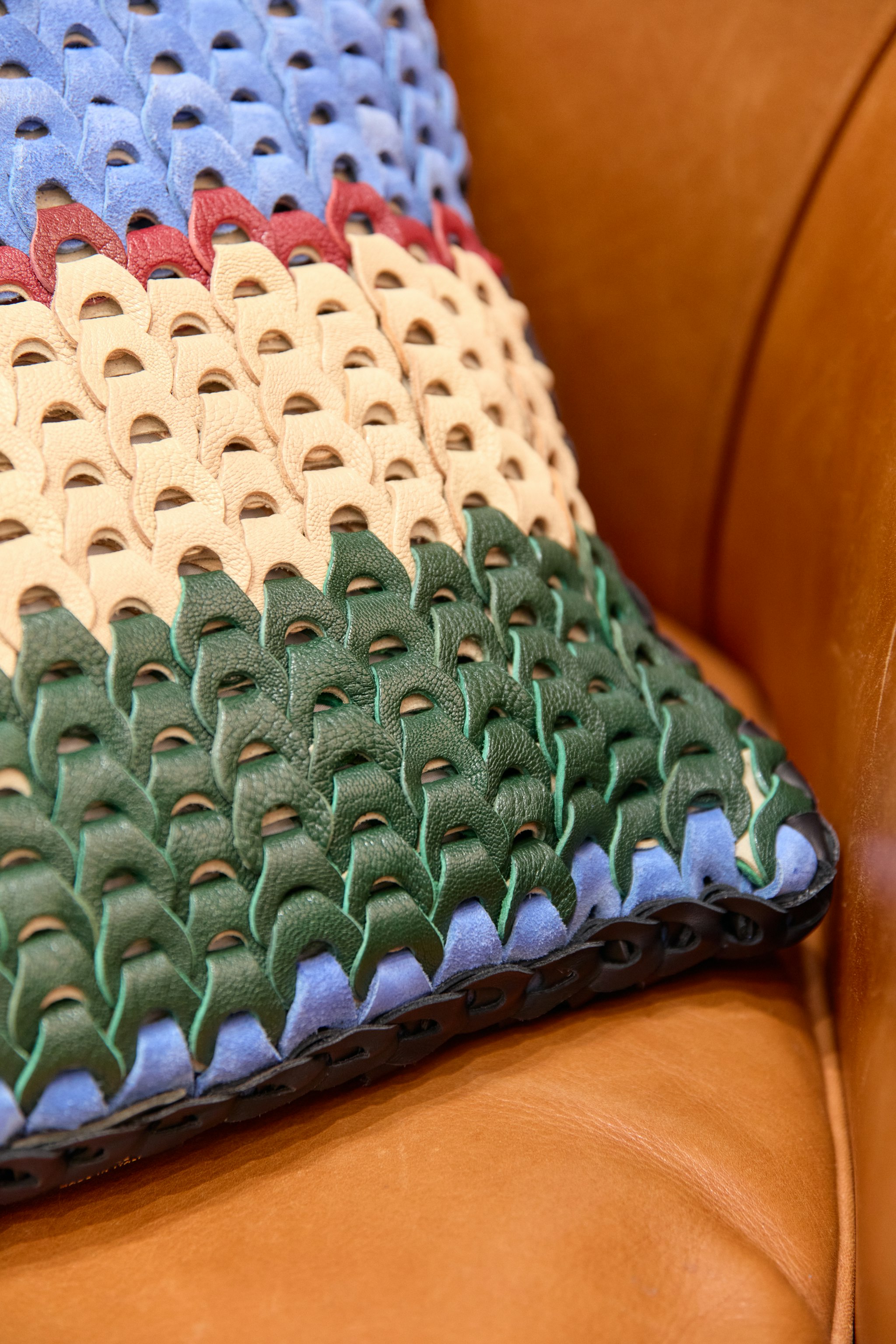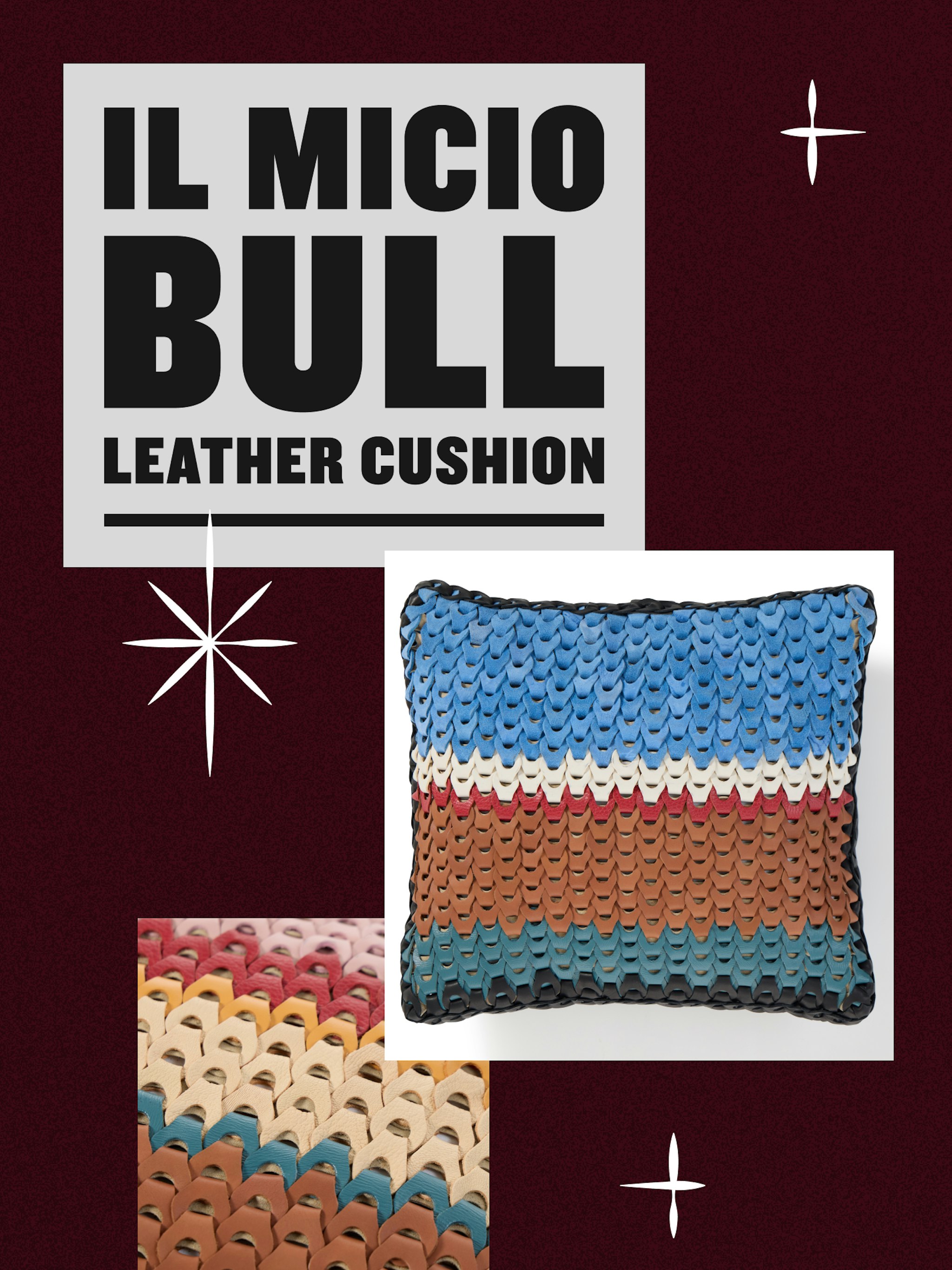 Tucked away on a small side street in Florence, Hidetaka Fukaya’s workshop creates small leather goods and bespoke shoes that showcase his unique personality, blending old world craftsmanship with bright colors and interesting raw materials. The Il Micio leather cushion is crafted with bullhide leather in the signature Il Micio woven ring design. Each cushion is one of a kind and is offered in a variety of colors to complement your favorite seating.