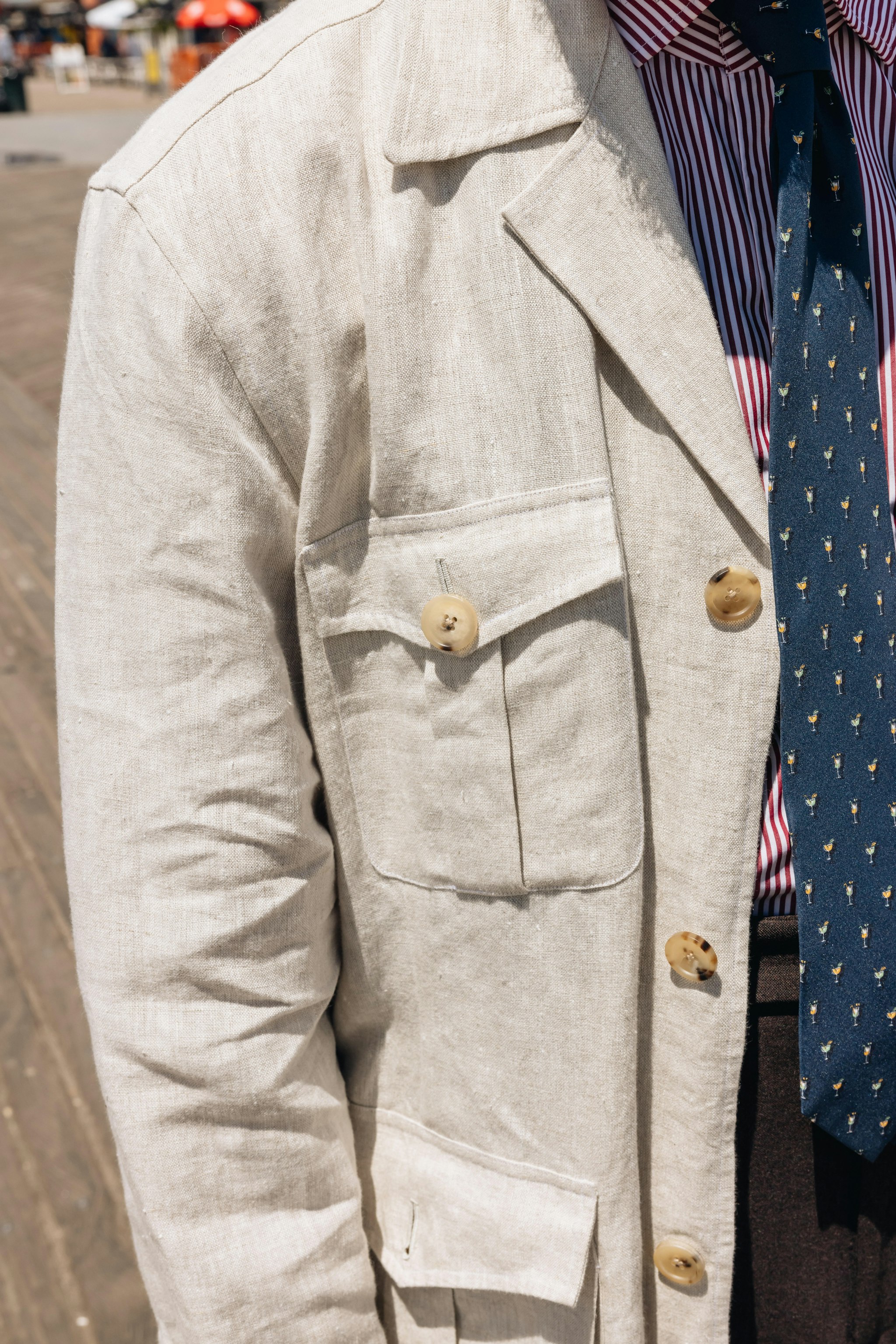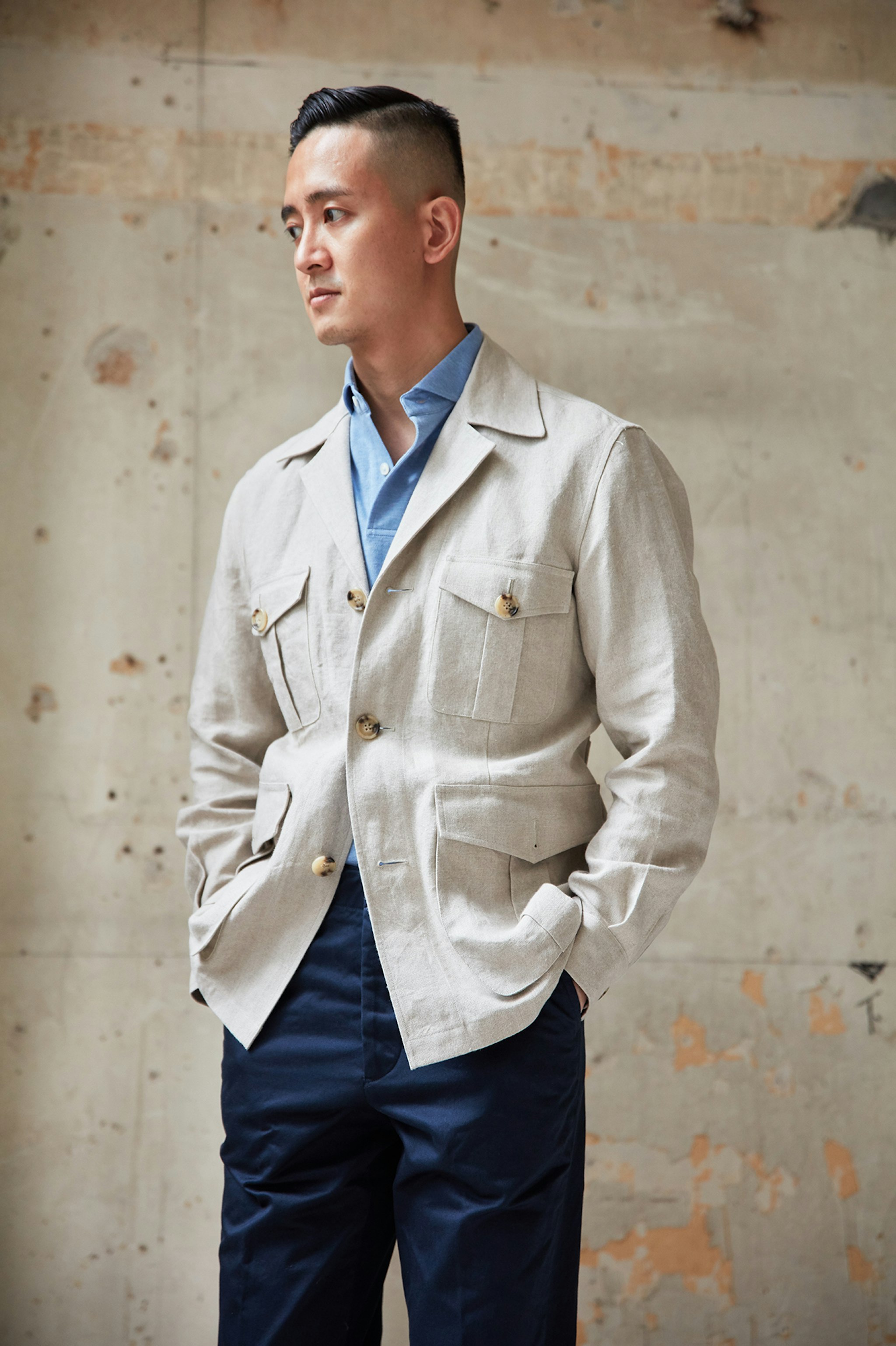 Made-to-order Safari Jackets are a signature choice for Stephon. He prefers a softer, slubbier natural-toned Irish Linen that makes a great summer option that resists creasing better than lighter weight linens.