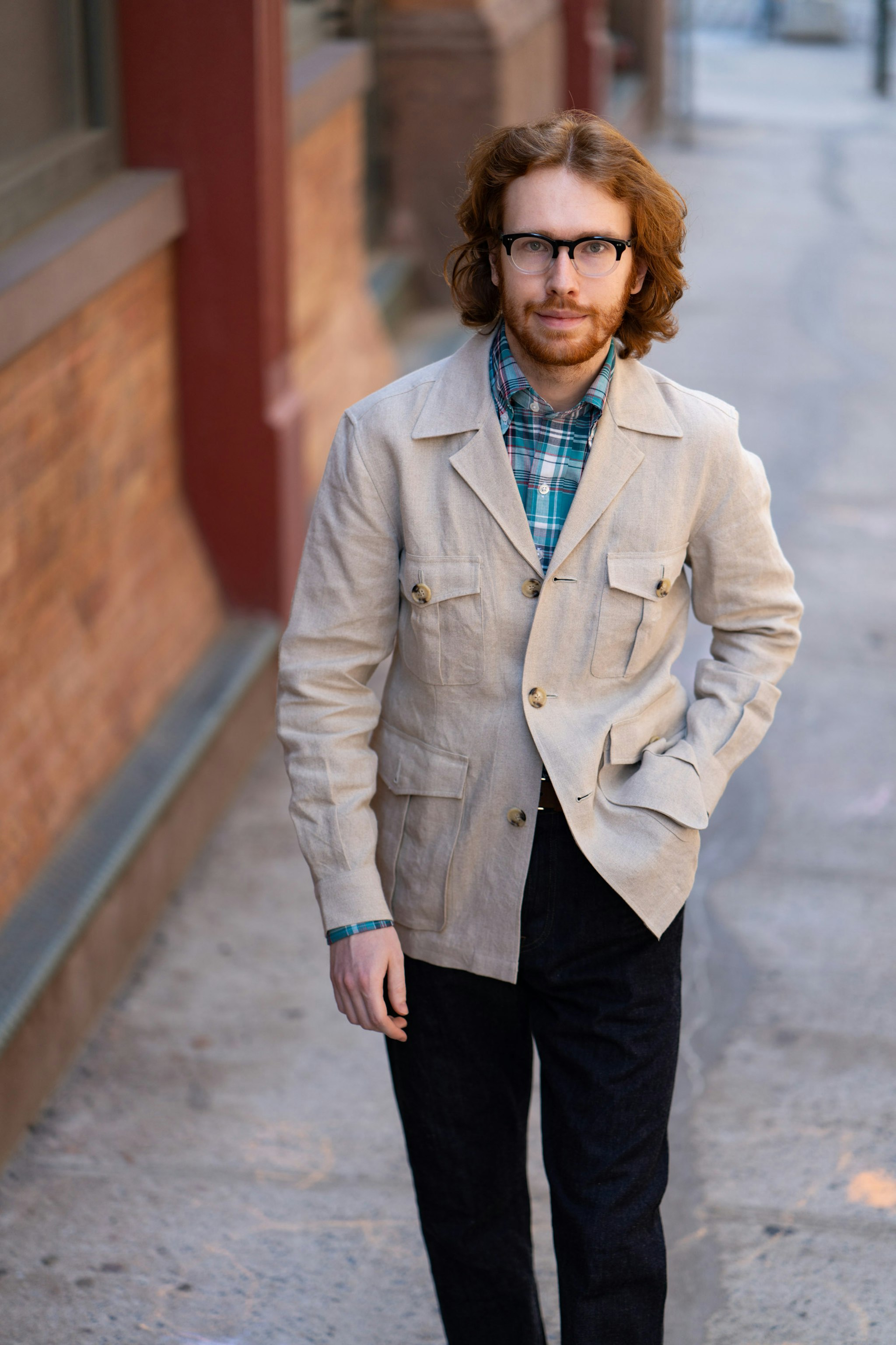 “Since joining The Armoury, I’ve collected at least eight Safari jackets. They’re incredibly versatile, allowing me to play with different fabrics. My latest is a high-twist wool from Harrison's Spring Ram collection in a brown glen plaid—perfect for summer.