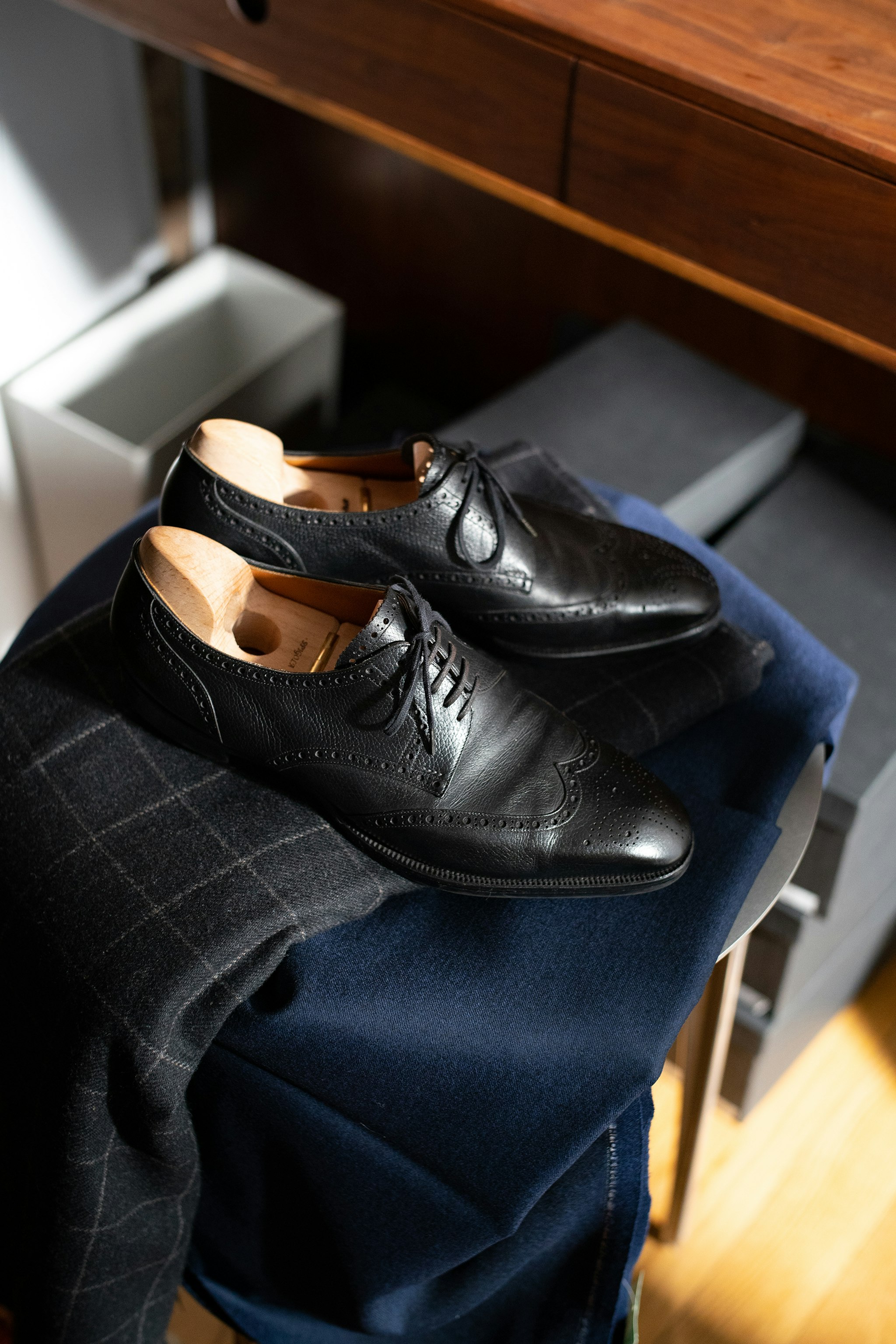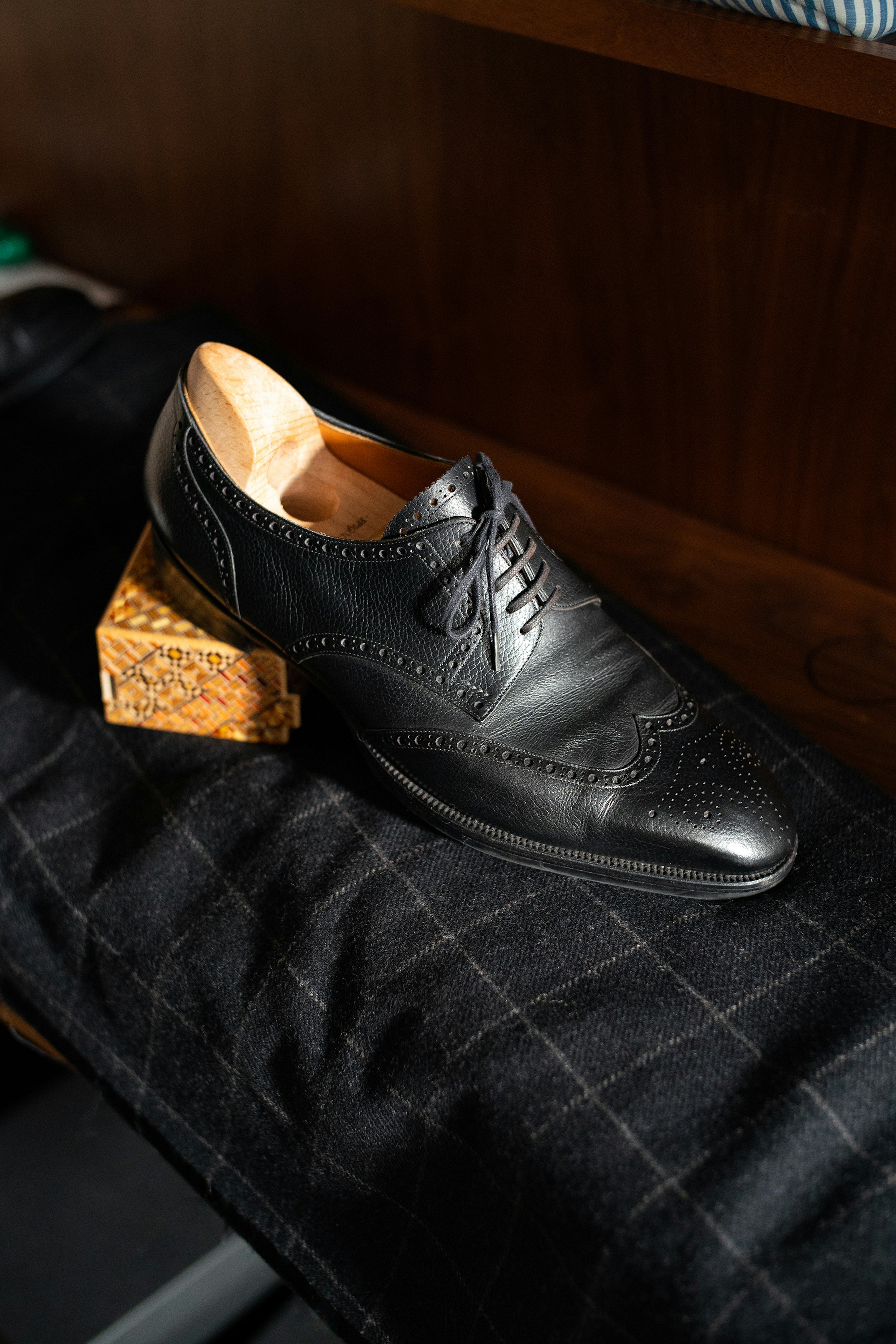 "After years of selling Kojis without commissioning a single pair it occurred to me that each trunk show I was drawn to the same beautiful sample, a simple wingtip brogue derby. After that realization the choice was simple, I needed those wingtips. I wanted something with a lot of presence, as I don't really like dainty shoes, so I had Koji make the toe rounder than usual and we coupled that with a double Dainite sole and a wide welt. Black scotch-grain leather finishes the whole thing off giving the shoe a certain handsome but not-too-bulky silhouette. "