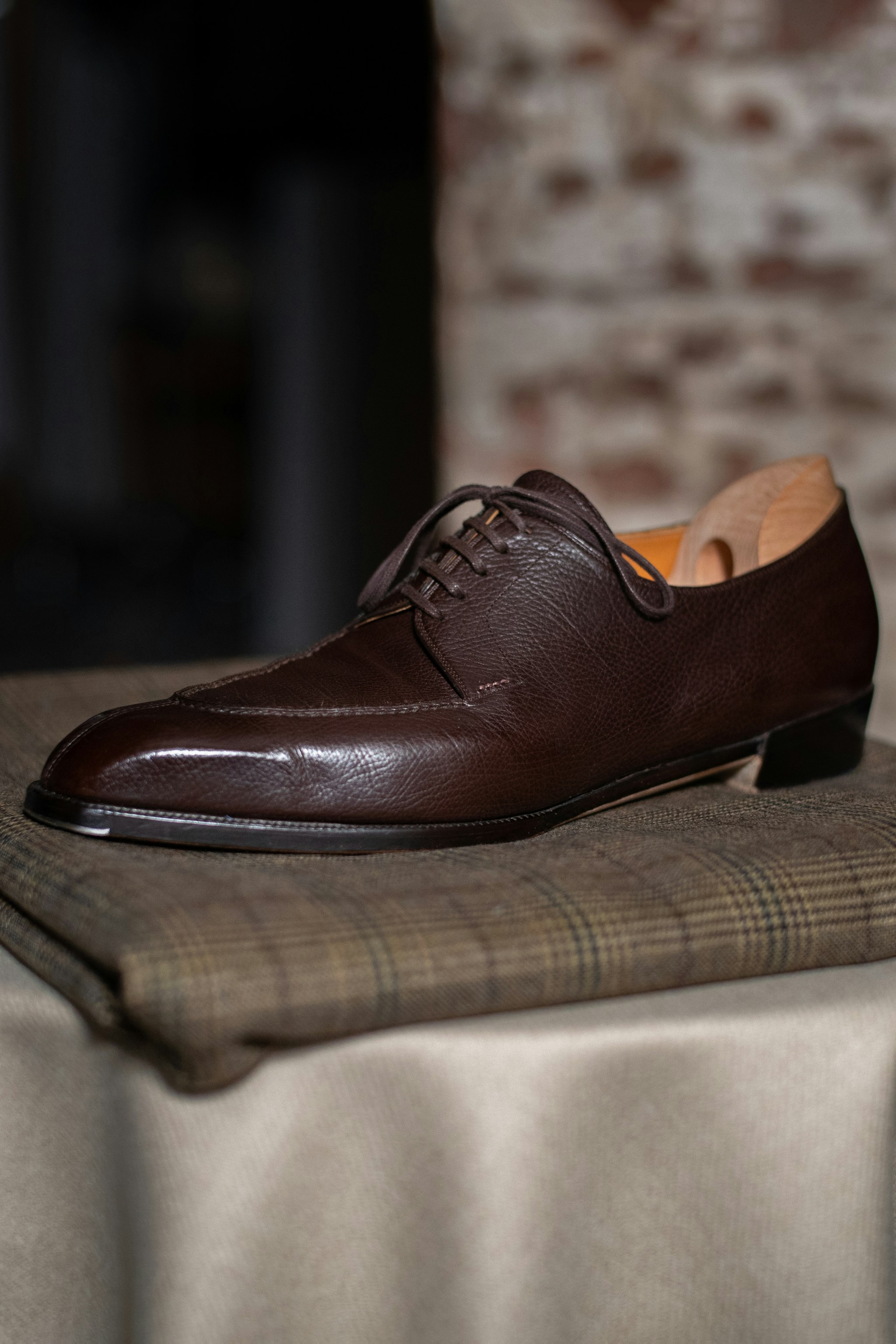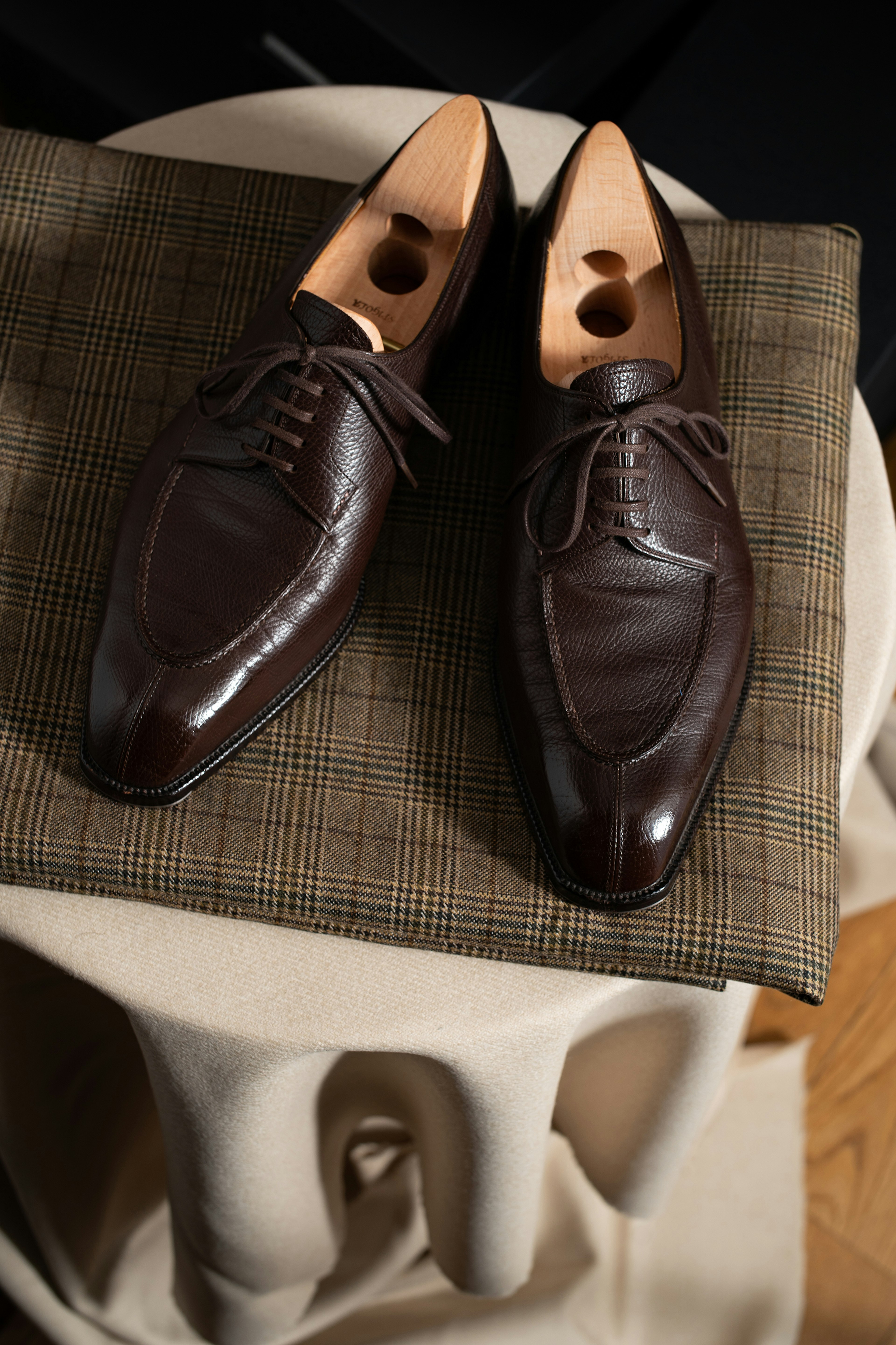 "These derbys were my first pair from Koji, taking his standard split-toe design and adding a hand-sewn apron and chiseled toe. The leather is super soft, making them extremely comfortable and resilient. I really like how the hard angles along the toe are balanced out by the rounded apron."