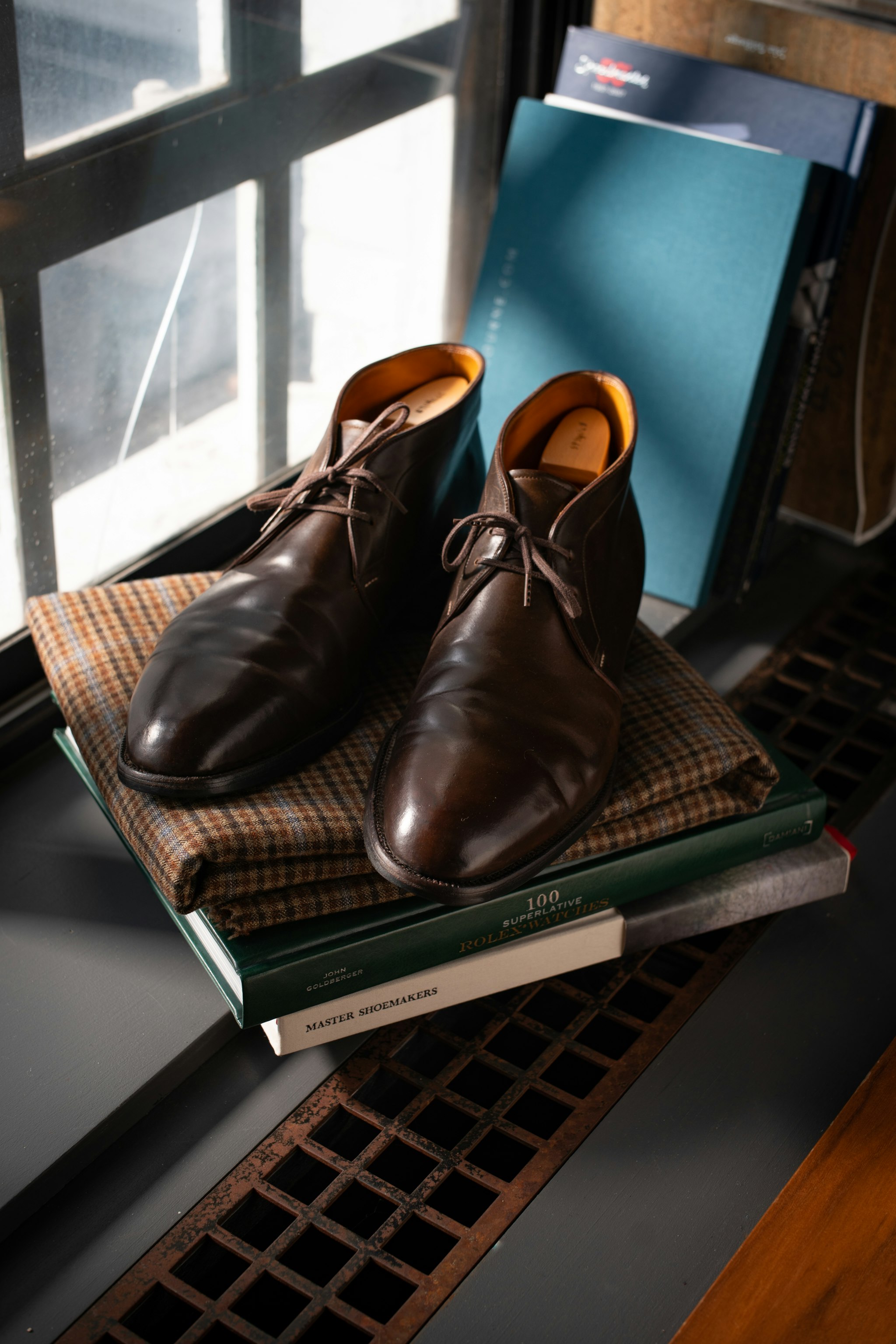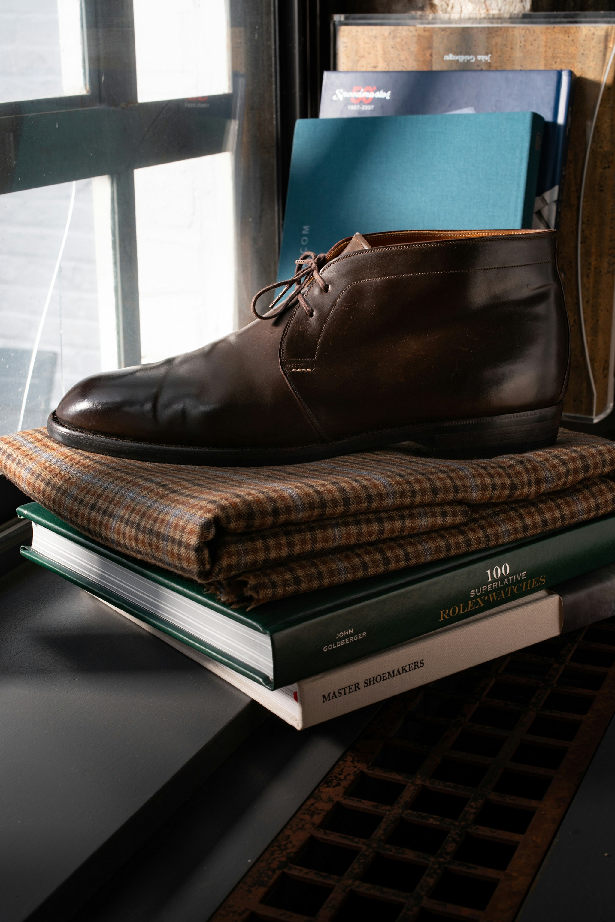 "I love chukka boots, and I wanted to make my ultimate version of them with this commission. Shoes that are too sleek or chiseled look a bit odd on my long, narrow feet, and Koji accommodated by rounding off the toe and extending the welt, making these feel a bit more rugged. I've obviously worn these hard for a few years now, and I particularly like how the rolls of the cordovan have developed slight variations in color--it reminds me of finish checking on a vintage guitar."