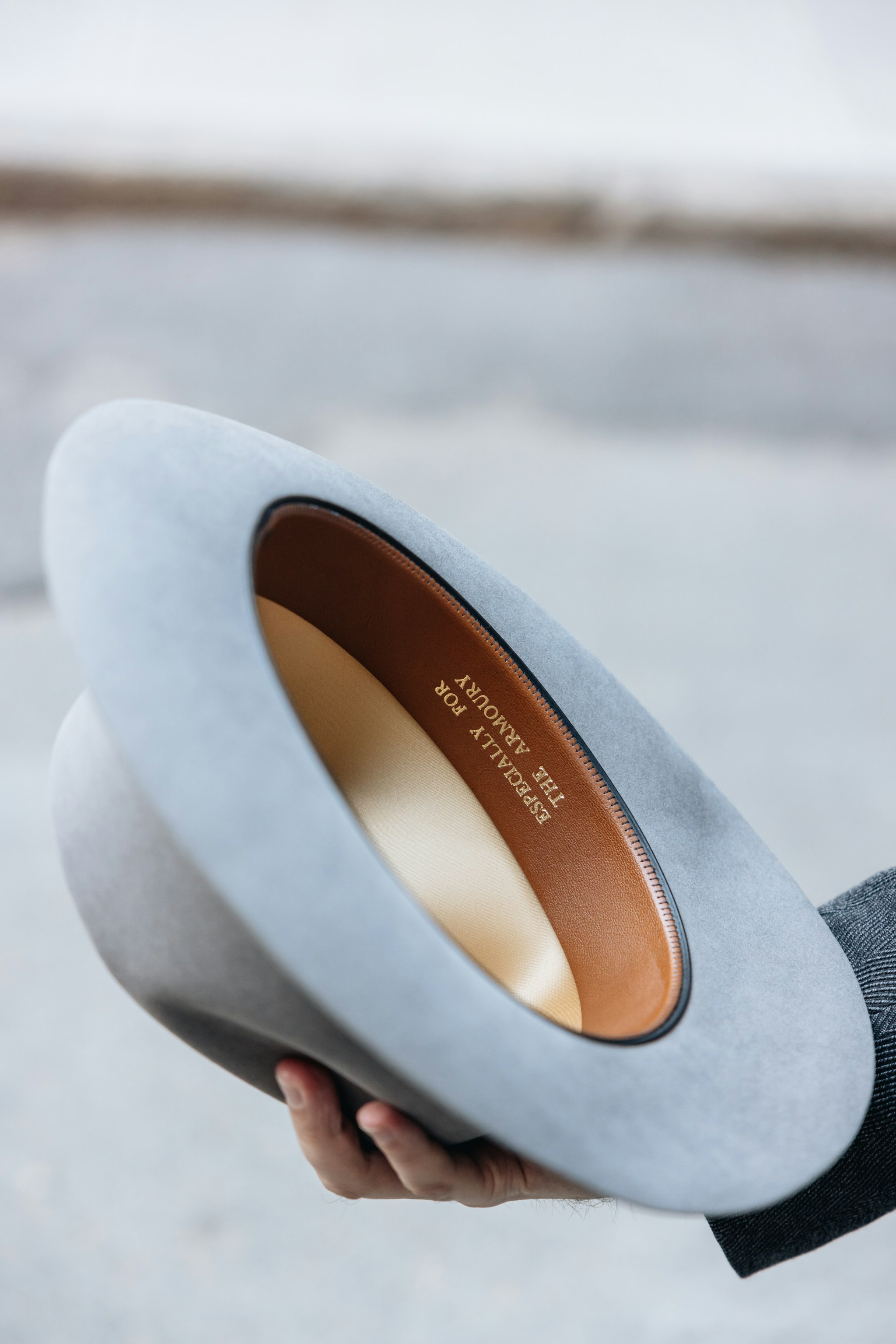Inspired by the hats worn by early country music singers like Hank Williams, this piece tows the line between a cowboy hat and classic fedora. Made from a dress weight beaver fur felt, lighter in weight than typical cowboy hats. The western fedora features a gamblers bow, and a bound edge which is whipstitched by hand.
