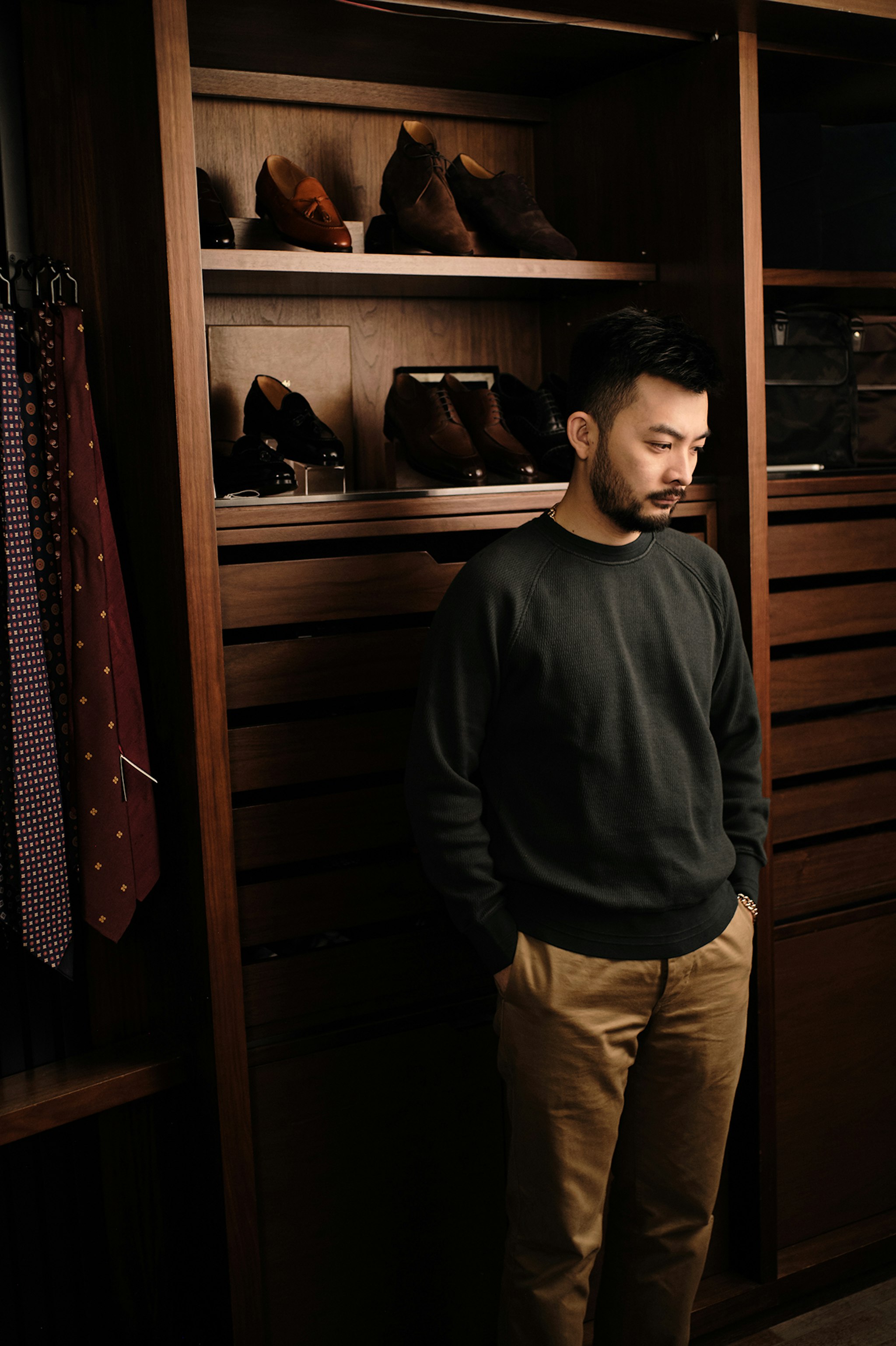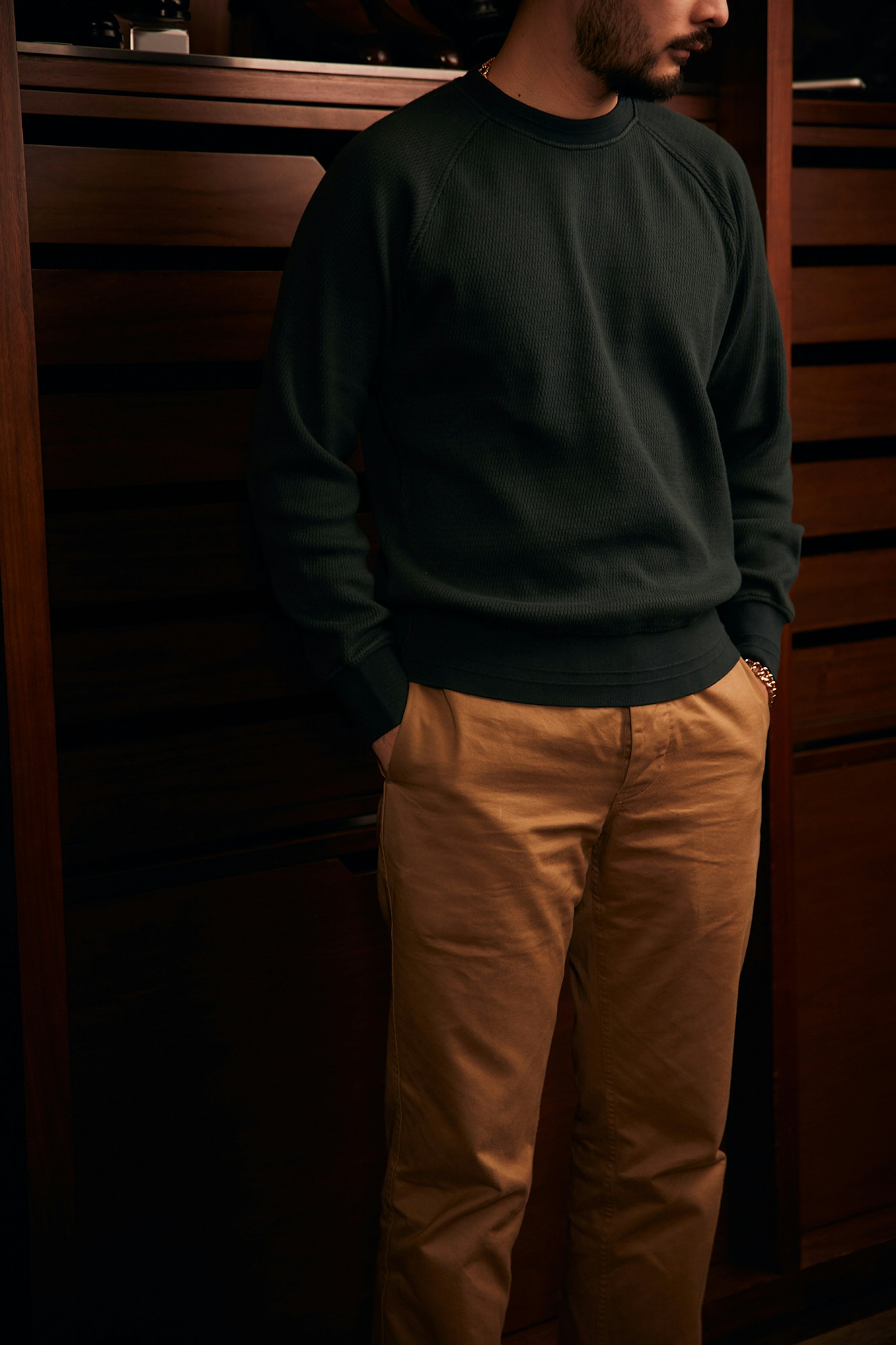 Our sweatshirts are yarn dyed instead of piece-dyed, which gives them a pleasingly irregular color similar to vintage melange fabric. Our sweatshirts fit are a little shorter to accommodate our higher-rise chinos and denim.
