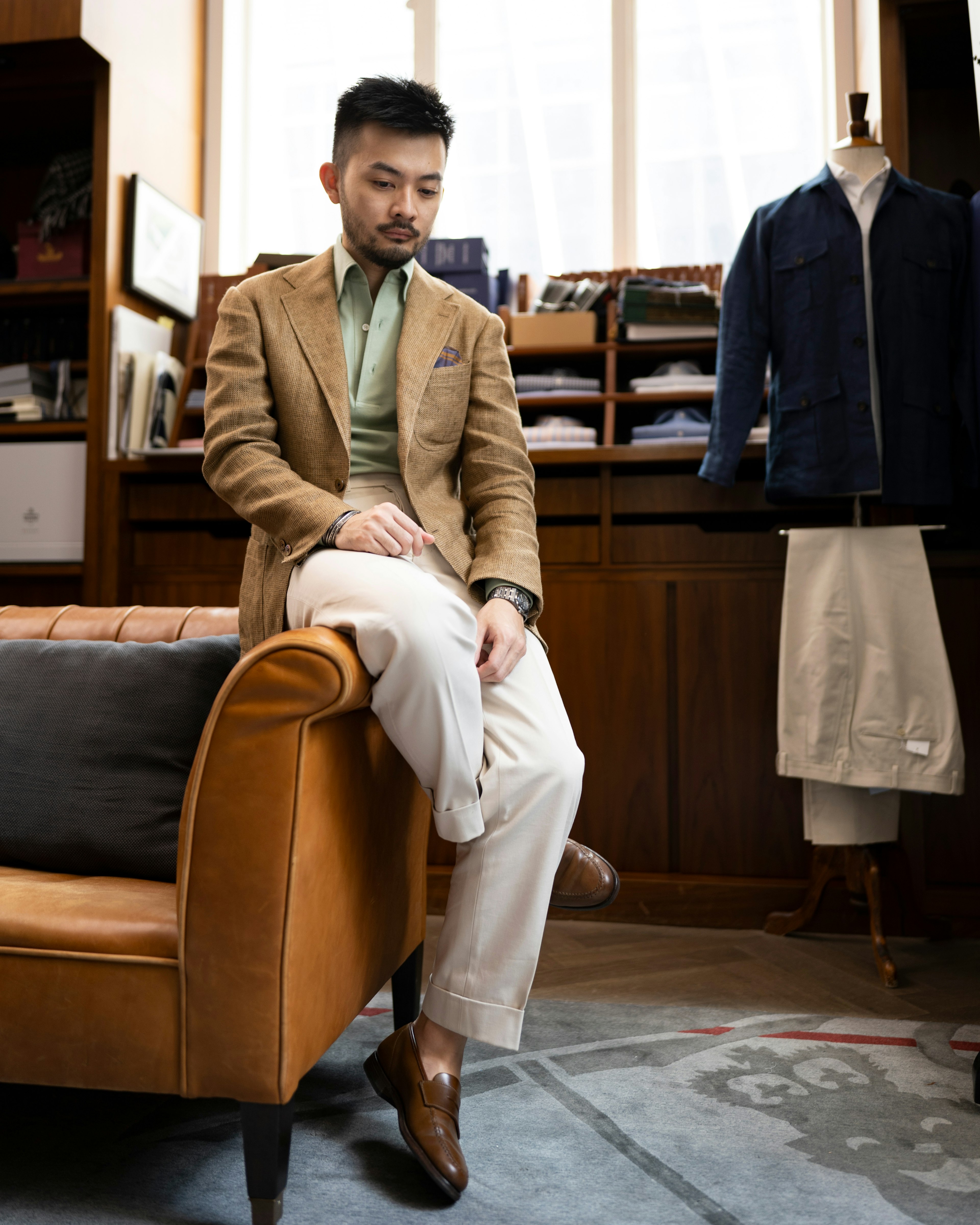 Jan's tan linen jacket was commissioned through our made-to-order program. Our team can help guide you through the thousands of unique swatches to make something specifically for you.