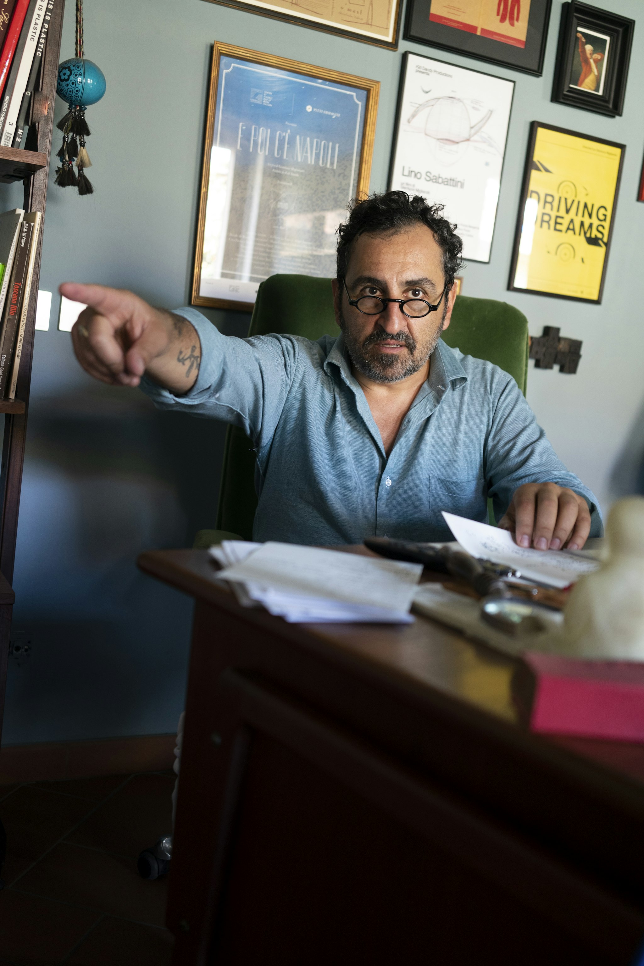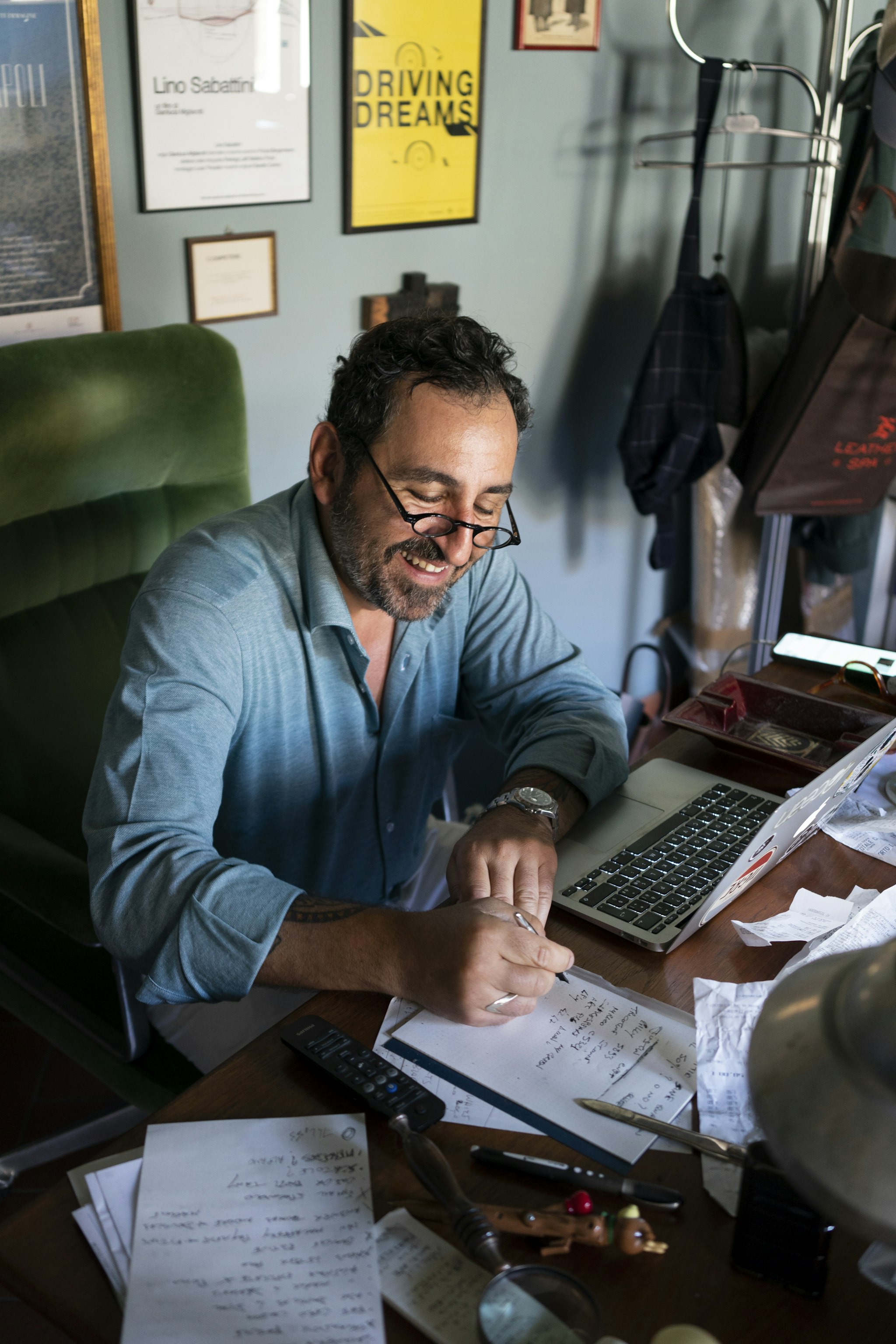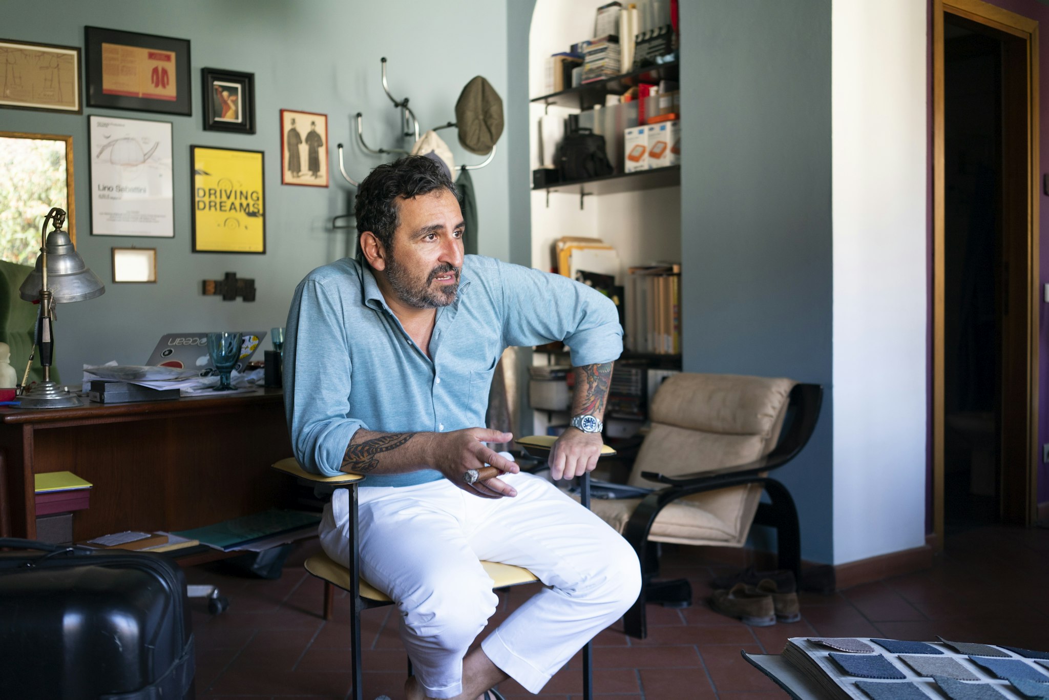 He also wears olive flannel trousers from Pommella Napoli, which he commissioned at a London trunk show. In culinary terms, they were made in the “chef’s choice.” “When he came to our trunk show, I offered to choose a fabric for him,” says Pommella co-founder Gianluca Migliarotti. “He was like, ‘sure, sure, you choose.’ I flipped through some books and landed on an olive Fox flannel. Palazzi agreed, so we made the trousers after the trunk show. Some time passed, and when I was back in London, I invited Douglas Cordeaux of Fox Brothers to come with me to The Duke’s Bar, where I was planning to hand deliver the trousers. So we went together.”
