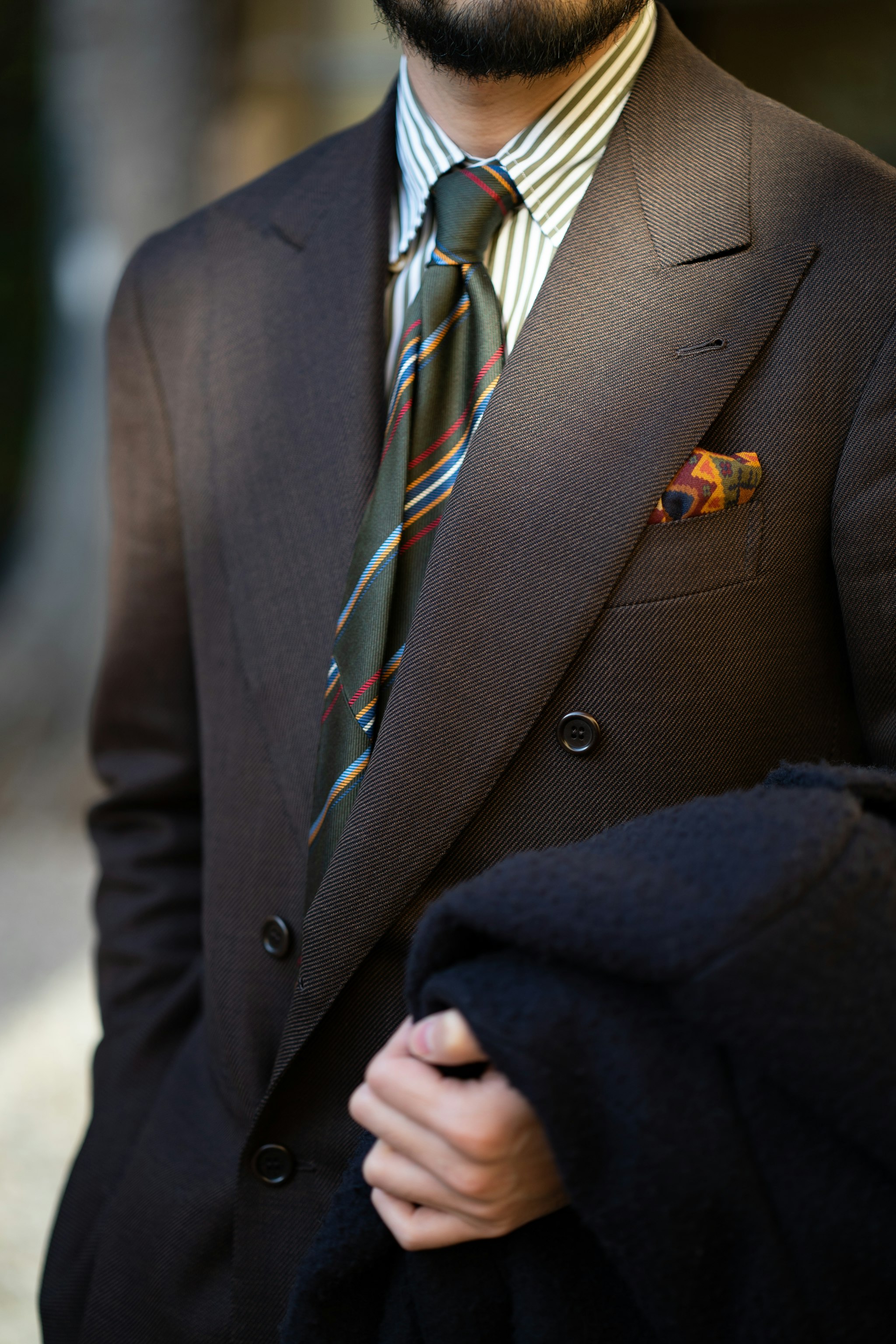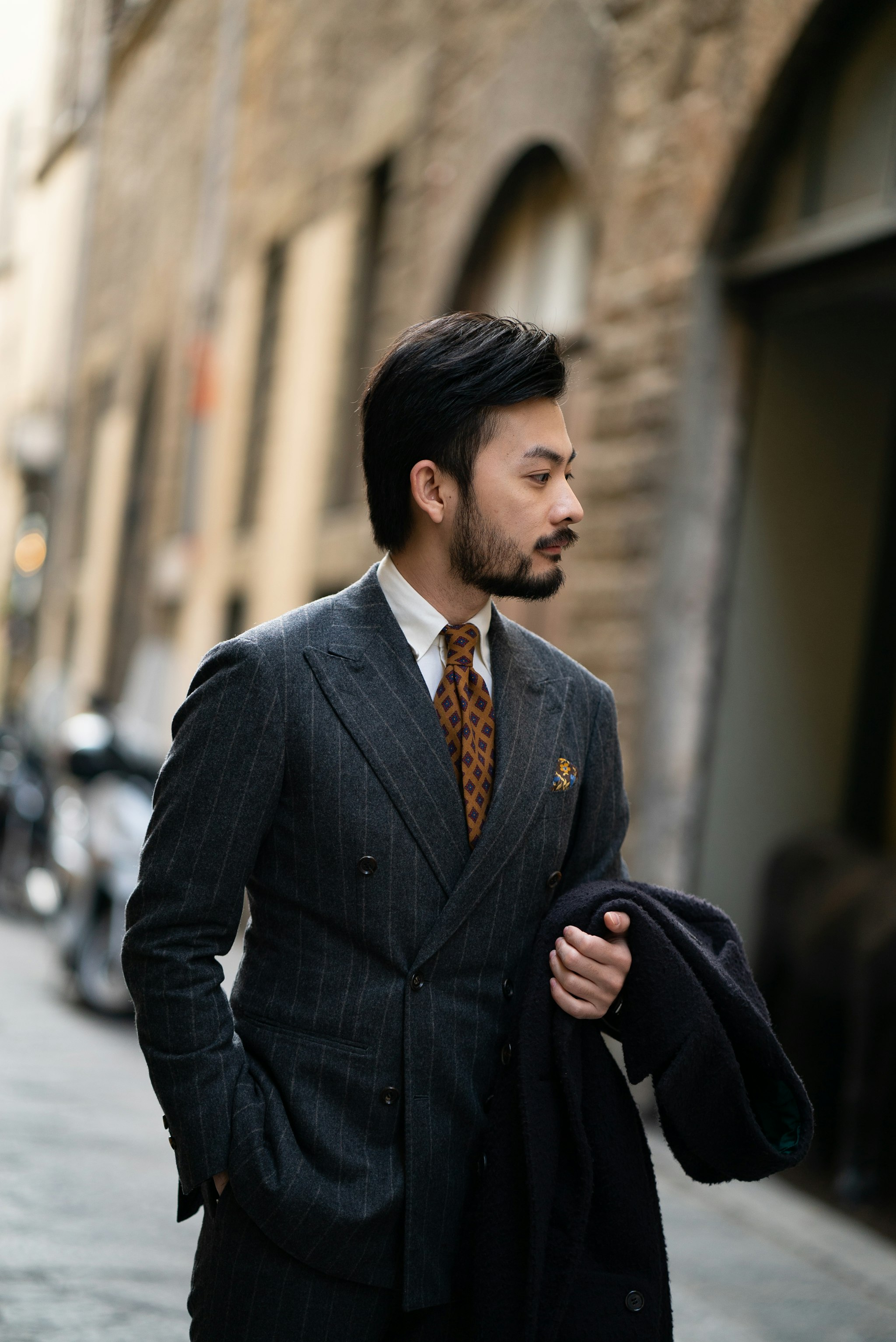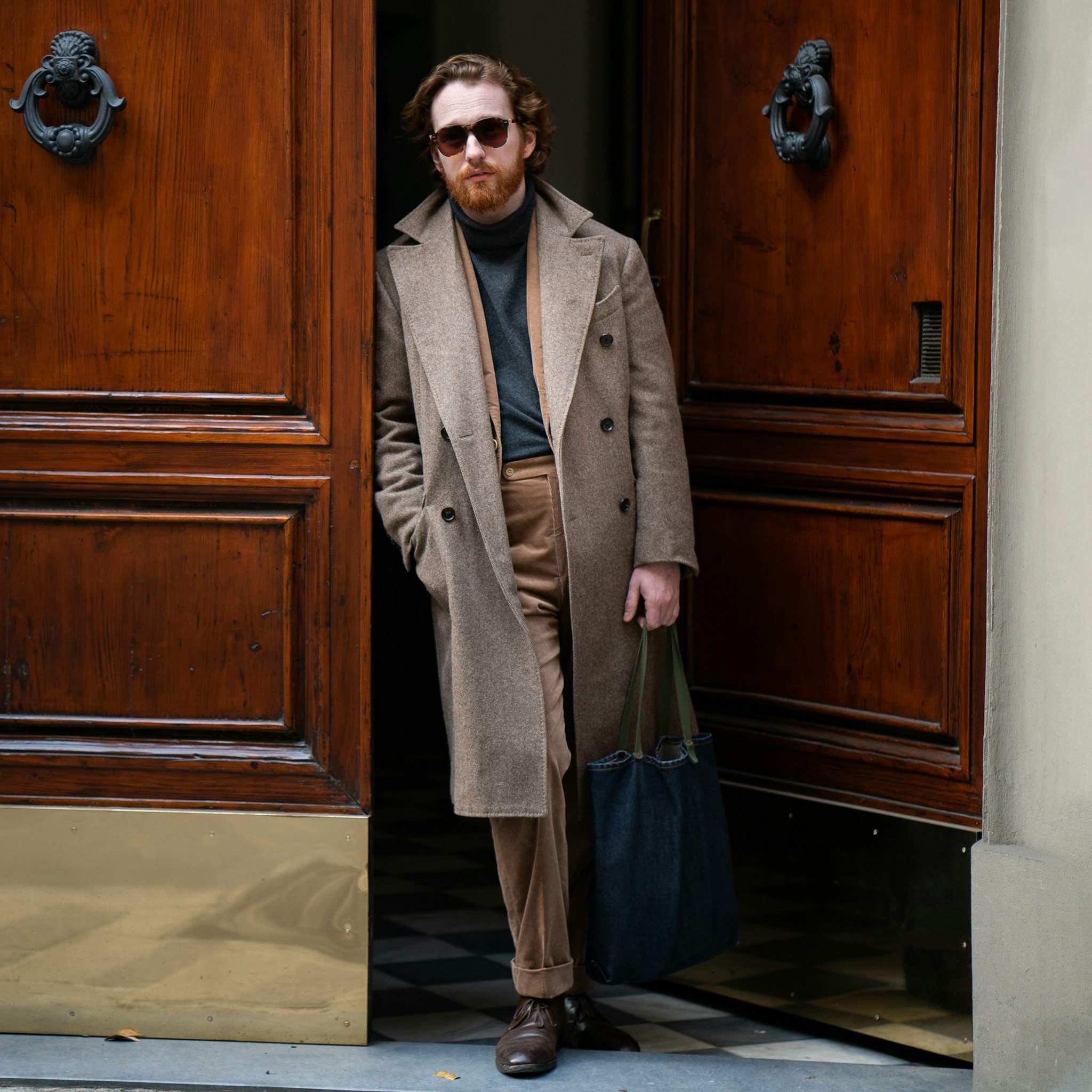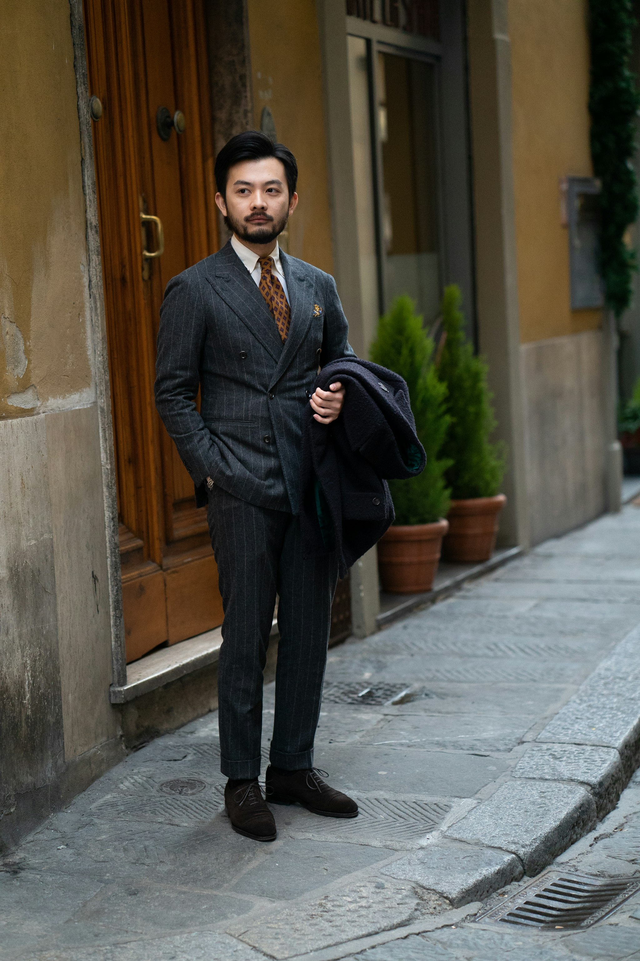 Jan is wearing a bespoke double-breasted suit by Liverano & Liverano in a brown wool twill by Vitale Barberis Canonico paired with a tie by Florentine maker Tie Your Tie. His bespoke Casentino Coat is made by Liverano & Liverano and features a vintage Navajo pin from the 1930's.