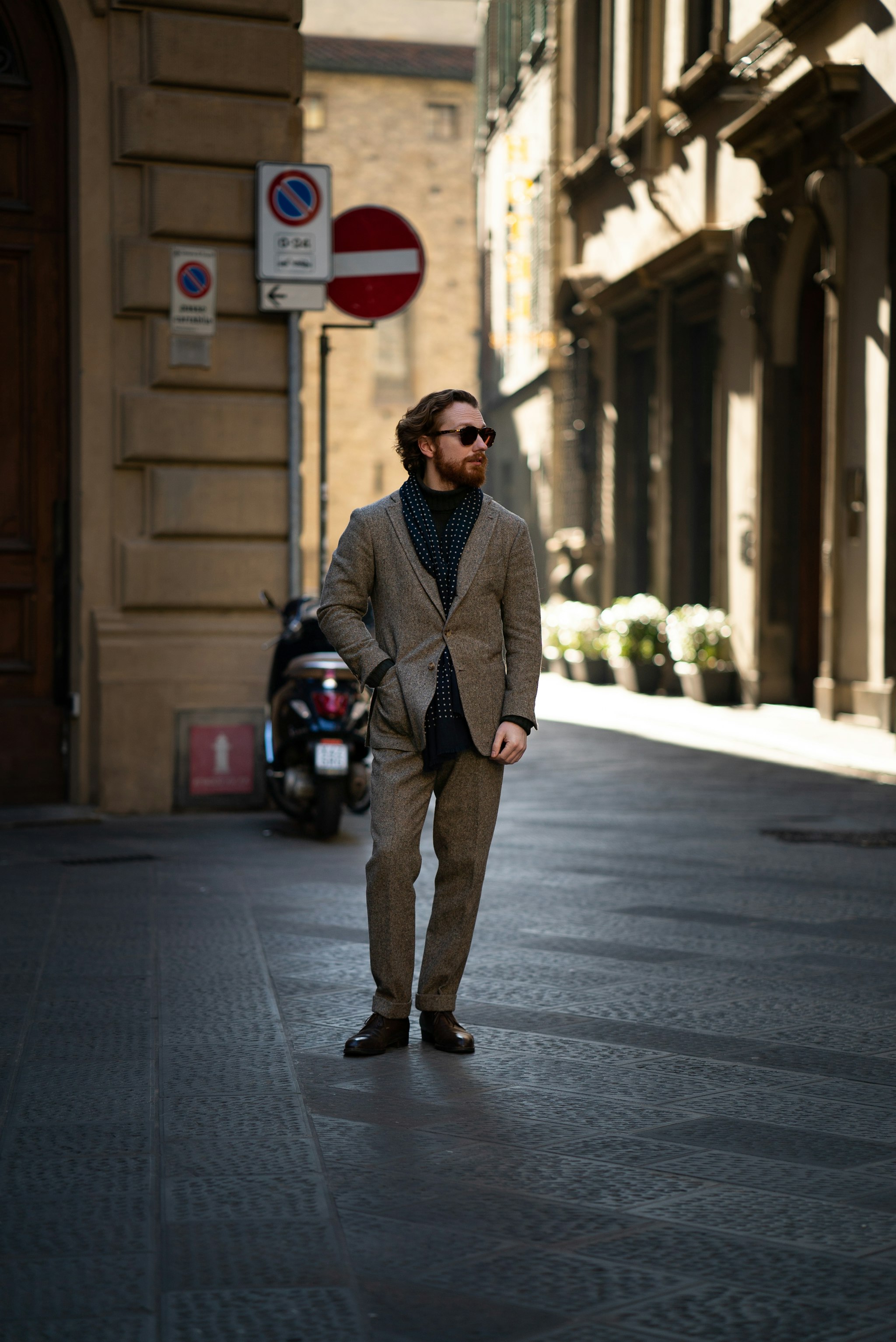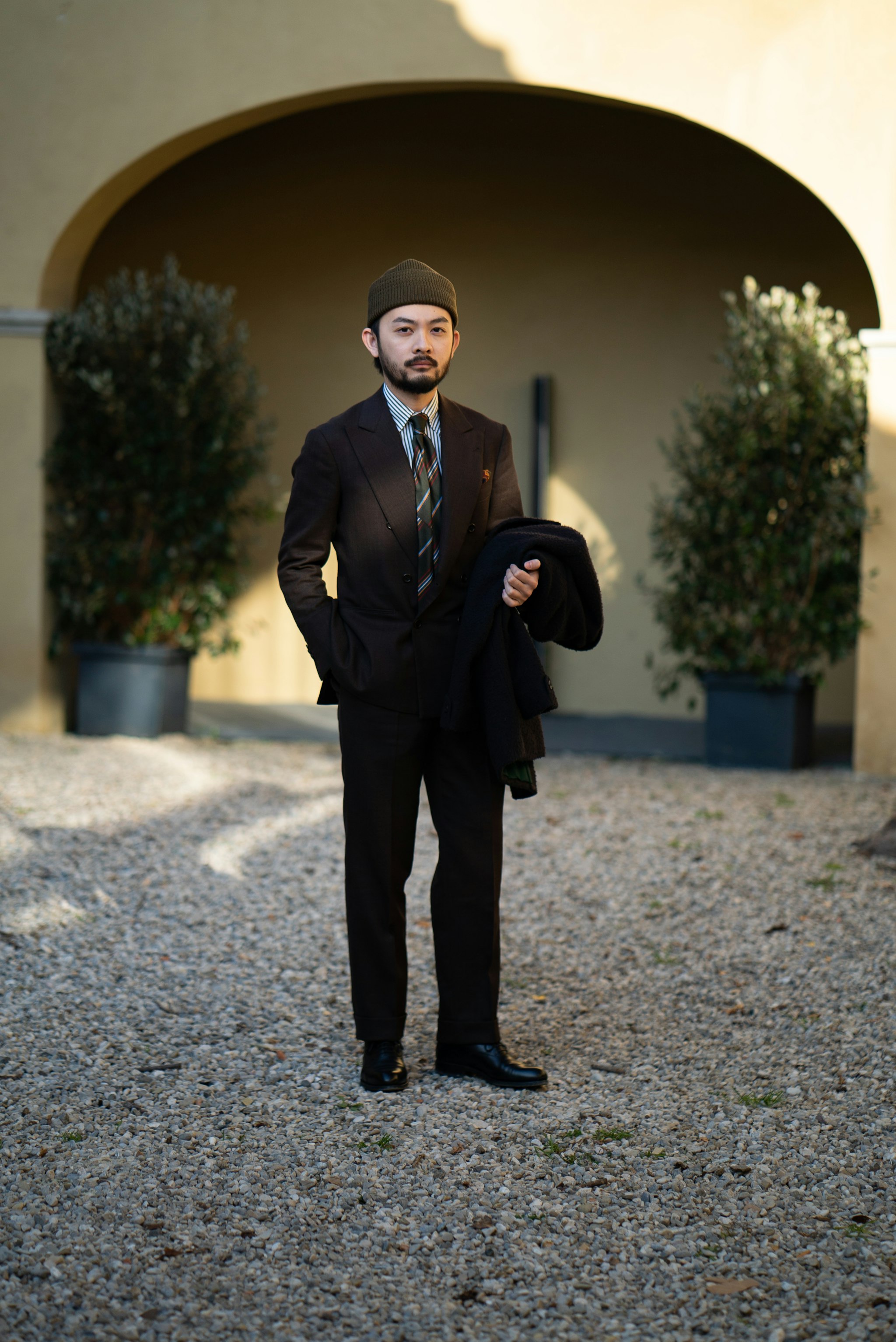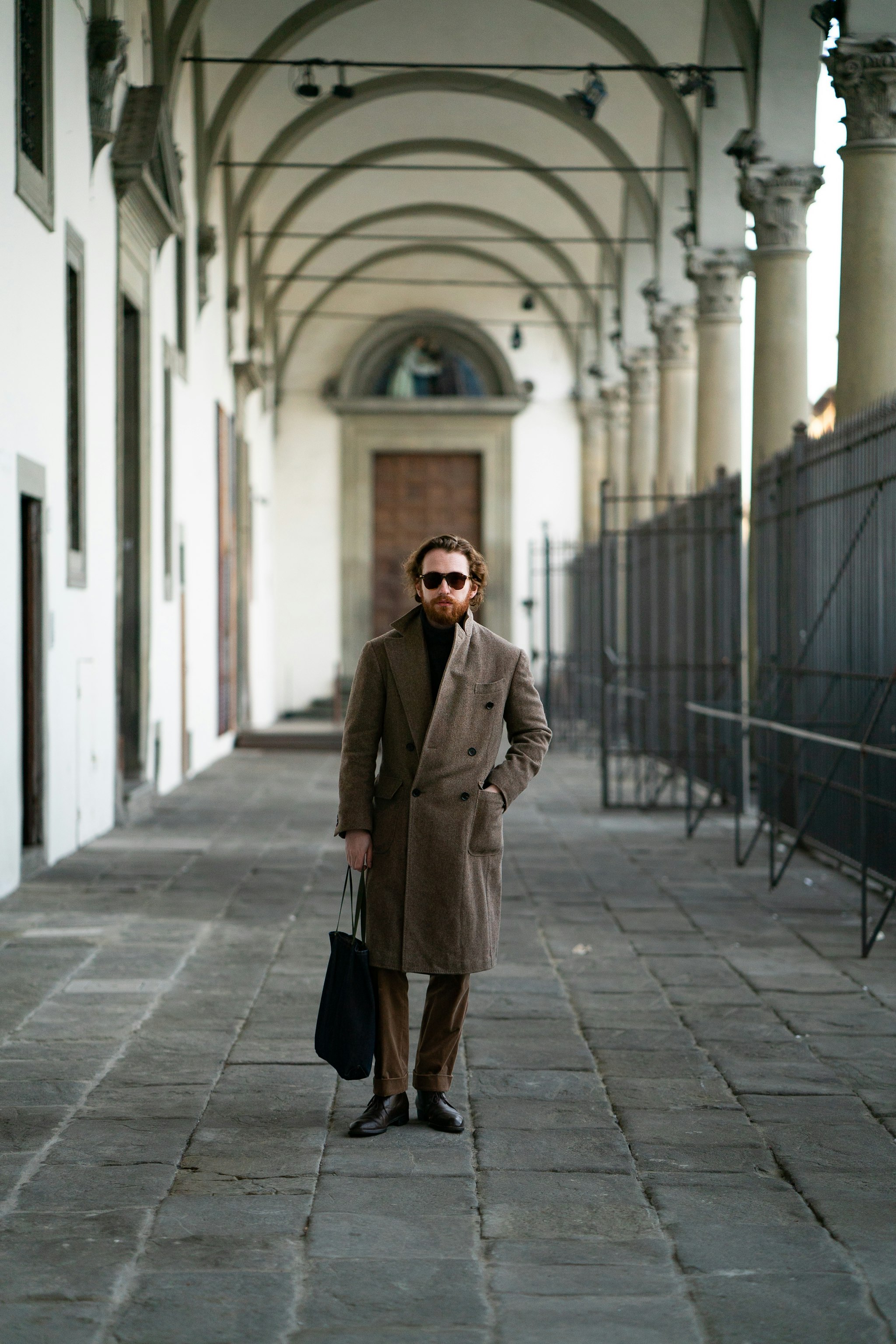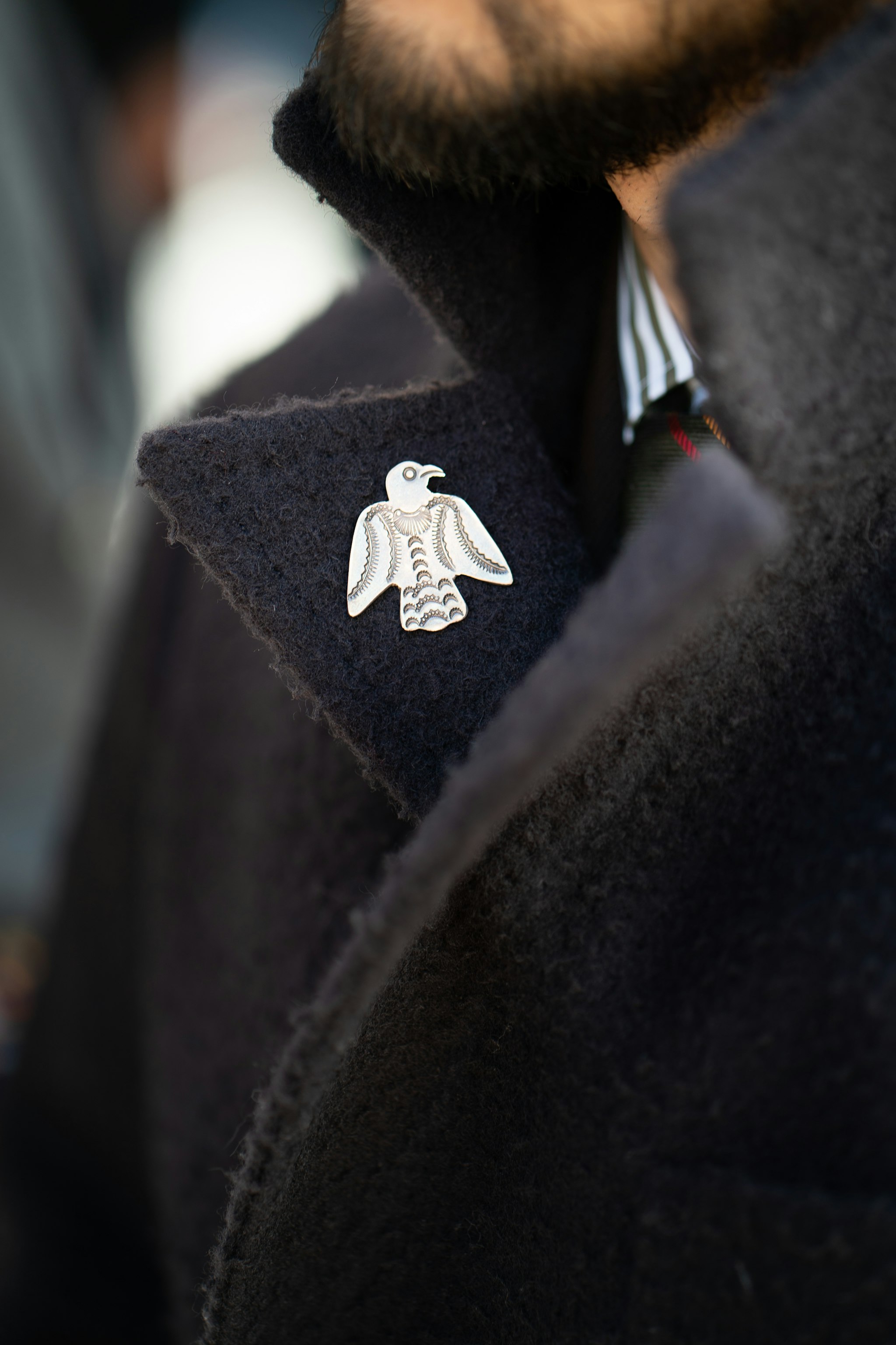 Jan is wearing a bespoke double-breasted suit by Liverano & Liverano in a brown wool twill by Vitale Barberis Canonico paired with a tie by Florentine maker Tie Your Tie. His bespoke Casentino Coat is made by Liverano & Liverano and features a vintage Navajo pin from the 1930's.