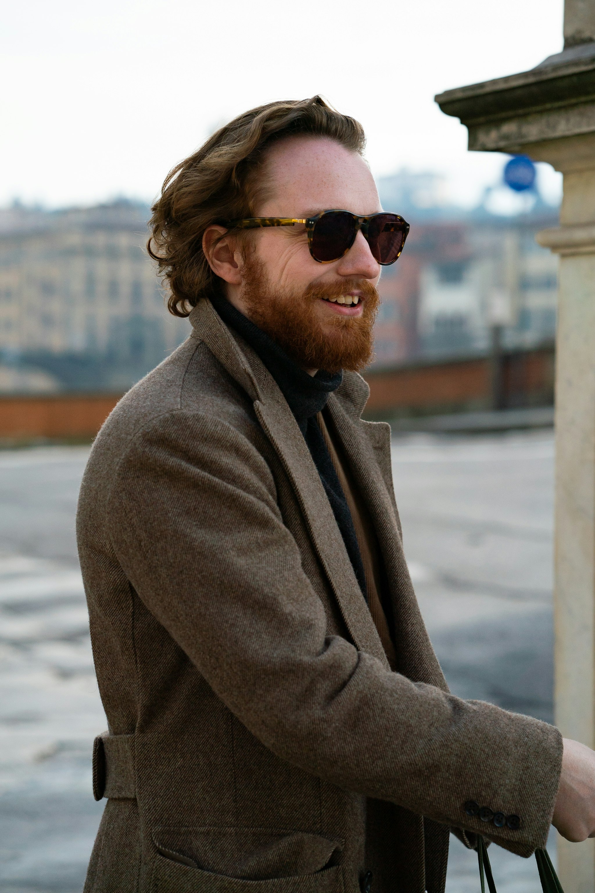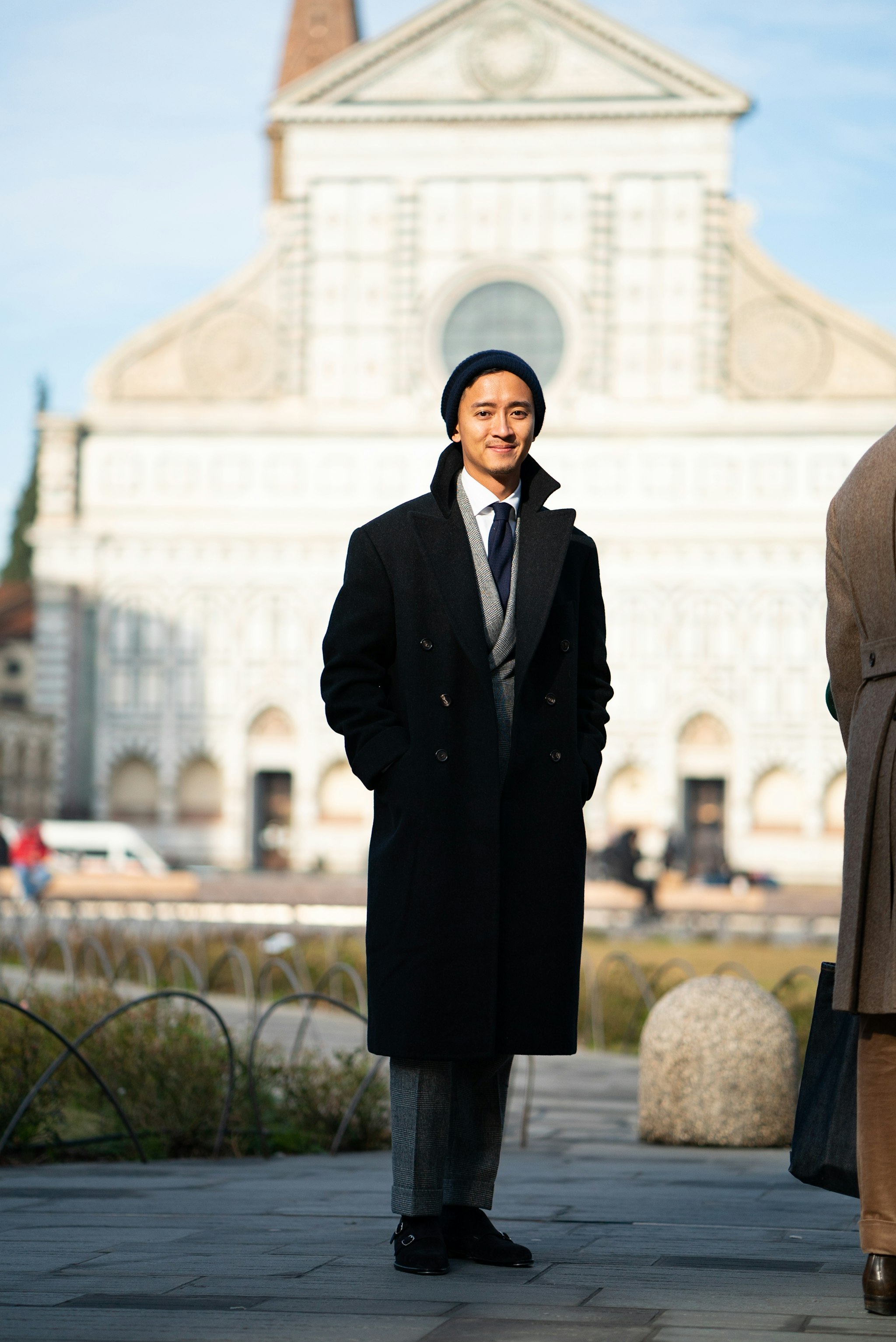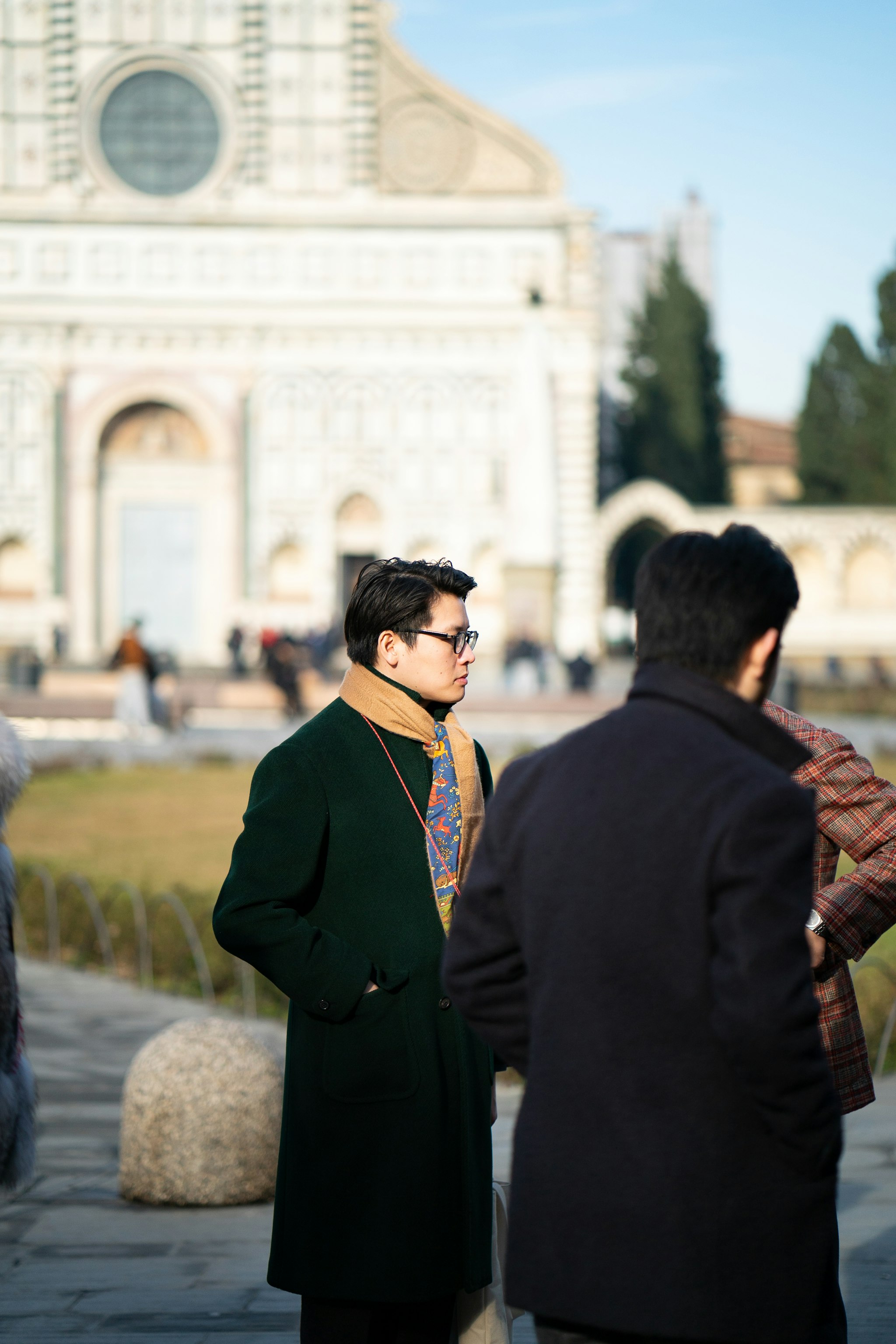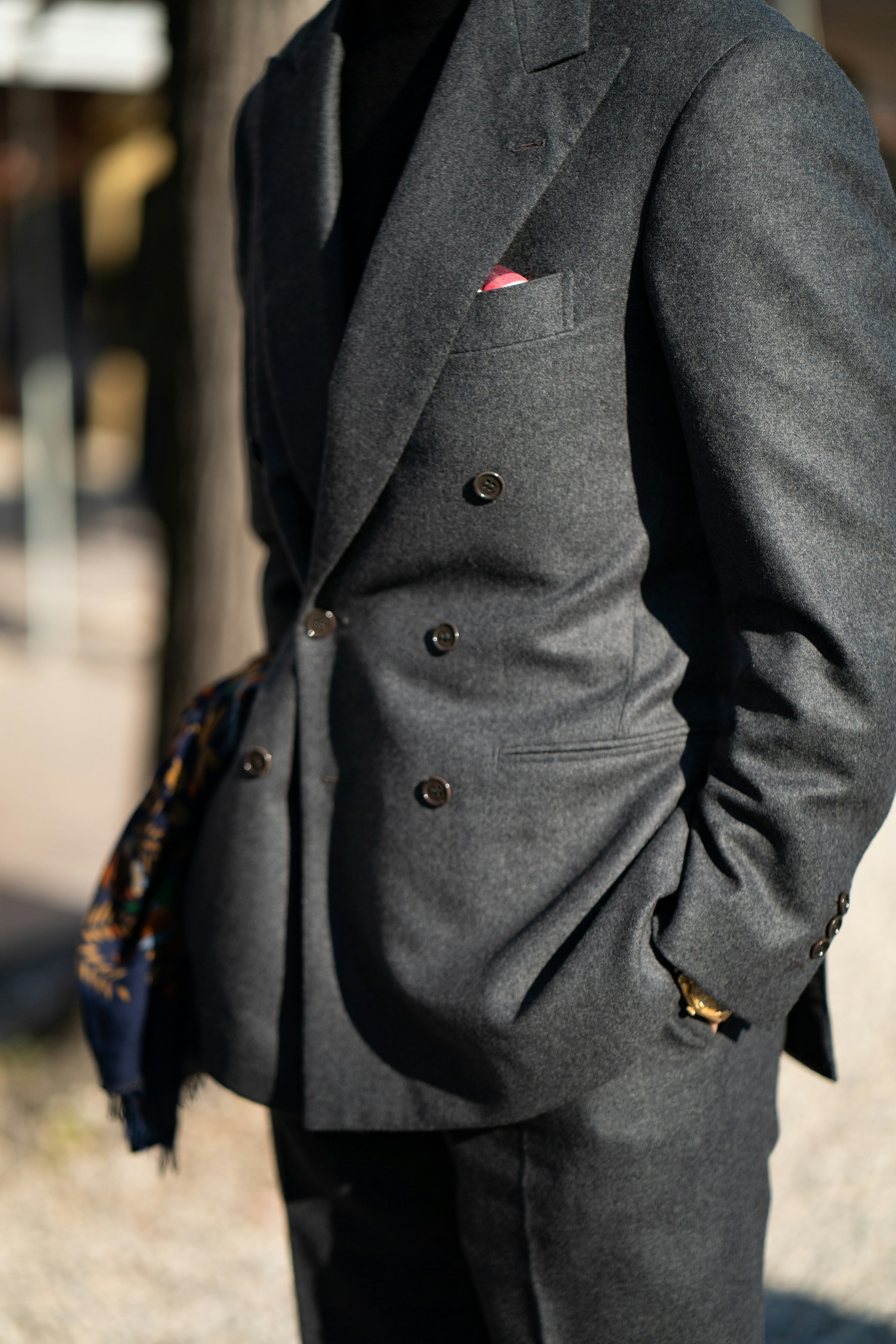 Jan is wearing a bespoke double-breasted suit by Liverano & Liverano in a brown wool twill by Vitale Barberis Canonico paired with a tie by Florentine maker Tie Your Tie. His bespoke Casentino Coat is made by Liverano & Liverano and features a vintage Navajo pin from the 1930's.