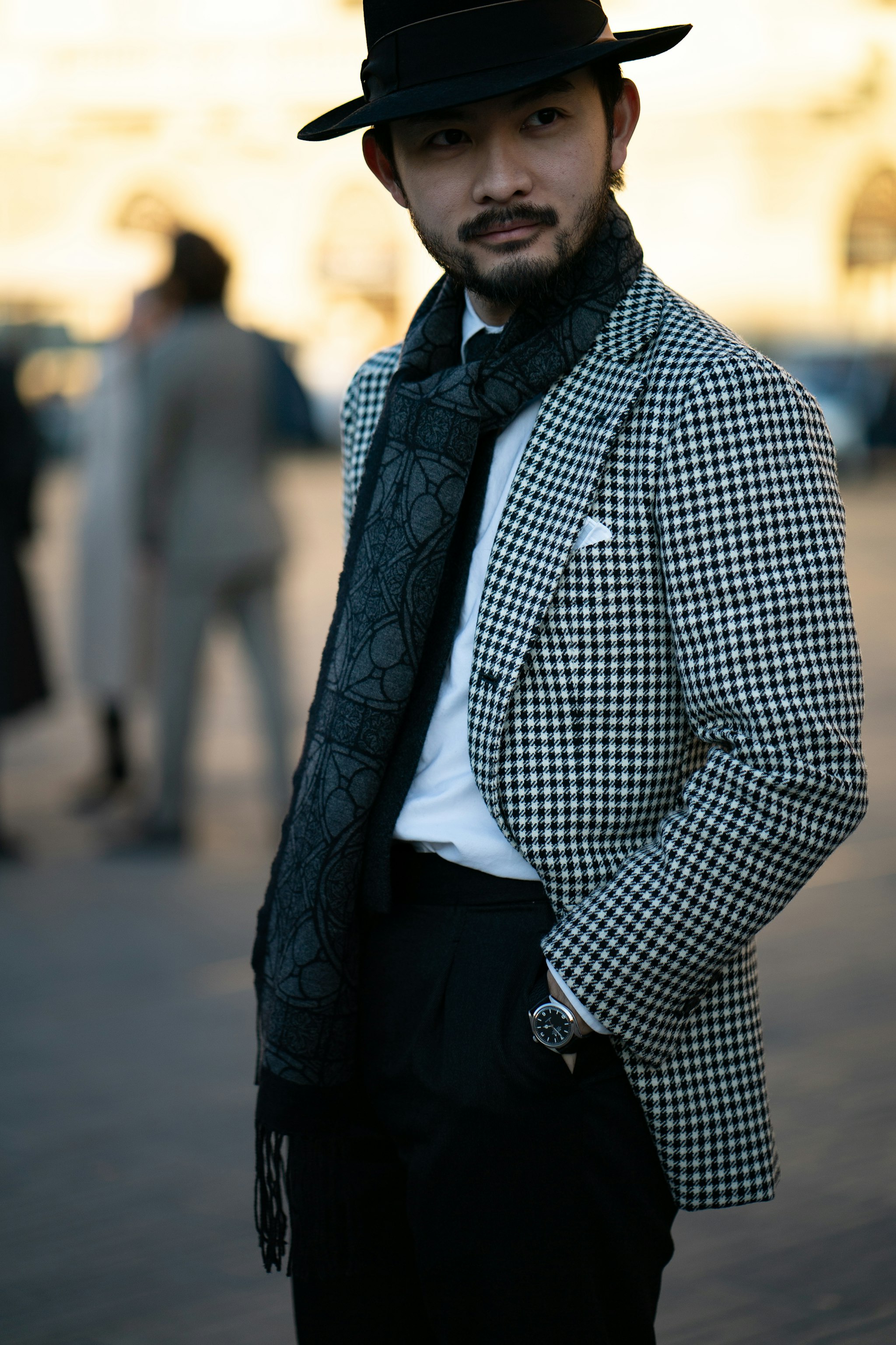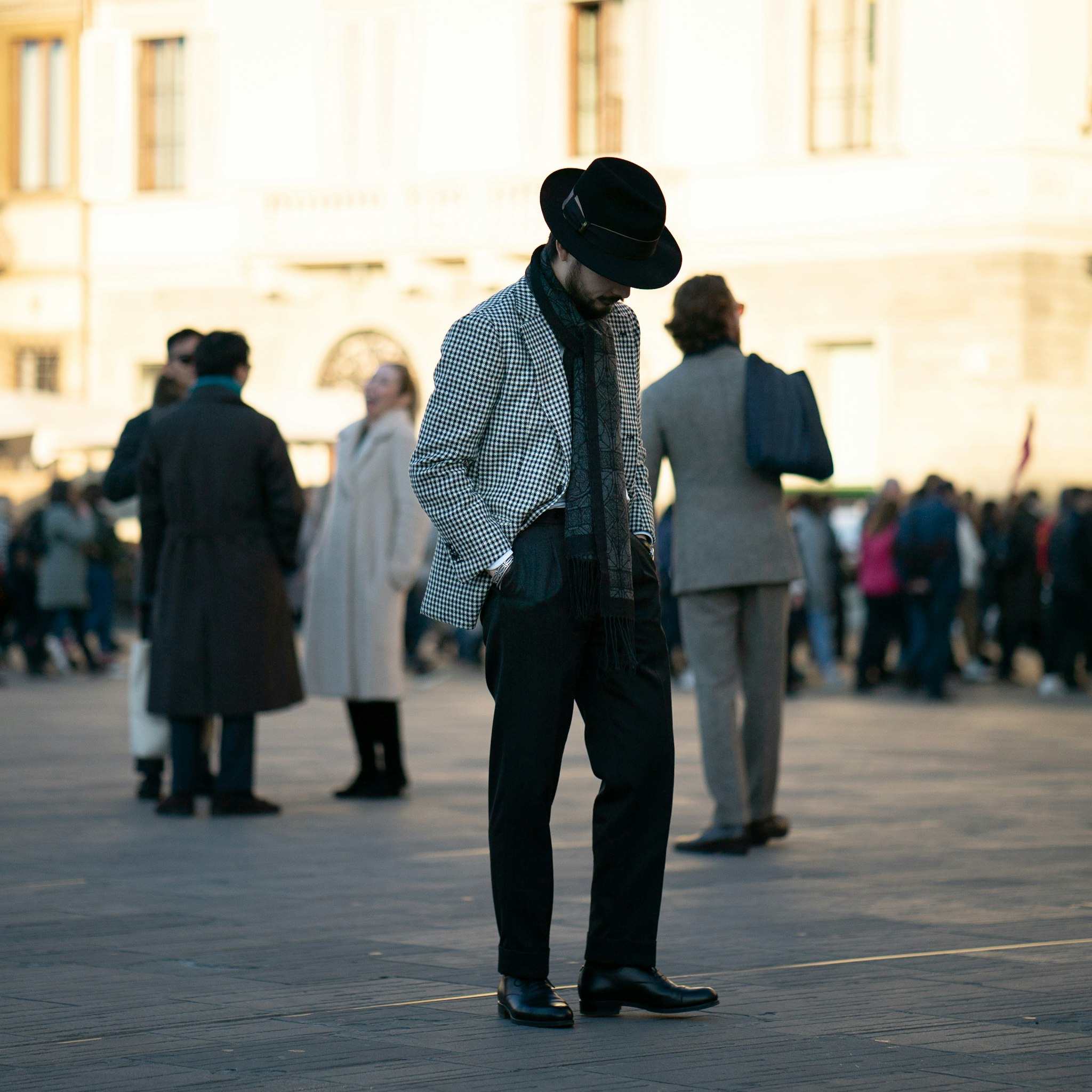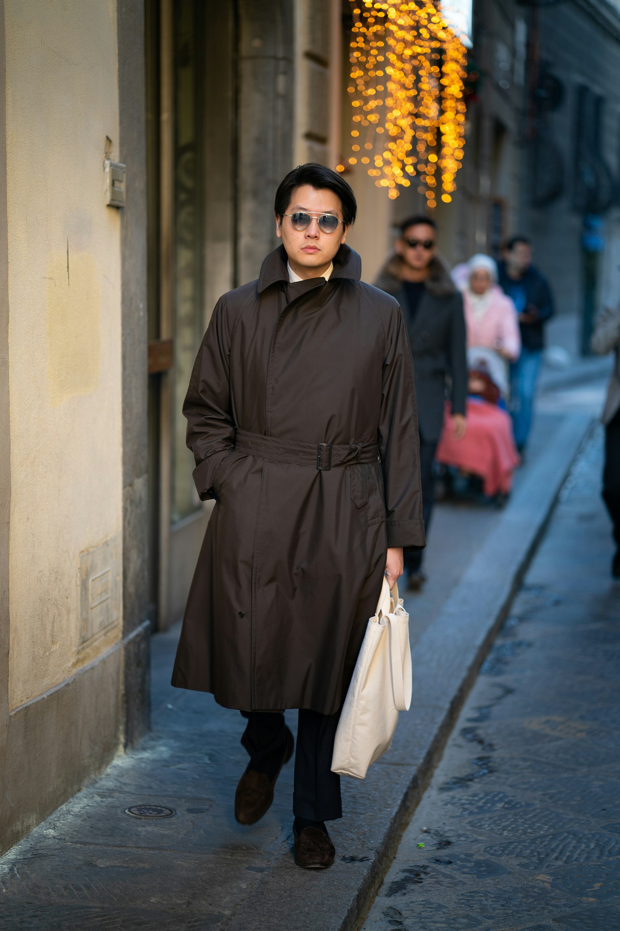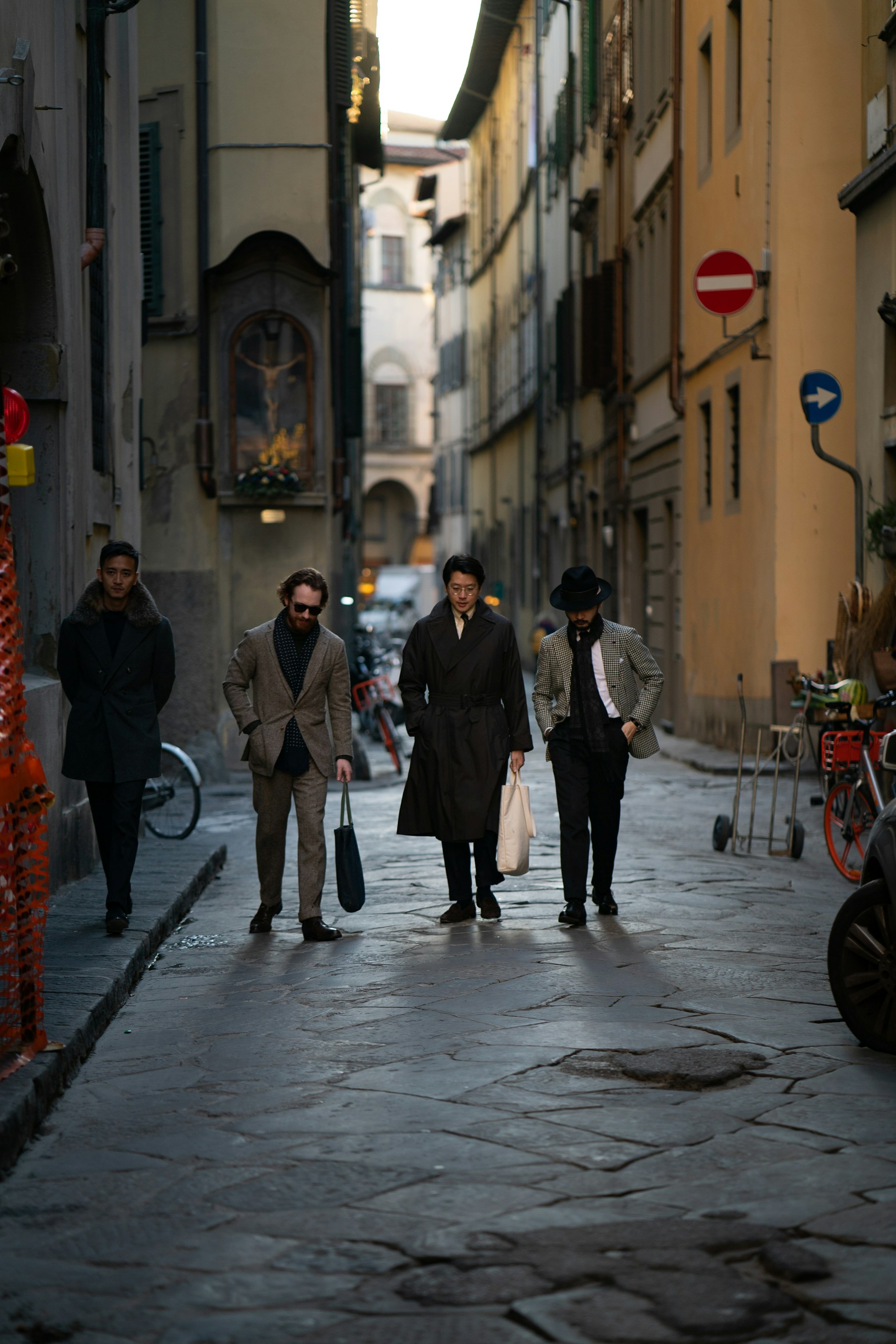 Jan is wearing a bespoke double-breasted suit by Liverano & Liverano in a brown wool twill by Vitale Barberis Canonico paired with a tie by Florentine maker Tie Your Tie. His bespoke Casentino Coat is made by Liverano & Liverano and features a vintage Navajo pin from the 1930's.