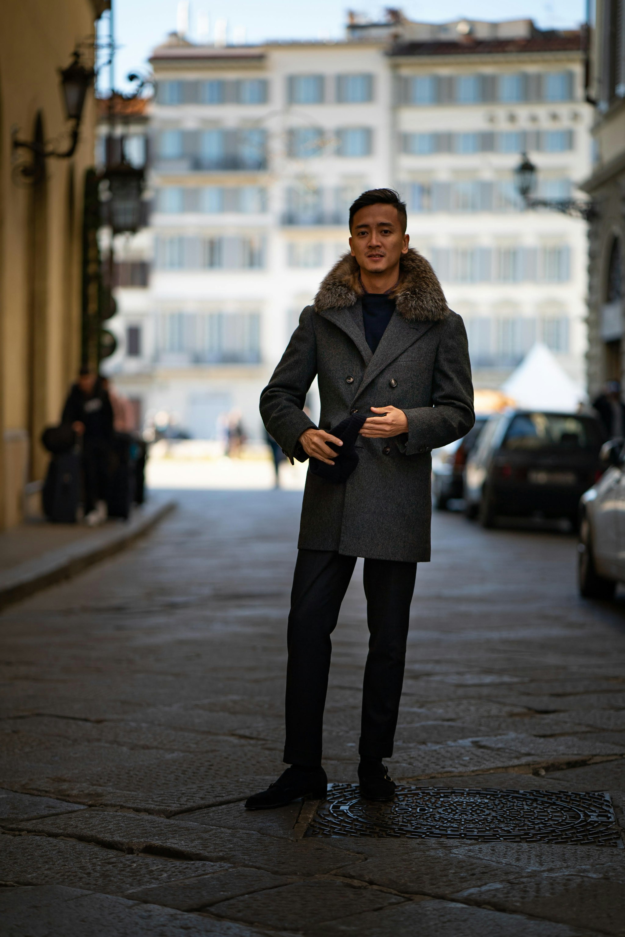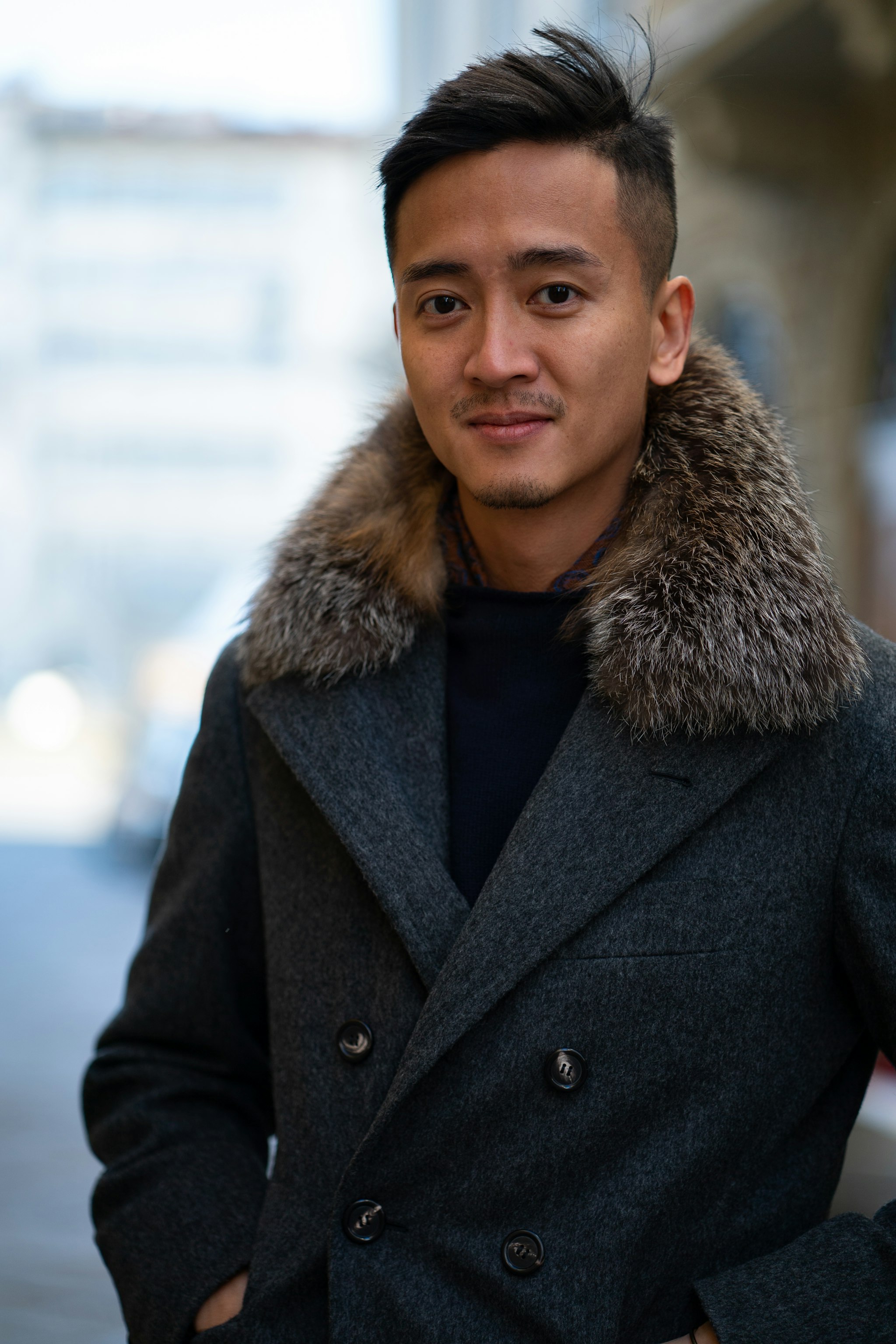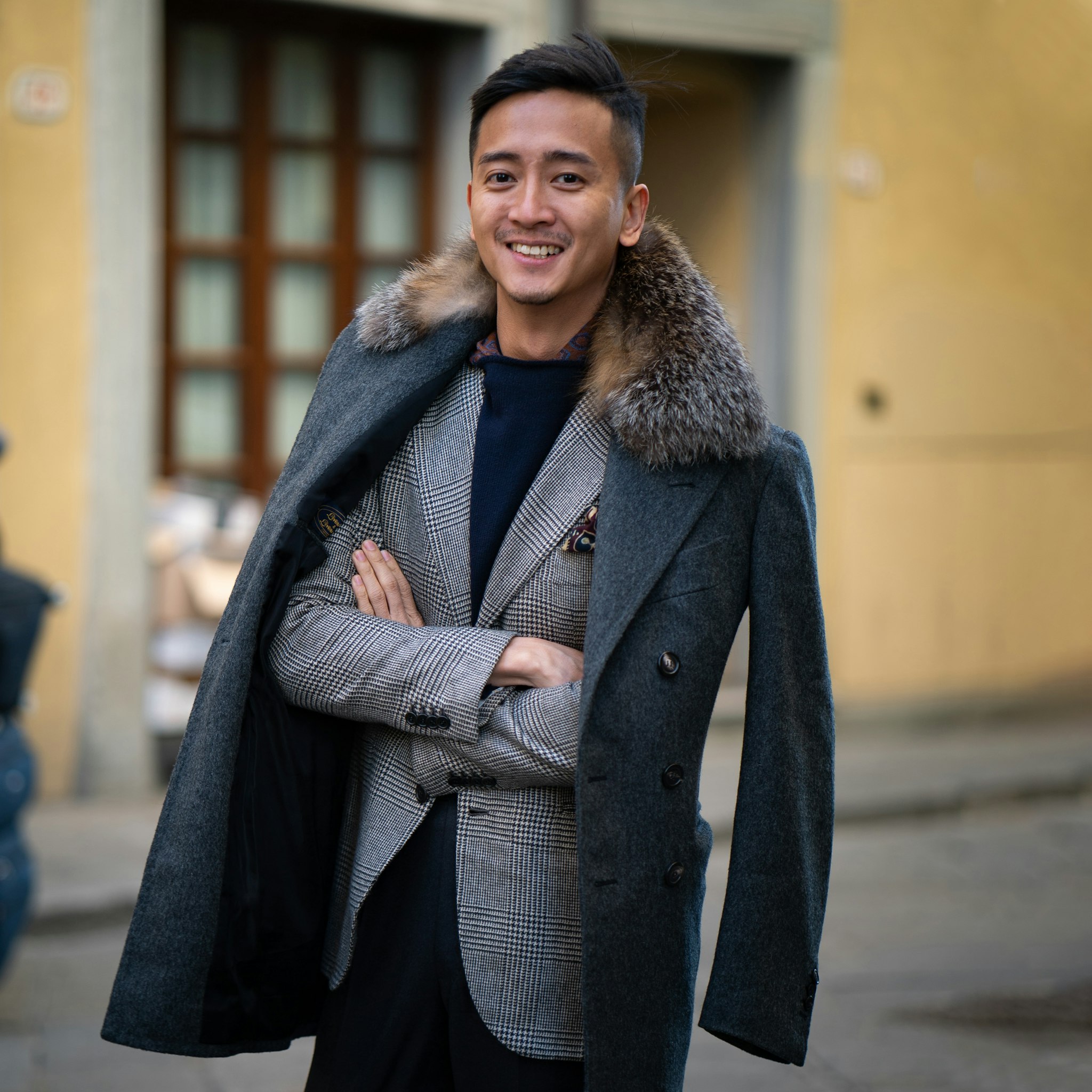Alan is wearing his bespoke peacoat by Liverano & Liverano with fox fur collar. His sport coat is Made-to-Measure by Orazio Luciano in Lancifio Di Pray cashmere, the same cloth we used for our Ready-to-Wear.