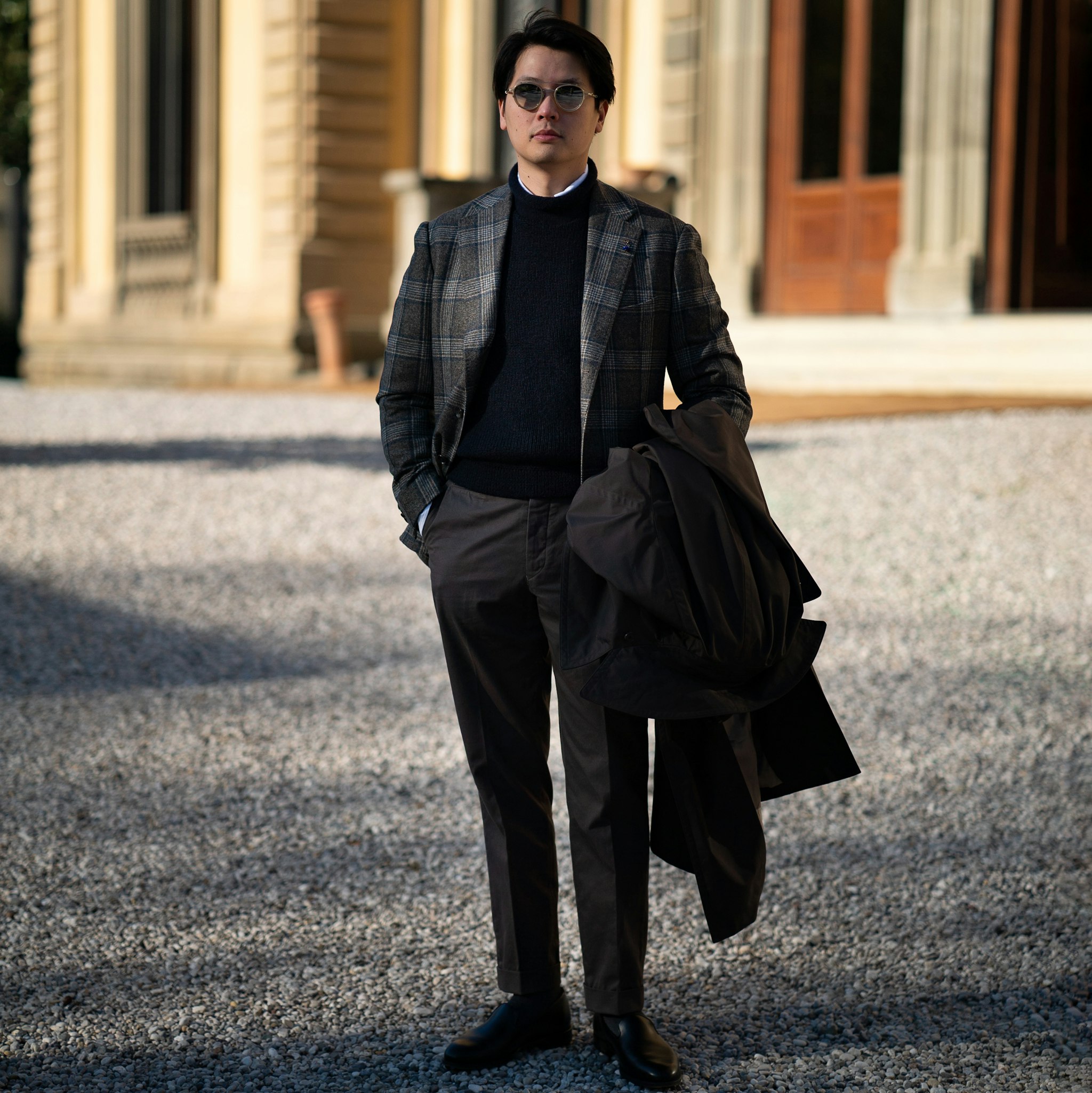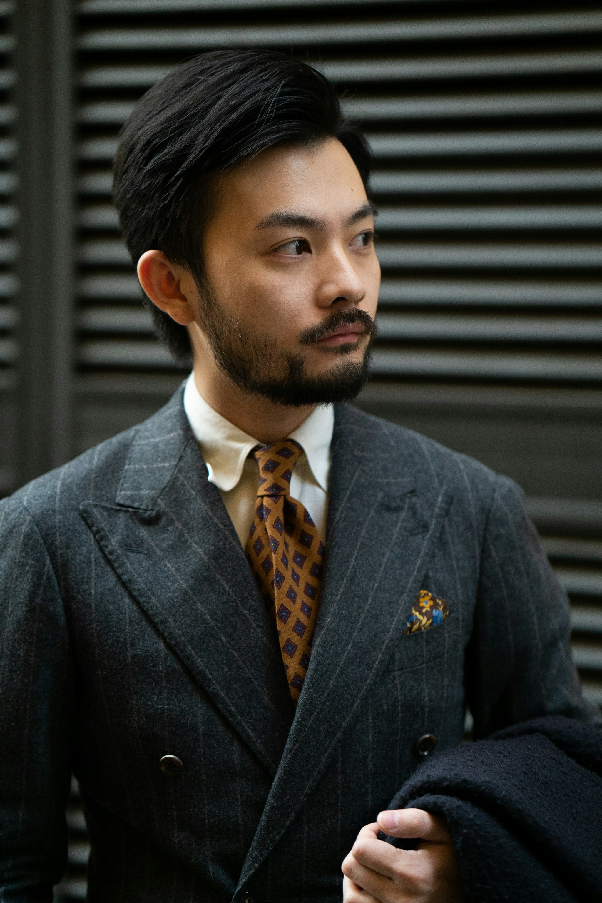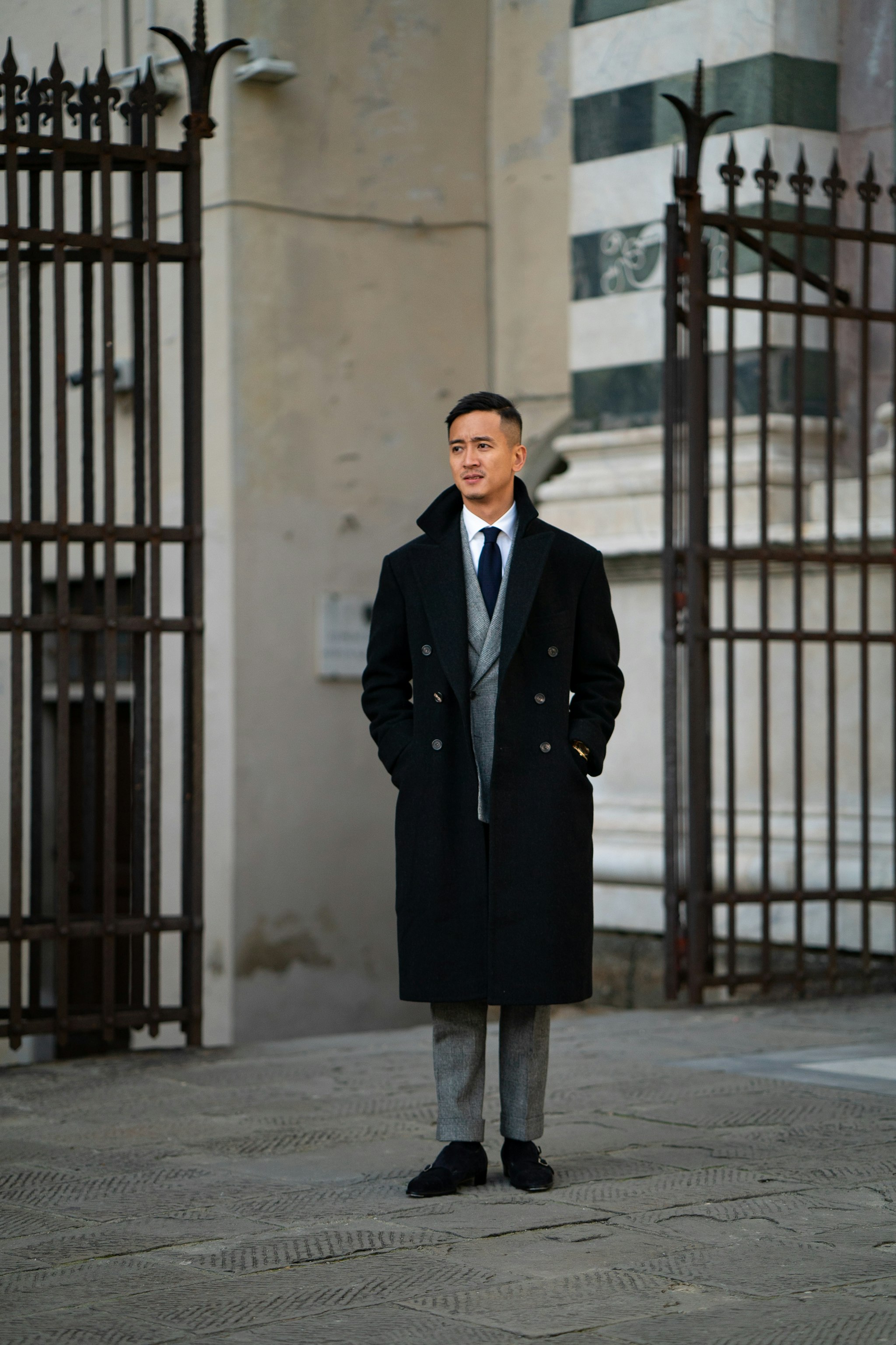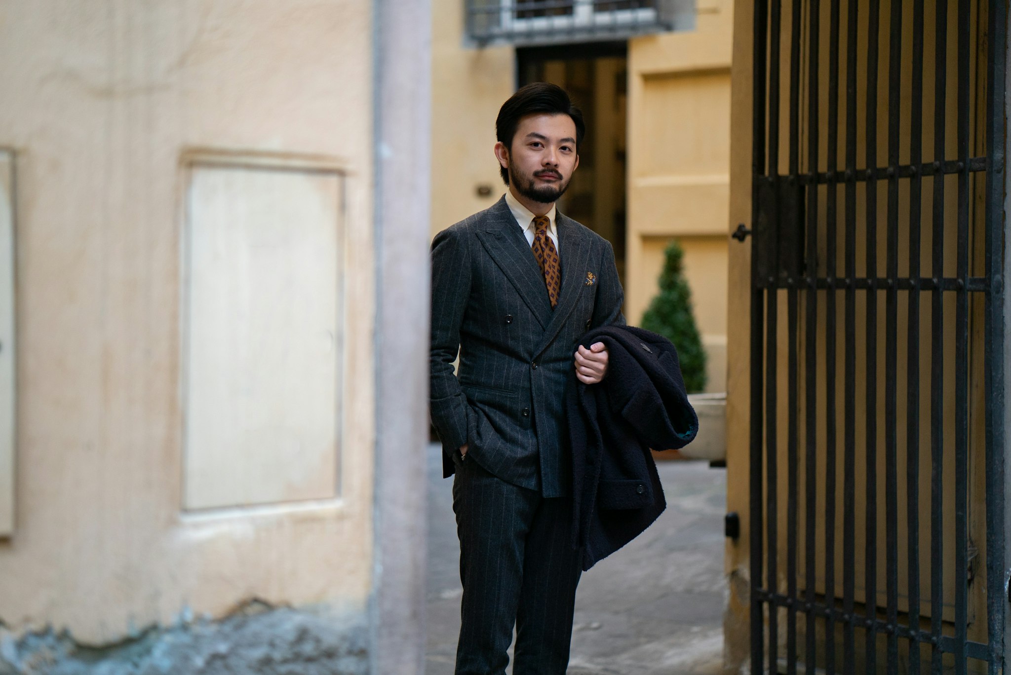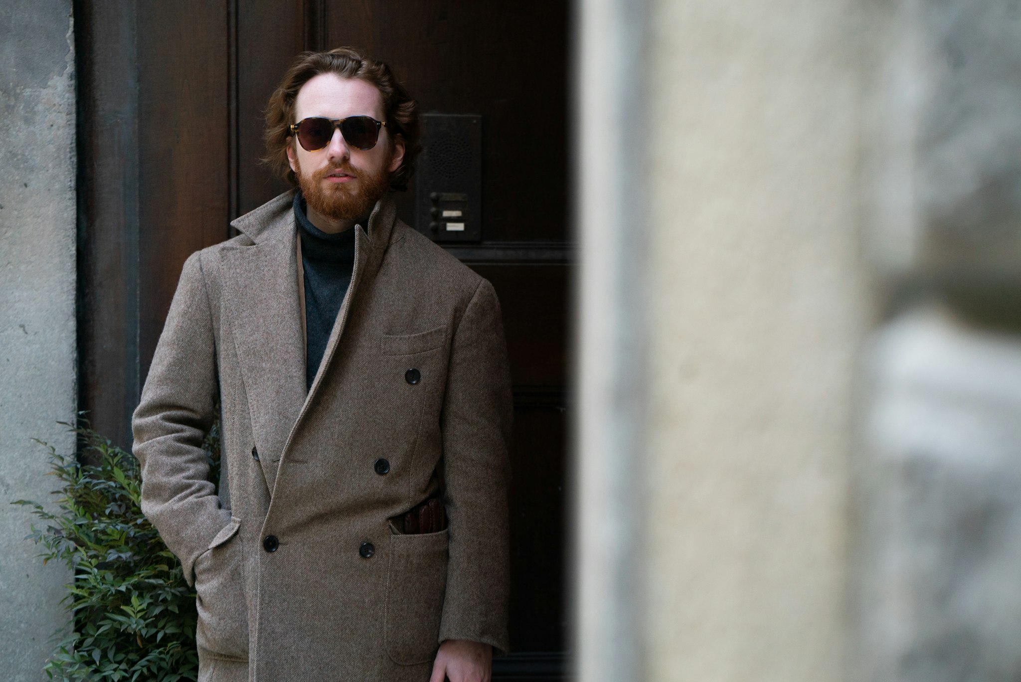Jan is wearing The Armoury by Ring Jacket Model 6 suit, commissioned through our Made-to-Order program in a flannel chalk stripe, paired with a bespoke Casentino coat by Liverano & Liverano.